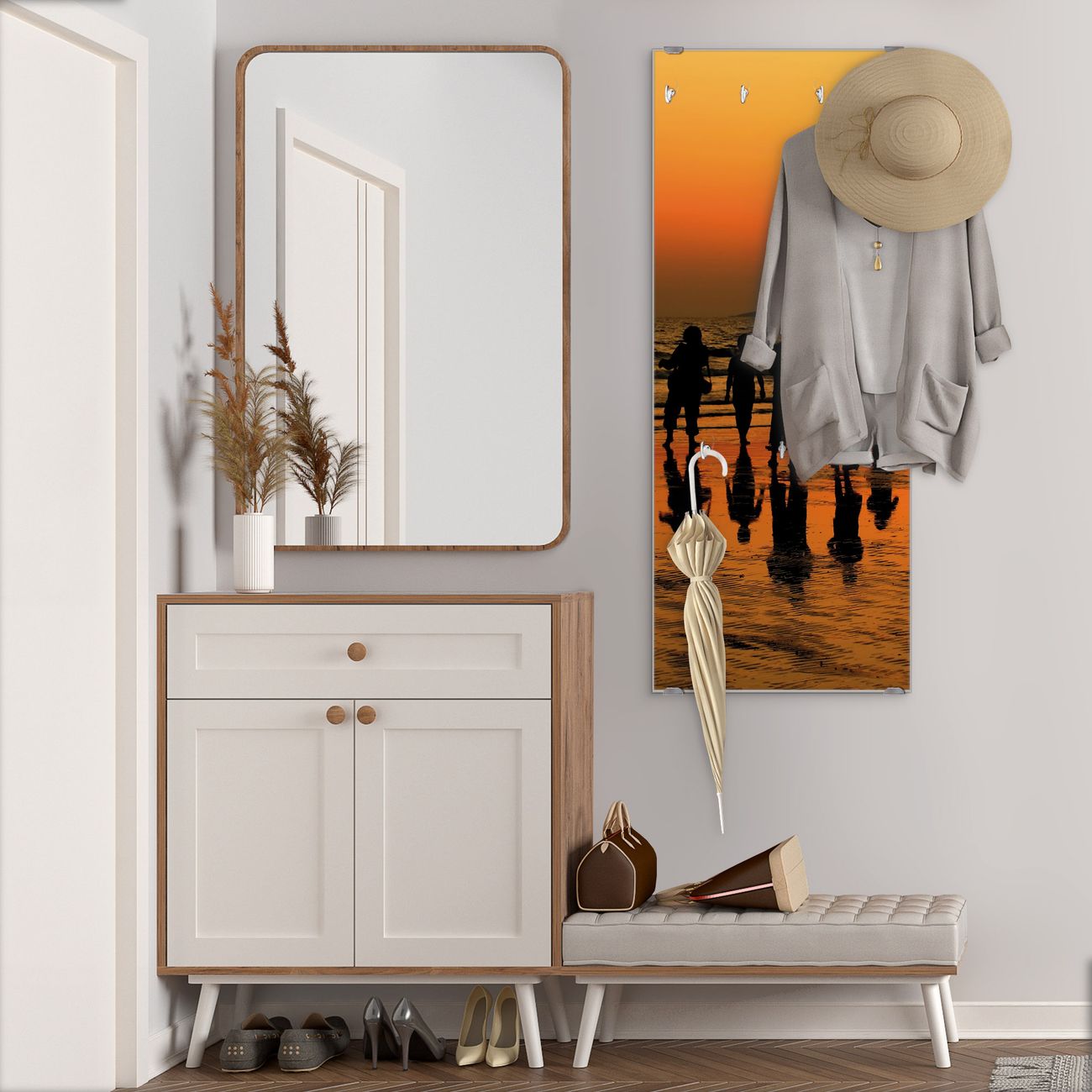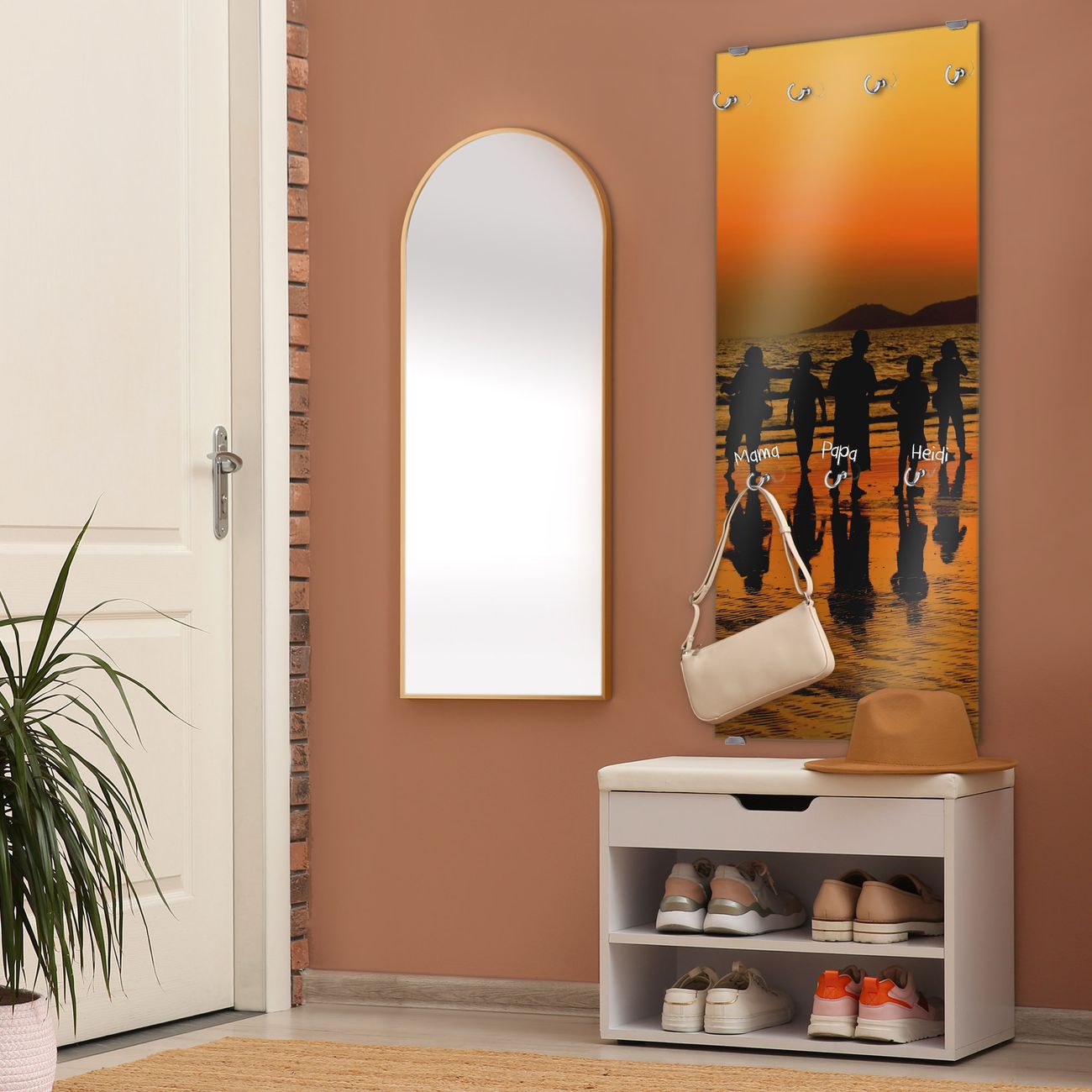 FUNKTION: Die banjado Wandgarderobe mit Motiv Koh Samet Beach ist Ihr täglicher Begleiter. Zuverlässig hängen hier Ihre Jacken und Mäntel griffbereit. Das Echtglas ist Ihr Paneel auch beschreibbar und wieder abwischbar. DESIGN: Sie erhalten eine Garderobenleiste aus elegantem Echtglas mit dem Farbbrillanten Motiv Koh Samet Beach hinterklebt. Das Design ist zeitlos klassisch, ohne dabei auf Funktionalität zu verzichten. Suchen Sie aus einer Vielzahl von Motiven das für Ihre Einrichtung Passende aus. DETAILS: Die Flurgarderobe besteht aus 4mm gehärtetem Sicherheitsglas. Sie ist 50cm breit, 125cm hoch und 6cm tief. Die Garderobenhaken zur Selbstmontage präsentieren sich in Edelstahl-Optik, ebenso die Abstandshalter für die Wandmontage. Ihre neue Garderobe ist sofort einsatzbereit. NUTZEN: Ihre neue Garderobe hält nicht nur zuverlässig Ihre Kleidung, sie ist auch optisch ein Blickfang. Durch das Glas können Sie an der Garderobe mit wasserlöslichen Kreidestiften oder Whiteboard-Markern auch Nachrichten hinterlassen. BANJADO: Wir sind ein kleines kreatives Team aus Sachsen und entwickeln Produkte die Design und Funktionalität verbinden sollen. Viel Freude mit Ihrer neuen Garderobe wünscht das banjado-Team!