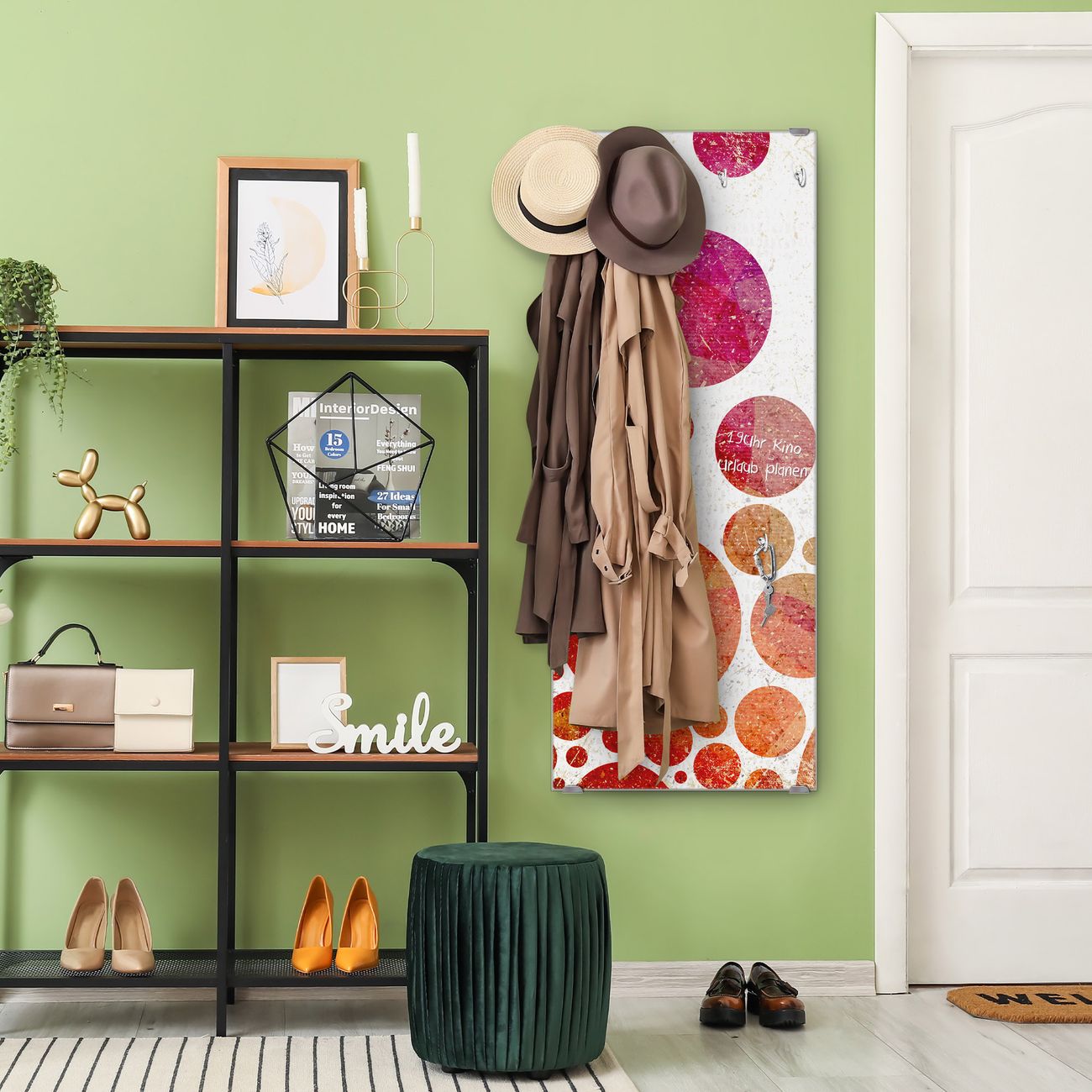 FUNKTION: Die banjado Wandgarderobe mit Motiv Kreise ist Ihr täglicher Begleiter. Zuverlässig hängen hier Ihre Jacken und Mäntel griffbereit. Das Echtglas ist Ihr Paneel auch beschreibbar und wieder abwischbar. DESIGN: Sie erhalten eine Garderobenleiste aus elegantem Echtglas mit dem Farbbrillanten Motiv Kreise hinterklebt. Das Design ist zeitlos klassisch, ohne dabei auf Funktionalität zu verzichten. Suchen Sie aus einer Vielzahl von Motiven das für Ihre Einrichtung Passende aus. DETAILS: Die Flurgarderobe besteht aus 4mm gehärtetem Sicherheitsglas. Sie ist 50cm breit, 125cm hoch und 6cm tief. Die Garderobenhaken zur Selbstmontage präsentieren sich in Edelstahl-Optik, ebenso die Abstandshalter für die Wandmontage. Ihre neue Garderobe ist sofort einsatzbereit. NUTZEN: Ihre neue Garderobe hält nicht nur zuverlässig Ihre Kleidung, sie ist auch optisch ein Blickfang. Durch das Glas können Sie an der Garderobe mit wasserlöslichen Kreidestiften oder Whiteboard-Markern auch Nachrichten hinterlassen. BANJADO: Wir sind ein kleines kreatives Team aus Sachsen und entwickeln Produkte die Design und Funktionalität verbinden sollen. Viel Freude mit Ihrer neuen Garderobe wünscht das banjado-Team!