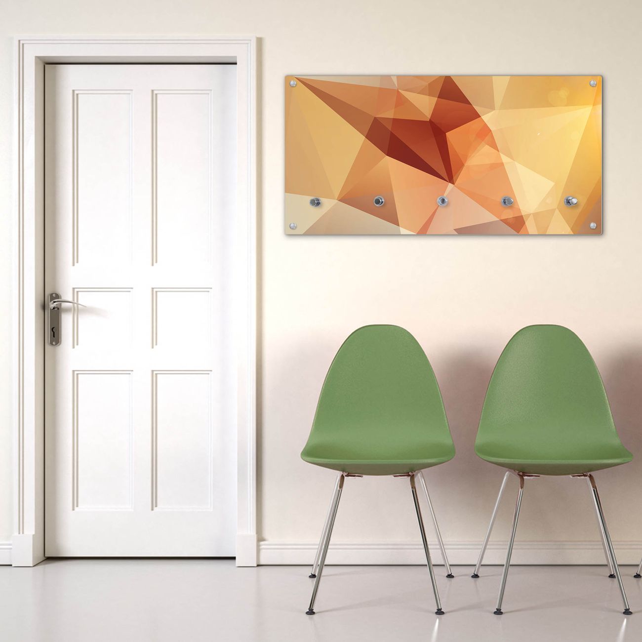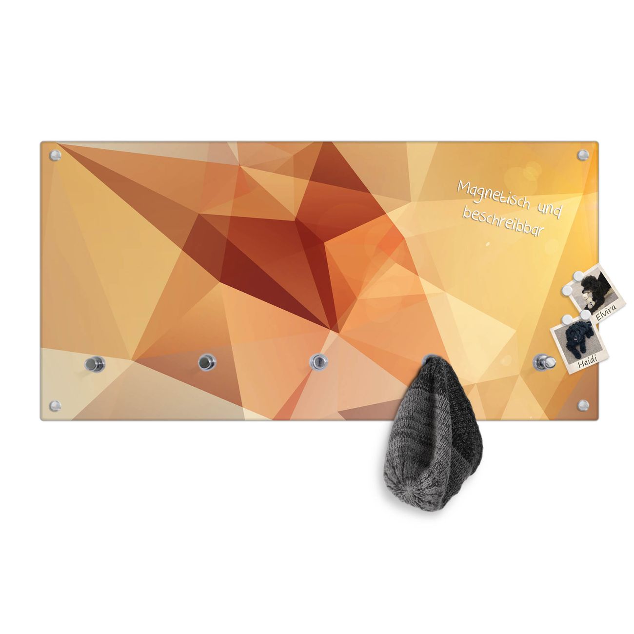 Bitte beachten Sie, dass an dieser Garderobe nur starke Neodym-Magnete halten! FUNKTION: Die banjado Wandgarderobe mit Motiv Kristall ist Ihr täglicher Begleiter. Zuverlässig hängen hier Ihre Jacken und Mäntel griffbereit. Gleichzeitig ist die Design Garderobe magnetisch, Sie können Notizen anheften und durch das Echtglas ist Ihr Paneel auch beschreibbar und wieder abwischbar. DESIGN: Sie erhalten eine Garderobenleiste aus elegantem Echtglas mit dem Farbbrillanten Motiv Kristall hinterklebt. Das Design ist zeitlos klassisch, ohne dabei auf Funktionalität zu verzichten. Suchen Sie aus einer Vielzahl von Motiven das für Ihre Einrichtung Passende aus. DETAILS: Die Flurgarderobe besteht aus 4mm gehärtetem Sicherheitsglas. Sie ist 80cm breit, 40cm hoch und 6cm tief. Die Garderobenhaken zur Selbstmontage präsentieren sich in Edelstahl-Optik, ebenso die Abstandshalter für die Wandmontage. Ihre neue Garderobe ist sofort einsatzbereit. NUTZEN: Ihre neue Garderobe hält nicht nur zuverlässig Ihre Kleidung, sie ist auch optisch ein Blickfang. Durch die magnetische Wirkung können Sie mit 4 beigefügten extrastarken Neodym-Magneten Notizen anheften und mit wasserlöslichen Kreidestiften oder Whiteboard-Markern auch Nachrichten hinterlassen. BANJADO: Wir sind ein kleines kreatives Team aus Sachsen und entwickeln Produkte die Design und Funktionalität verbinden sollen. Viel Freude mit Ihrer neuen Garderobe wünscht das banjado-Team!