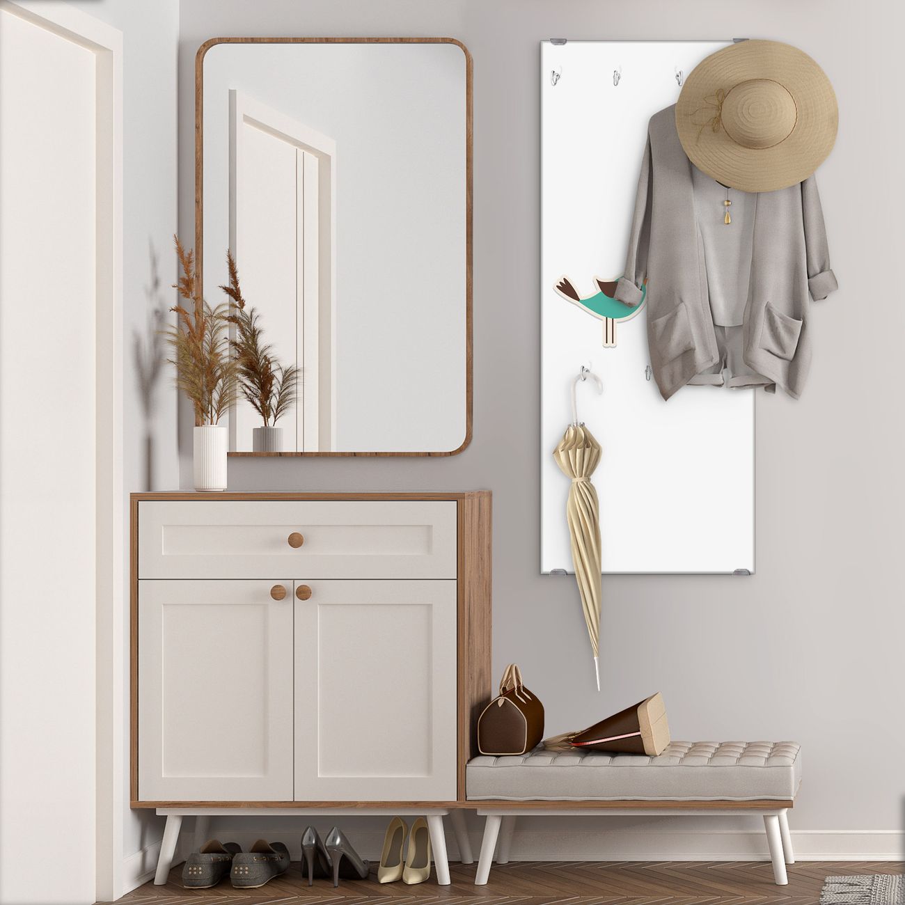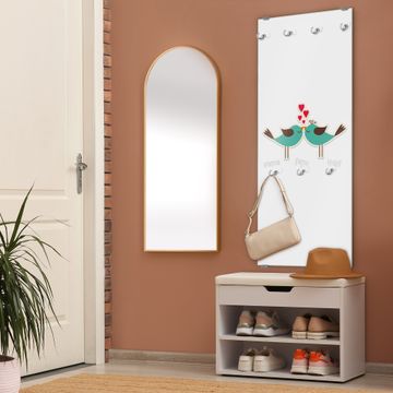 FUNKTION: Die banjado Wandgarderobe mit Motiv Küsschen ist Ihr täglicher Begleiter. Zuverlässig hängen hier Ihre Jacken und Mäntel griffbereit. Das Echtglas ist Ihr Paneel auch beschreibbar und wieder abwischbar. DESIGN: Sie erhalten eine Garderobenleiste aus elegantem Echtglas mit dem Farbbrillanten Motiv Küsschen hinterklebt. Das Design ist zeitlos klassisch, ohne dabei auf Funktionalität zu verzichten. Suchen Sie aus einer Vielzahl von Motiven das für Ihre Einrichtung Passende aus. DETAILS: Die Flurgarderobe besteht aus 4mm gehärtetem Sicherheitsglas. Sie ist 50cm breit, 125cm hoch und 6cm tief. Die Garderobenhaken zur Selbstmontage präsentieren sich in Edelstahl-Optik, ebenso die Abstandshalter für die Wandmontage. Ihre neue Garderobe ist sofort einsatzbereit. NUTZEN: Ihre neue Garderobe hält nicht nur zuverlässig Ihre Kleidung, sie ist auch optisch ein Blickfang. Durch das Glas können Sie an der Garderobe mit wasserlöslichen Kreidestiften oder Whiteboard-Markern auch Nachrichten hinterlassen. BANJADO: Wir sind ein kleines kreatives Team aus Sachsen und entwickeln Produkte die Design und Funktionalität verbinden sollen. Viel Freude mit Ihrer neuen Garderobe wünscht das banjado-Team!