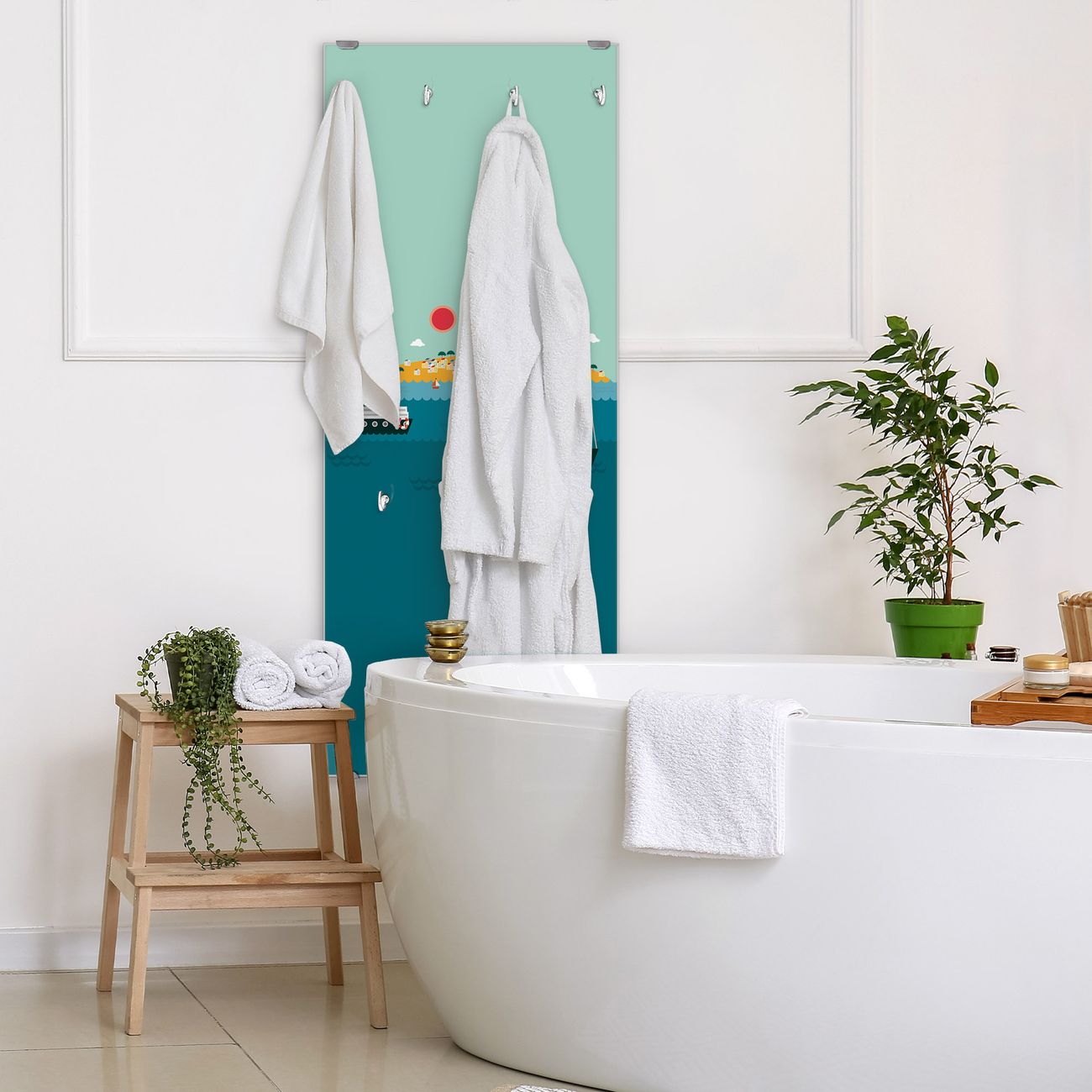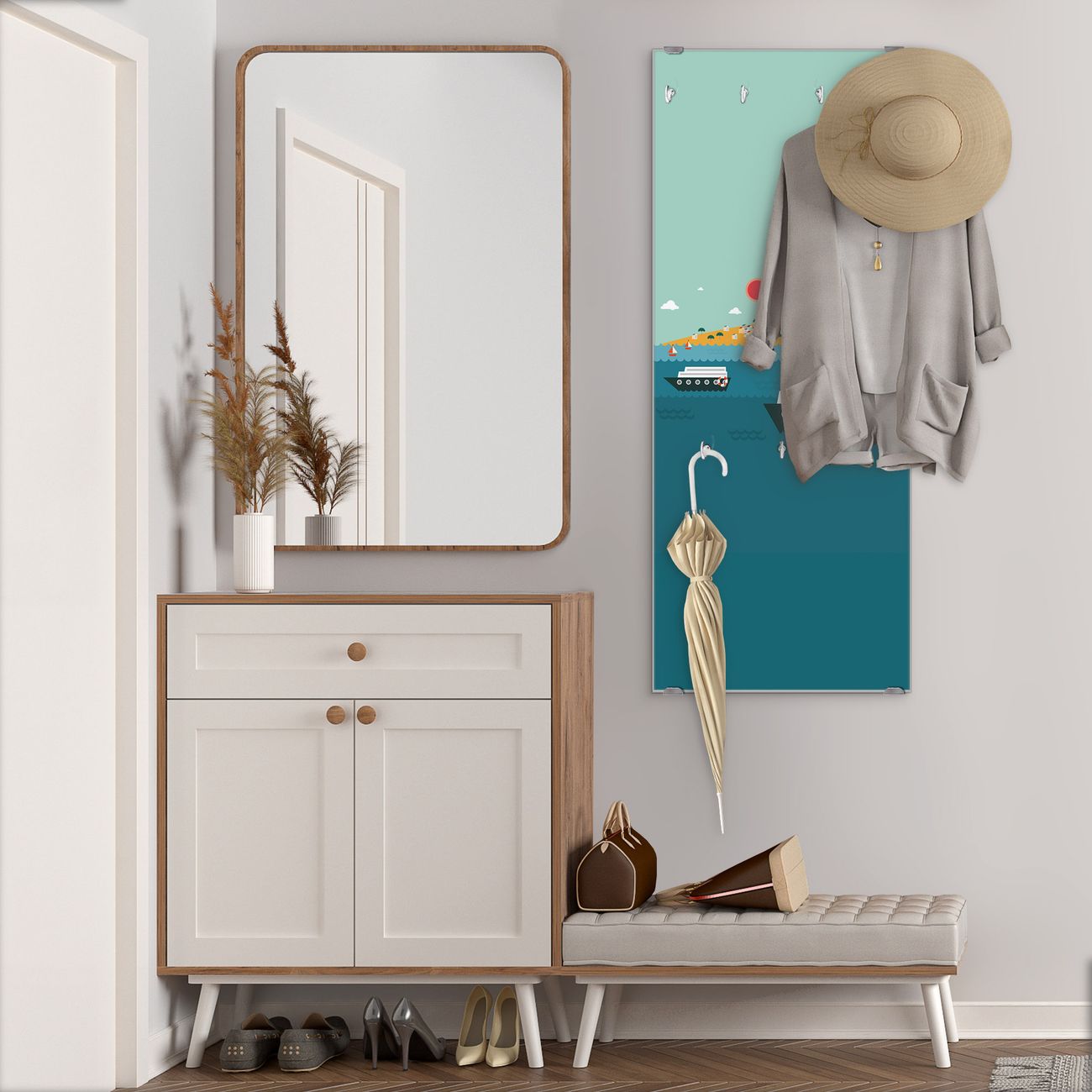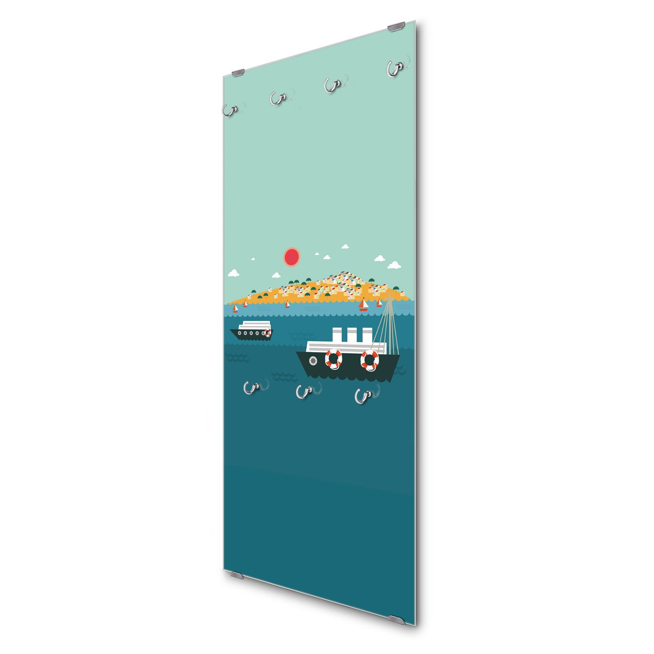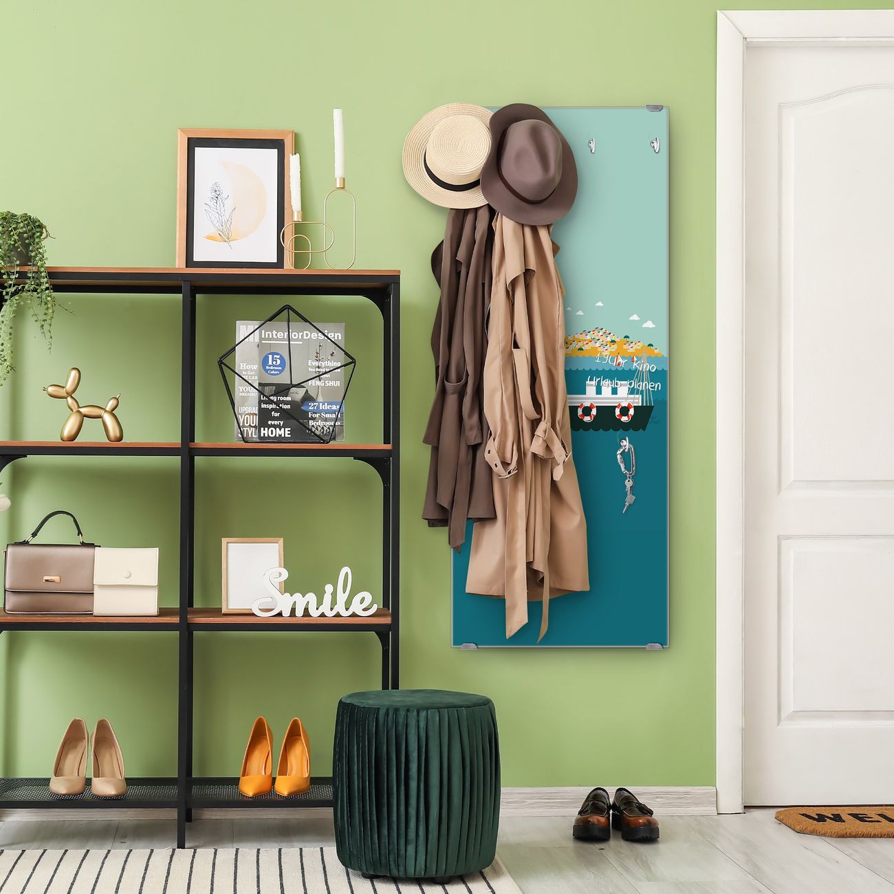 FUNKTION: Die banjado Wandgarderobe mit Motiv Land in Sicht ist Ihr täglicher Begleiter. Zuverlässig hängen hier Ihre Jacken und Mäntel griffbereit. Das Echtglas ist Ihr Paneel auch beschreibbar und wieder abwischbar. DESIGN: Sie erhalten eine Garderobenleiste aus elegantem Echtglas mit dem Farbbrillanten Motiv Land in Sicht hinterklebt. Das Design ist zeitlos klassisch, ohne dabei auf Funktionalität zu verzichten. Suchen Sie aus einer Vielzahl von Motiven das für Ihre Einrichtung Passende aus. DETAILS: Die Flurgarderobe besteht aus 4mm gehärtetem Sicherheitsglas. Sie ist 50cm breit, 125cm hoch und 6cm tief. Die Garderobenhaken zur Selbstmontage präsentieren sich in Edelstahl-Optik, ebenso die Abstandshalter für die Wandmontage. Ihre neue Garderobe ist sofort einsatzbereit. NUTZEN: Ihre neue Garderobe hält nicht nur zuverlässig Ihre Kleidung, sie ist auch optisch ein Blickfang. Durch das Glas können Sie an der Garderobe mit wasserlöslichen Kreidestiften oder Whiteboard-Markern auch Nachrichten hinterlassen. BANJADO: Wir sind ein kleines kreatives Team aus Sachsen und entwickeln Produkte die Design und Funktionalität verbinden sollen. Viel Freude mit Ihrer neuen Garderobe wünscht das banjado-Team!