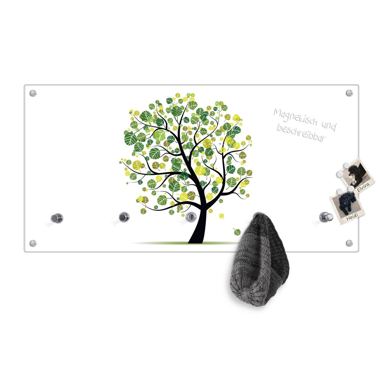 Bitte beachten Sie, dass an dieser Garderobe nur starke Neodym-Magnete halten! FUNKTION: Die banjado Wandgarderobe mit Motiv Laubzauberbaum ist Ihr täglicher Begleiter. Zuverlässig hängen hier Ihre Jacken und Mäntel griffbereit. Gleichzeitig ist die Design Garderobe magnetisch, Sie können Notizen anheften und durch das Echtglas ist Ihr Paneel auch beschreibbar und wieder abwischbar. DESIGN: Sie erhalten eine Garderobenleiste aus elegantem Echtglas mit dem Farbbrillanten Motiv Laubzauberbaum hinterklebt. Das Design ist zeitlos klassisch, ohne dabei auf Funktionalität zu verzichten. Suchen Sie aus einer Vielzahl von Motiven das für Ihre Einrichtung Passende aus. DETAILS: Die Flurgarderobe besteht aus 4mm gehärtetem Sicherheitsglas. Sie ist 80cm breit, 40cm hoch und 6cm tief. Die Garderobenhaken zur Selbstmontage präsentieren sich in Edelstahl-Optik, ebenso die Abstandshalter für die Wandmontage. Ihre neue Garderobe ist sofort einsatzbereit. NUTZEN: Ihre neue Garderobe hält nicht nur zuverlässig Ihre Kleidung, sie ist auch optisch ein Blickfang. Durch die magnetische Wirkung können Sie mit 4 beigefügten extrastarken Neodym-Magneten Notizen anheften und mit wasserlöslichen Kreidestiften oder Whiteboard-Markern auch Nachrichten hinterlassen. BANJADO: Wir sind ein kleines kreatives Team aus Sachsen und entwickeln Produkte die Design und Funktionalität verbinden sollen. Viel Freude mit Ihrer neuen Garderobe wünscht das banjado-Team!