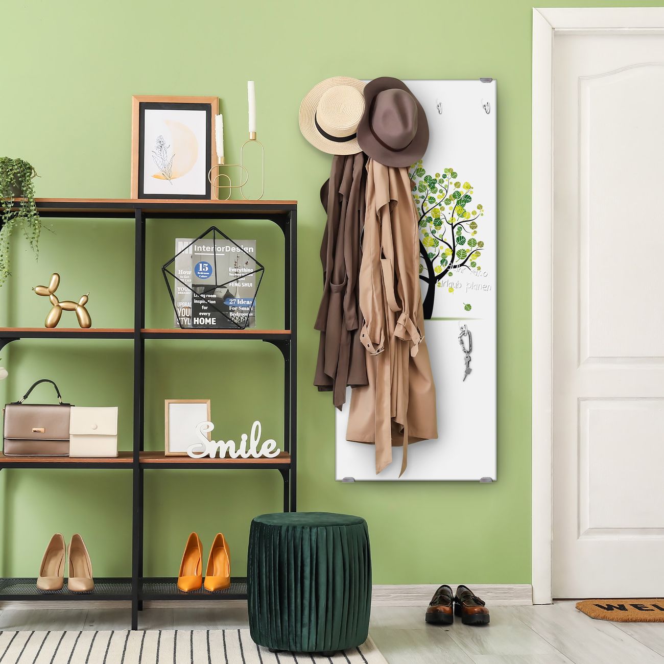 FUNKTION: Die banjado Wandgarderobe mit Motiv Laubzauberbaum ist Ihr täglicher Begleiter. Zuverlässig hängen hier Ihre Jacken und Mäntel griffbereit. Das Echtglas ist Ihr Paneel auch beschreibbar und wieder abwischbar. DESIGN: Sie erhalten eine Garderobenleiste aus elegantem Echtglas mit dem Farbbrillanten Motiv Laubzauberbaum hinterklebt. Das Design ist zeitlos klassisch, ohne dabei auf Funktionalität zu verzichten. Suchen Sie aus einer Vielzahl von Motiven das für Ihre Einrichtung Passende aus. DETAILS: Die Flurgarderobe besteht aus 4mm gehärtetem Sicherheitsglas. Sie ist 50cm breit, 125cm hoch und 6cm tief. Die Garderobenhaken zur Selbstmontage präsentieren sich in Edelstahl-Optik, ebenso die Abstandshalter für die Wandmontage. Ihre neue Garderobe ist sofort einsatzbereit. NUTZEN: Ihre neue Garderobe hält nicht nur zuverlässig Ihre Kleidung, sie ist auch optisch ein Blickfang. Durch das Glas können Sie an der Garderobe mit wasserlöslichen Kreidestiften oder Whiteboard-Markern auch Nachrichten hinterlassen. BANJADO: Wir sind ein kleines kreatives Team aus Sachsen und entwickeln Produkte die Design und Funktionalität verbinden sollen. Viel Freude mit Ihrer neuen Garderobe wünscht das banjado-Team!