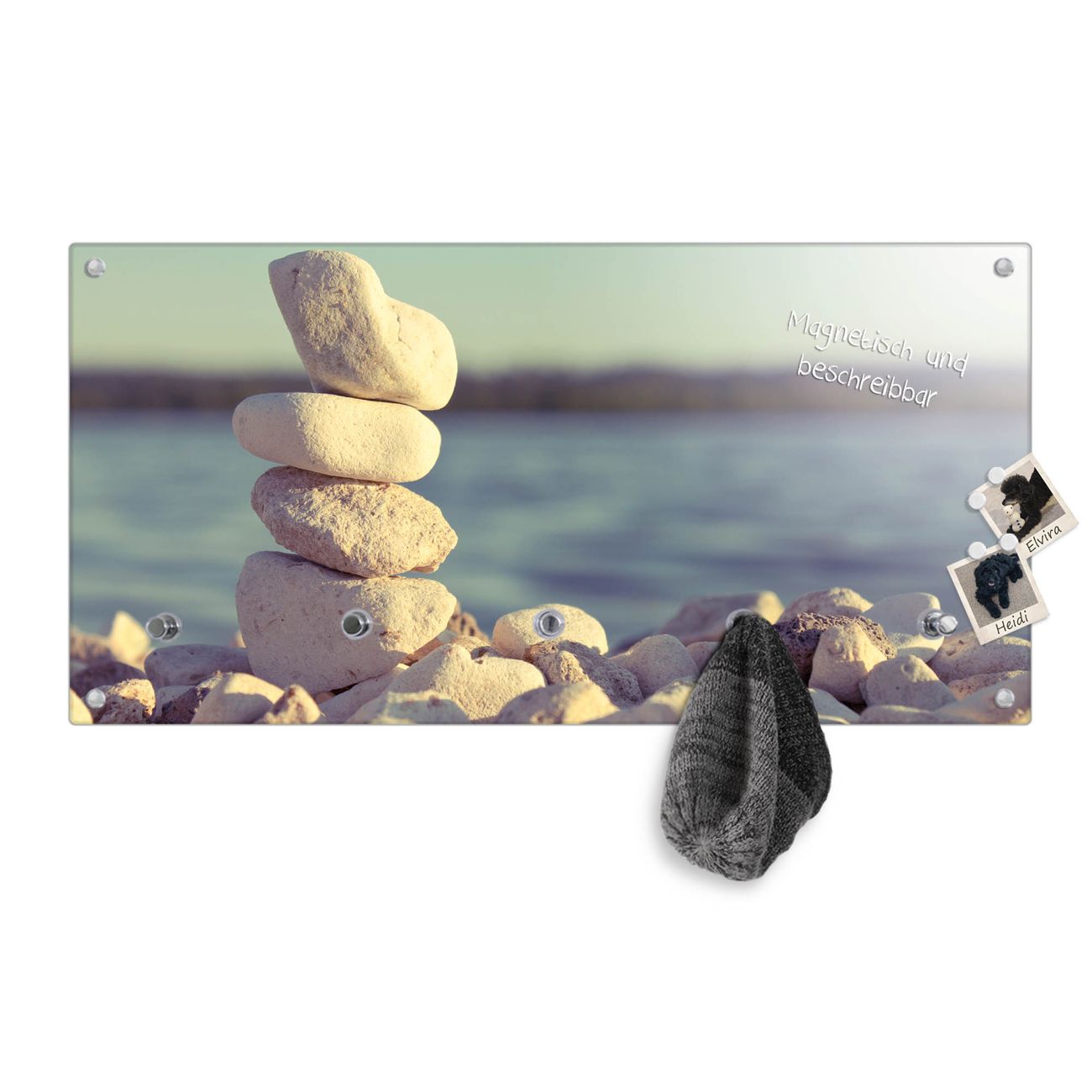 Bitte beachten Sie, dass an dieser Garderobe nur starke Neodym-Magnete halten! FUNKTION: Die banjado Wandgarderobe mit Motiv Leichte Steine ist Ihr täglicher Begleiter. Zuverlässig hängen hier Ihre Jacken und Mäntel griffbereit. Gleichzeitig ist die Design Garderobe magnetisch, Sie können Notizen anheften und durch das Echtglas ist Ihr Paneel auch beschreibbar und wieder abwischbar. DESIGN: Sie erhalten eine Garderobenleiste aus elegantem Echtglas mit dem Farbbrillanten Motiv Leichte Steine hinterklebt. Das Design ist zeitlos klassisch, ohne dabei auf Funktionalität zu verzichten. Suchen Sie aus einer Vielzahl von Motiven das für Ihre Einrichtung Passende aus. DETAILS: Die Flurgarderobe besteht aus 4mm gehärtetem Sicherheitsglas. Sie ist 80cm breit, 40cm hoch und 6cm tief. Die Garderobenhaken zur Selbstmontage präsentieren sich in Edelstahl-Optik, ebenso die Abstandshalter für die Wandmontage. Ihre neue Garderobe ist sofort einsatzbereit. NUTZEN: Ihre neue Garderobe hält nicht nur zuverlässig Ihre Kleidung, sie ist auch optisch ein Blickfang. Durch die magnetische Wirkung können Sie mit 4 beigefügten extrastarken Neodym-Magneten Notizen anheften und mit wasserlöslichen Kreidestiften oder Whiteboard-Markern auch Nachrichten hinterlassen. BANJADO: Wir sind ein kleines kreatives Team aus Sachsen und entwickeln Produkte die Design und Funktionalität verbinden sollen. Viel Freude mit Ihrer neuen Garderobe wünscht das banjado-Team!