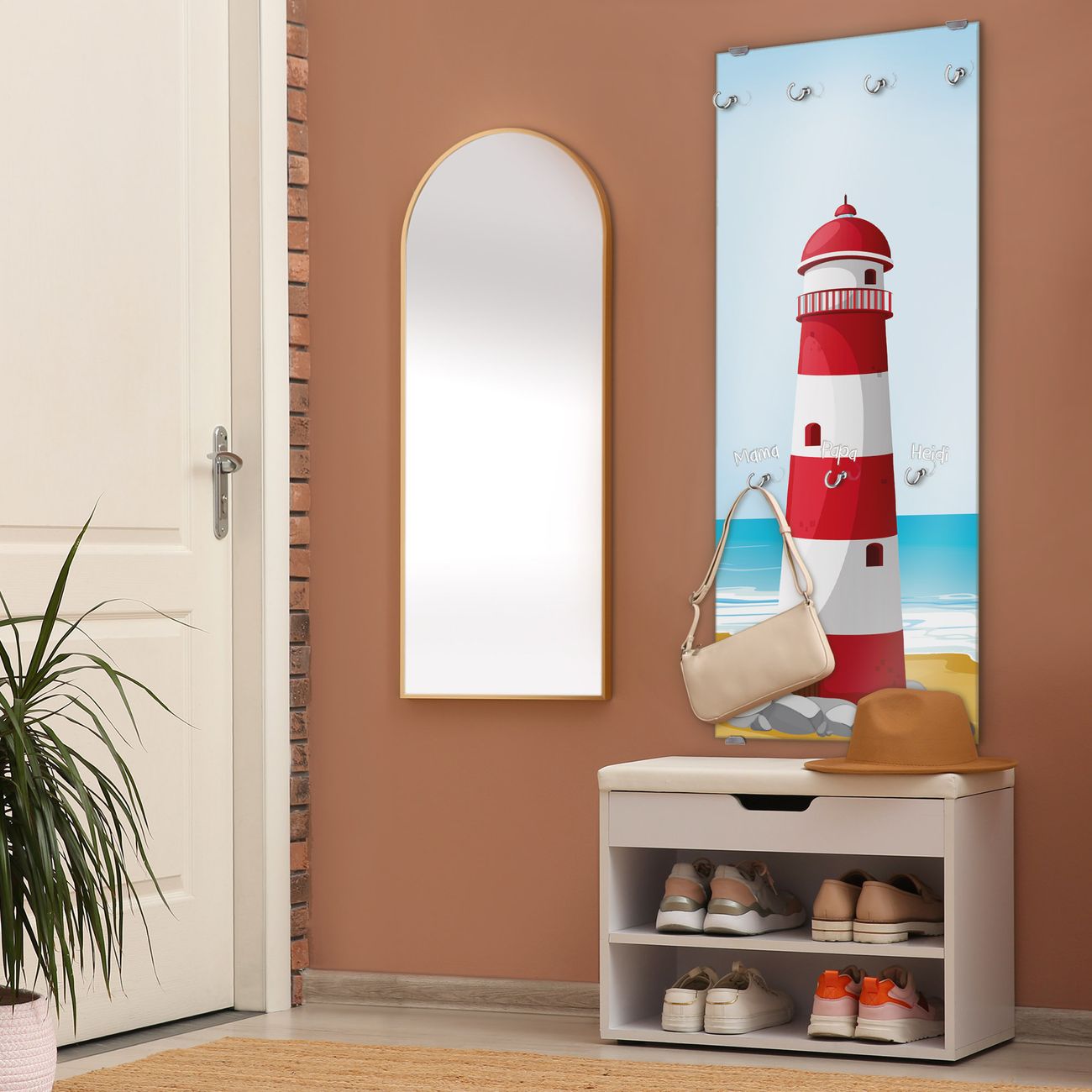 FUNKTION: Die banjado Wandgarderobe mit Motiv Leuchtturm Illustration ist Ihr täglicher Begleiter. Zuverlässig hängen hier Ihre Jacken und Mäntel griffbereit. Das Echtglas ist Ihr Paneel auch beschreibbar und wieder abwischbar. DESIGN: Sie erhalten eine Garderobenleiste aus elegantem Echtglas mit dem Farbbrillanten Motiv Leuchtturm Illustration hinterklebt. Das Design ist zeitlos klassisch, ohne dabei auf Funktionalität zu verzichten. Suchen Sie aus einer Vielzahl von Motiven das für Ihre Einrichtung Passende aus. DETAILS: Die Flurgarderobe besteht aus 4mm gehärtetem Sicherheitsglas. Sie ist 50cm breit, 125cm hoch und 6cm tief. Die Garderobenhaken zur Selbstmontage präsentieren sich in Edelstahl-Optik, ebenso die Abstandshalter für die Wandmontage. Ihre neue Garderobe ist sofort einsatzbereit. NUTZEN: Ihre neue Garderobe hält nicht nur zuverlässig Ihre Kleidung, sie ist auch optisch ein Blickfang. Durch das Glas können Sie an der Garderobe mit wasserlöslichen Kreidestiften oder Whiteboard-Markern auch Nachrichten hinterlassen. BANJADO: Wir sind ein kleines kreatives Team aus Sachsen und entwickeln Produkte die Design und Funktionalität verbinden sollen. Viel Freude mit Ihrer neuen Garderobe wünscht das banjado-Team!