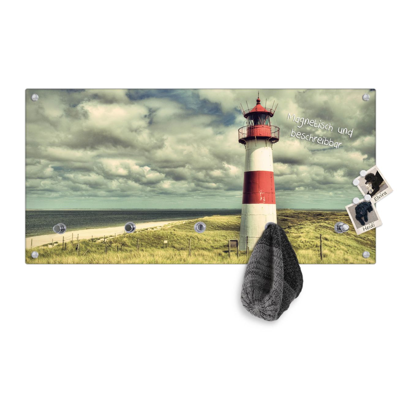 Bitte beachten Sie, dass an dieser Garderobe nur starke Neodym-Magnete halten! FUNKTION: Die banjado Wandgarderobe mit Motiv Leuchtturm Sylt ist Ihr täglicher Begleiter. Zuverlässig hängen hier Ihre Jacken und Mäntel griffbereit. Gleichzeitig ist die Design Garderobe magnetisch, Sie können Notizen anheften und durch das Echtglas ist Ihr Paneel auch beschreibbar und wieder abwischbar. DESIGN: Sie erhalten eine Garderobenleiste aus elegantem Echtglas mit dem Farbbrillanten Motiv Leuchtturm Sylt hinterklebt. Das Design ist zeitlos klassisch, ohne dabei auf Funktionalität zu verzichten. Suchen Sie aus einer Vielzahl von Motiven das für Ihre Einrichtung Passende aus. DETAILS: Die Flurgarderobe besteht aus 4mm gehärtetem Sicherheitsglas. Sie ist 80cm breit, 40cm hoch und 6cm tief. Die Garderobenhaken zur Selbstmontage präsentieren sich in Edelstahl-Optik, ebenso die Abstandshalter für die Wandmontage. Ihre neue Garderobe ist sofort einsatzbereit. NUTZEN: Ihre neue Garderobe hält nicht nur zuverlässig Ihre Kleidung, sie ist auch optisch ein Blickfang. Durch die magnetische Wirkung können Sie mit 4 beigefügten extrastarken Neodym-Magneten Notizen anheften und mit wasserlöslichen Kreidestiften oder Whiteboard-Markern auch Nachrichten hinterlassen. BANJADO: Wir sind ein kleines kreatives Team aus Sachsen und entwickeln Produkte die Design und Funktionalität verbinden sollen. Viel Freude mit Ihrer neuen Garderobe wünscht das banjado-Team!