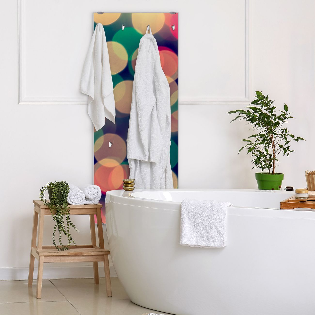 FUNKTION: Die banjado Wandgarderobe mit Motiv Lichtpunkte Weiß Grün Rot ist Ihr täglicher Begleiter. Zuverlässig hängen hier Ihre Jacken und Mäntel griffbereit. Das Echtglas ist Ihr Paneel auch beschreibbar und wieder abwischbar. DESIGN: Sie erhalten eine Garderobenleiste aus elegantem Echtglas mit dem Farbbrillanten Motiv Lichtpunkte Weiß Grün Rot hinterklebt. Das Design ist zeitlos klassisch, ohne dabei auf Funktionalität zu verzichten. Suchen Sie aus einer Vielzahl von Motiven das für Ihre Einrichtung Passende aus. DETAILS: Die Flurgarderobe besteht aus 4mm gehärtetem Sicherheitsglas. Sie ist 50cm breit, 125cm hoch und 6cm tief. Die Garderobenhaken zur Selbstmontage präsentieren sich in Edelstahl-Optik, ebenso die Abstandshalter für die Wandmontage. Ihre neue Garderobe ist sofort einsatzbereit. NUTZEN: Ihre neue Garderobe hält nicht nur zuverlässig Ihre Kleidung, sie ist auch optisch ein Blickfang. Durch das Glas können Sie an der Garderobe mit wasserlöslichen Kreidestiften oder Whiteboard-Markern auch Nachrichten hinterlassen. BANJADO: Wir sind ein kleines kreatives Team aus Sachsen und entwickeln Produkte die Design und Funktionalität verbinden sollen. Viel Freude mit Ihrer neuen Garderobe wünscht das banjado-Team!