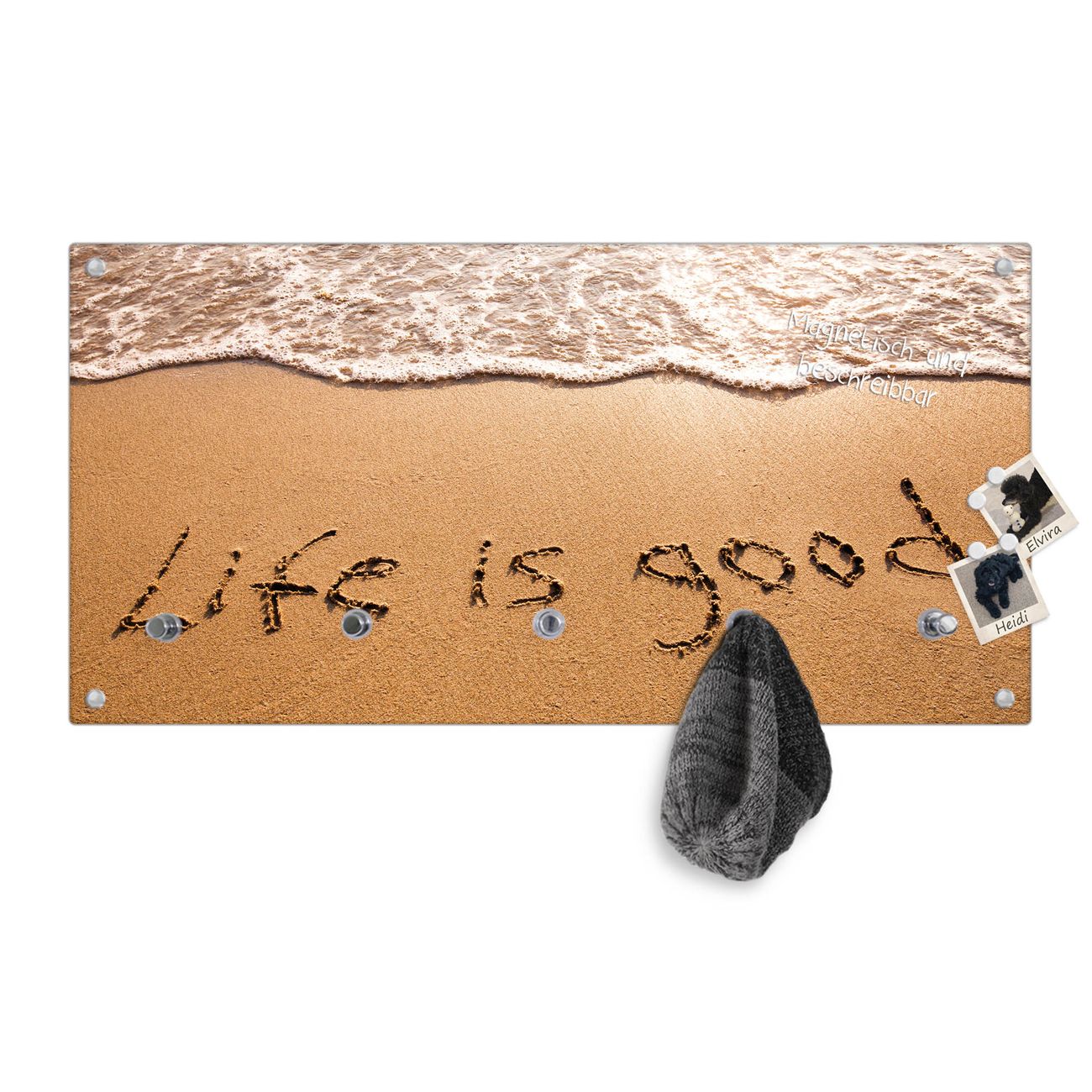 Bitte beachten Sie, dass an dieser Garderobe nur starke Neodym-Magnete halten! FUNKTION: Die banjado Wandgarderobe mit Motiv Life Is Good ist Ihr täglicher Begleiter. Zuverlässig hängen hier Ihre Jacken und Mäntel griffbereit. Gleichzeitig ist die Design Garderobe magnetisch, Sie können Notizen anheften und durch das Echtglas ist Ihr Paneel auch beschreibbar und wieder abwischbar. DESIGN: Sie erhalten eine Garderobenleiste aus elegantem Echtglas mit dem Farbbrillanten Motiv Life Is Good hinterklebt. Das Design ist zeitlos klassisch, ohne dabei auf Funktionalität zu verzichten. Suchen Sie aus einer Vielzahl von Motiven das für Ihre Einrichtung Passende aus. DETAILS: Die Flurgarderobe besteht aus 4mm gehärtetem Sicherheitsglas. Sie ist 80cm breit, 40cm hoch und 6cm tief. Die Garderobenhaken zur Selbstmontage präsentieren sich in Edelstahl-Optik, ebenso die Abstandshalter für die Wandmontage. Ihre neue Garderobe ist sofort einsatzbereit. NUTZEN: Ihre neue Garderobe hält nicht nur zuverlässig Ihre Kleidung, sie ist auch optisch ein Blickfang. Durch die magnetische Wirkung können Sie mit 4 beigefügten extrastarken Neodym-Magneten Notizen anheften und mit wasserlöslichen Kreidestiften oder Whiteboard-Markern auch Nachrichten hinterlassen. BANJADO: Wir sind ein kleines kreatives Team aus Sachsen und entwickeln Produkte die Design und Funktionalität verbinden sollen. Viel Freude mit Ihrer neuen Garderobe wünscht das banjado-Team!
