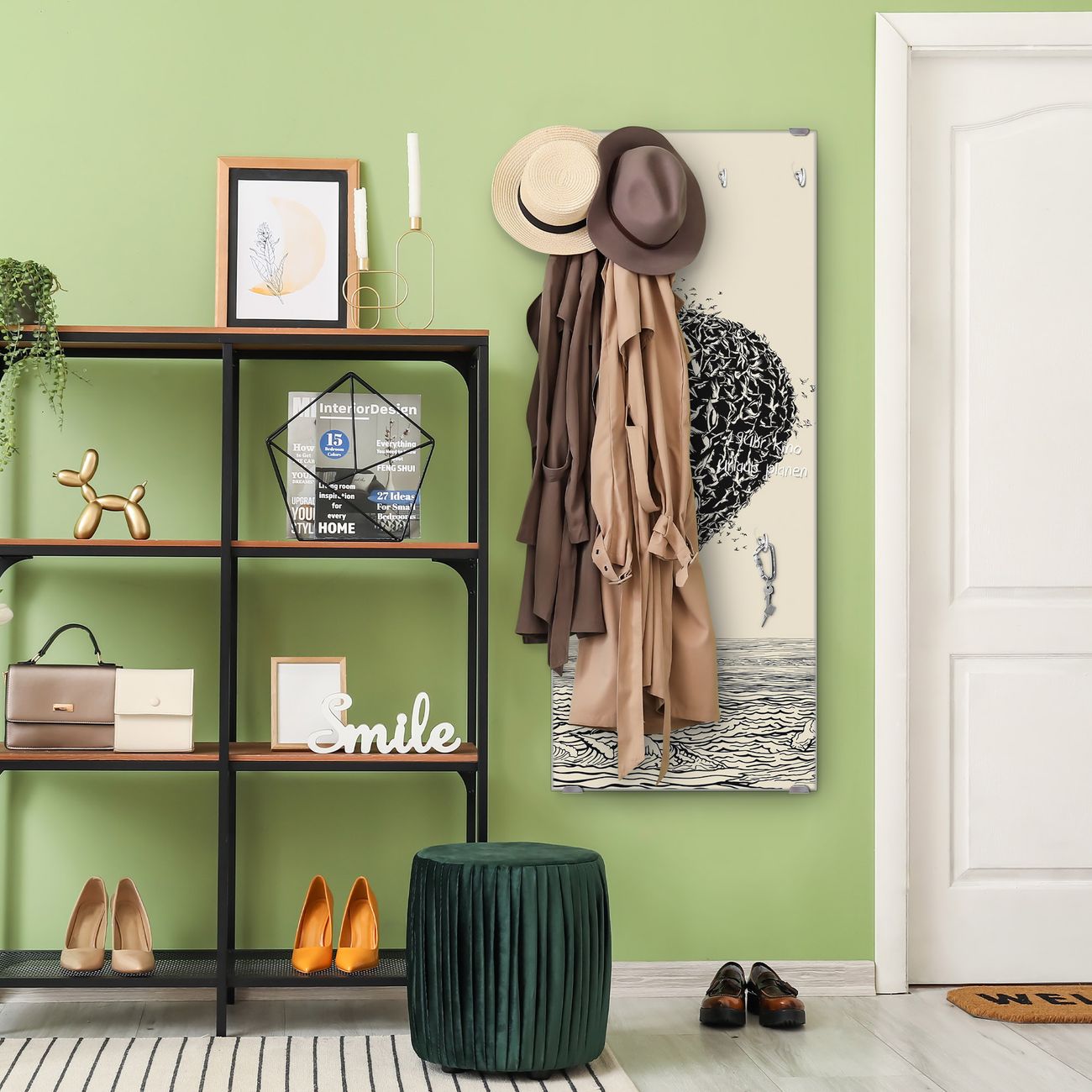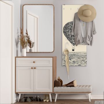 FUNKTION: Die banjado Wandgarderobe mit Motiv Lift ist Ihr täglicher Begleiter. Zuverlässig hängen hier Ihre Jacken und Mäntel griffbereit. Das Echtglas ist Ihr Paneel auch beschreibbar und wieder abwischbar. DESIGN: Sie erhalten eine Garderobenleiste aus elegantem Echtglas mit dem Farbbrillanten Motiv Lift hinterklebt. Das Design ist zeitlos klassisch, ohne dabei auf Funktionalität zu verzichten. Suchen Sie aus einer Vielzahl von Motiven das für Ihre Einrichtung Passende aus. DETAILS: Die Flurgarderobe besteht aus 4mm gehärtetem Sicherheitsglas. Sie ist 50cm breit, 125cm hoch und 6cm tief. Die Garderobenhaken zur Selbstmontage präsentieren sich in Edelstahl-Optik, ebenso die Abstandshalter für die Wandmontage. Ihre neue Garderobe ist sofort einsatzbereit. NUTZEN: Ihre neue Garderobe hält nicht nur zuverlässig Ihre Kleidung, sie ist auch optisch ein Blickfang. Durch das Glas können Sie an der Garderobe mit wasserlöslichen Kreidestiften oder Whiteboard-Markern auch Nachrichten hinterlassen. BANJADO: Wir sind ein kleines kreatives Team aus Sachsen und entwickeln Produkte die Design und Funktionalität verbinden sollen. Viel Freude mit Ihrer neuen Garderobe wünscht das banjado-Team!