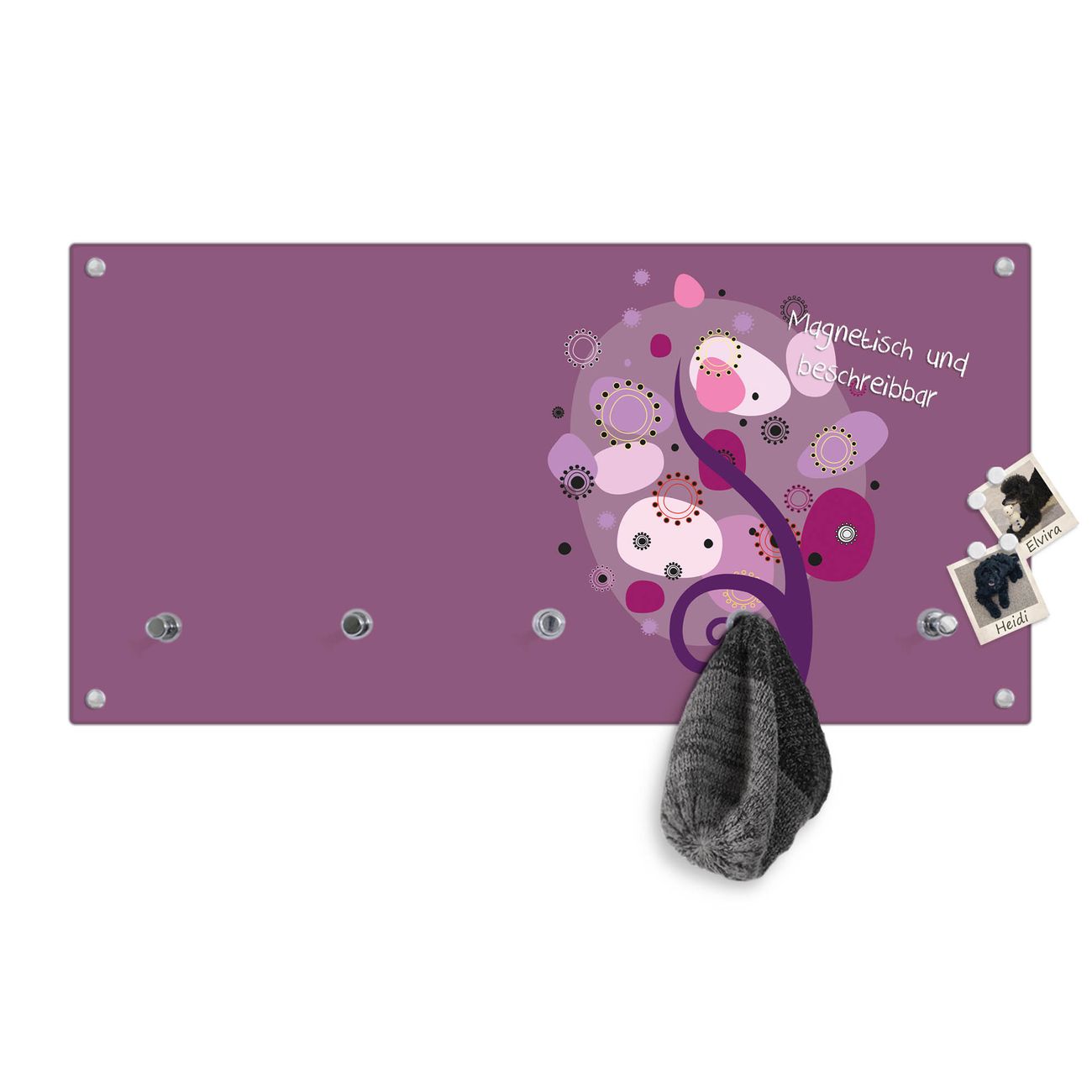 Bitte beachten Sie, dass an dieser Garderobe nur starke Neodym-Magnete halten! FUNKTION: Die banjado Wandgarderobe mit Motiv Lila Baum ist Ihr täglicher Begleiter. Zuverlässig hängen hier Ihre Jacken und Mäntel griffbereit. Gleichzeitig ist die Design Garderobe magnetisch, Sie können Notizen anheften und durch das Echtglas ist Ihr Paneel auch beschreibbar und wieder abwischbar. DESIGN: Sie erhalten eine Garderobenleiste aus elegantem Echtglas mit dem Farbbrillanten Motiv Lila Baum hinterklebt. Das Design ist zeitlos klassisch, ohne dabei auf Funktionalität zu verzichten. Suchen Sie aus einer Vielzahl von Motiven das für Ihre Einrichtung Passende aus. DETAILS: Die Flurgarderobe besteht aus 4mm gehärtetem Sicherheitsglas. Sie ist 80cm breit, 40cm hoch und 6cm tief. Die Garderobenhaken zur Selbstmontage präsentieren sich in Edelstahl-Optik, ebenso die Abstandshalter für die Wandmontage. Ihre neue Garderobe ist sofort einsatzbereit. NUTZEN: Ihre neue Garderobe hält nicht nur zuverlässig Ihre Kleidung, sie ist auch optisch ein Blickfang. Durch die magnetische Wirkung können Sie mit 4 beigefügten extrastarken Neodym-Magneten Notizen anheften und mit wasserlöslichen Kreidestiften oder Whiteboard-Markern auch Nachrichten hinterlassen. BANJADO: Wir sind ein kleines kreatives Team aus Sachsen und entwickeln Produkte die Design und Funktionalität verbinden sollen. Viel Freude mit Ihrer neuen Garderobe wünscht das banjado-Team!