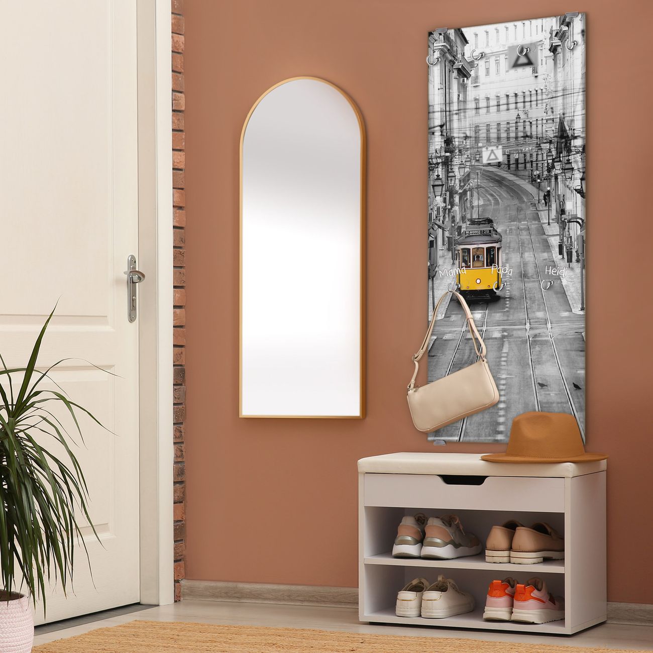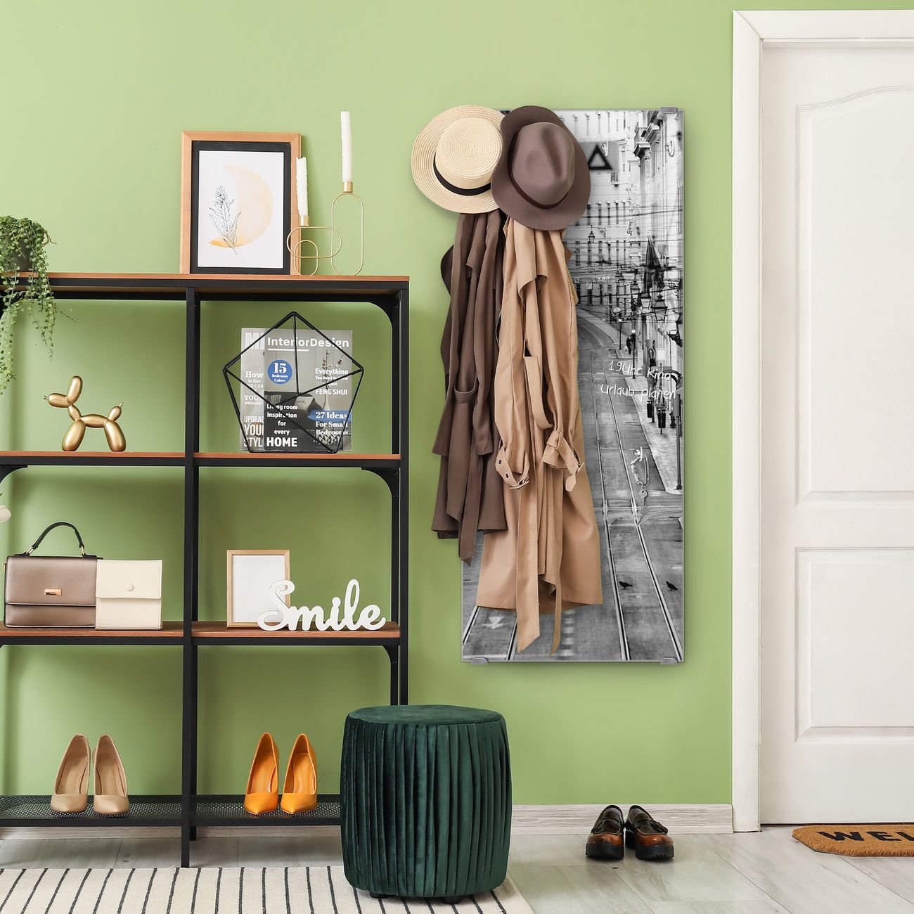 FUNKTION: Die banjado Wandgarderobe mit Motiv Lissabon ist Ihr täglicher Begleiter. Zuverlässig hängen hier Ihre Jacken und Mäntel griffbereit. Das Echtglas ist Ihr Paneel auch beschreibbar und wieder abwischbar. DESIGN: Sie erhalten eine Garderobenleiste aus elegantem Echtglas mit dem Farbbrillanten Motiv Lissabon hinterklebt. Das Design ist zeitlos klassisch, ohne dabei auf Funktionalität zu verzichten. Suchen Sie aus einer Vielzahl von Motiven das für Ihre Einrichtung Passende aus. DETAILS: Die Flurgarderobe besteht aus 4mm gehärtetem Sicherheitsglas. Sie ist 50cm breit, 125cm hoch und 6cm tief. Die Garderobenhaken zur Selbstmontage präsentieren sich in Edelstahl-Optik, ebenso die Abstandshalter für die Wandmontage. Ihre neue Garderobe ist sofort einsatzbereit. NUTZEN: Ihre neue Garderobe hält nicht nur zuverlässig Ihre Kleidung, sie ist auch optisch ein Blickfang. Durch das Glas können Sie an der Garderobe mit wasserlöslichen Kreidestiften oder Whiteboard-Markern auch Nachrichten hinterlassen. BANJADO: Wir sind ein kleines kreatives Team aus Sachsen und entwickeln Produkte die Design und Funktionalität verbinden sollen. Viel Freude mit Ihrer neuen Garderobe wünscht das banjado-Team!