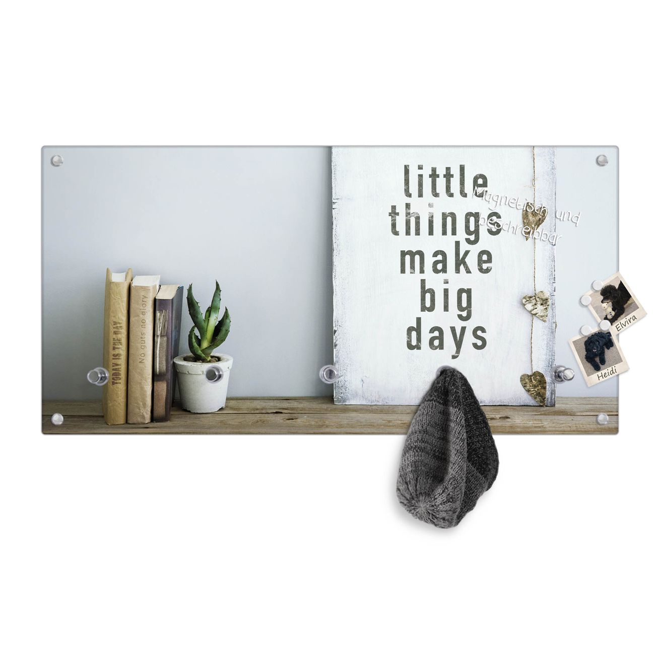 Bitte beachten Sie, dass an dieser Garderobe nur starke Neodym-Magnete halten! FUNKTION: Die banjado Wandgarderobe mit Motiv Little Things ist Ihr täglicher Begleiter. Zuverlässig hängen hier Ihre Jacken und Mäntel griffbereit. Gleichzeitig ist die Design Garderobe magnetisch, Sie können Notizen anheften und durch das Echtglas ist Ihr Paneel auch beschreibbar und wieder abwischbar. DESIGN: Sie erhalten eine Garderobenleiste aus elegantem Echtglas mit dem Farbbrillanten Motiv Little Things hinterklebt. Das Design ist zeitlos klassisch, ohne dabei auf Funktionalität zu verzichten. Suchen Sie aus einer Vielzahl von Motiven das für Ihre Einrichtung Passende aus. DETAILS: Die Flurgarderobe besteht aus 4mm gehärtetem Sicherheitsglas. Sie ist 80cm breit, 40cm hoch und 6cm tief. Die Garderobenhaken zur Selbstmontage präsentieren sich in Edelstahl-Optik, ebenso die Abstandshalter für die Wandmontage. Ihre neue Garderobe ist sofort einsatzbereit. NUTZEN: Ihre neue Garderobe hält nicht nur zuverlässig Ihre Kleidung, sie ist auch optisch ein Blickfang. Durch die magnetische Wirkung können Sie mit 4 beigefügten extrastarken Neodym-Magneten Notizen anheften und mit wasserlöslichen Kreidestiften oder Whiteboard-Markern auch Nachrichten hinterlassen. BANJADO: Wir sind ein kleines kreatives Team aus Sachsen und entwickeln Produkte die Design und Funktionalität verbinden sollen. Viel Freude mit Ihrer neuen Garderobe wünscht das banjado-Team!