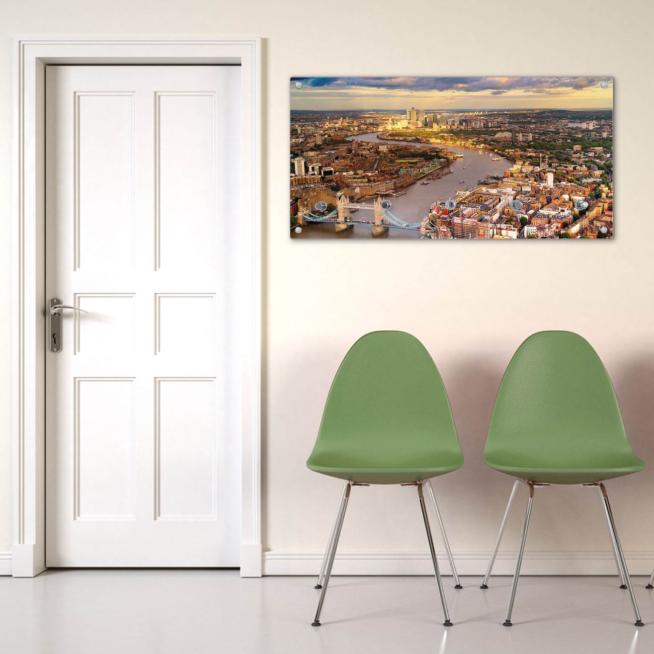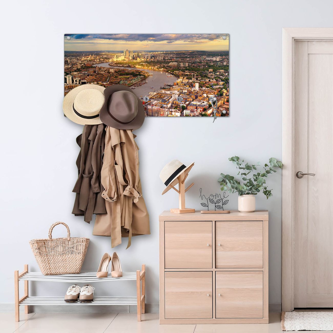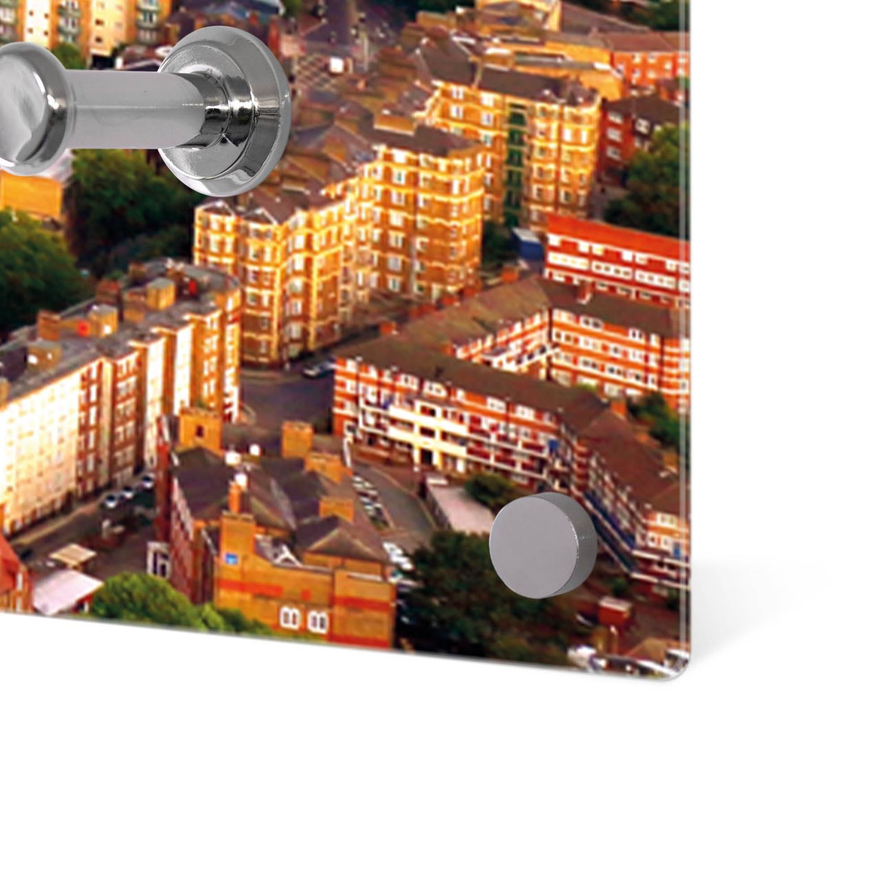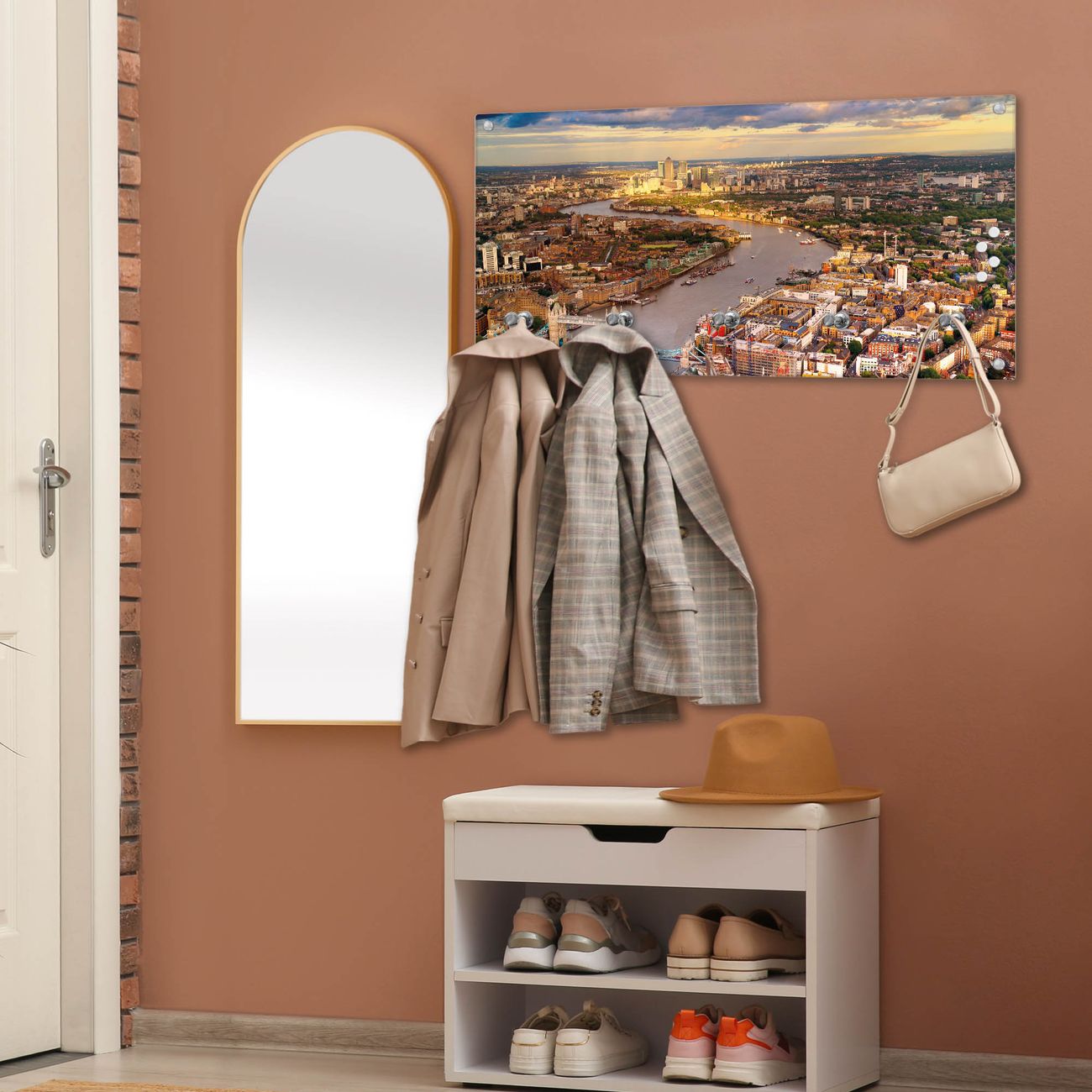 Bitte beachten Sie, dass an dieser Garderobe nur starke Neodym-Magnete halten! FUNKTION: Die banjado Wandgarderobe mit Motiv London ist Ihr täglicher Begleiter. Zuverlässig hängen hier Ihre Jacken und Mäntel griffbereit. Gleichzeitig ist die Design Garderobe magnetisch, Sie können Notizen anheften und durch das Echtglas ist Ihr Paneel auch beschreibbar und wieder abwischbar. DESIGN: Sie erhalten eine Garderobenleiste aus elegantem Echtglas mit dem Farbbrillanten Motiv London hinterklebt. Das Design ist zeitlos klassisch, ohne dabei auf Funktionalität zu verzichten. Suchen Sie aus einer Vielzahl von Motiven das für Ihre Einrichtung Passende aus. DETAILS: Die Flurgarderobe besteht aus 4mm gehärtetem Sicherheitsglas. Sie ist 80cm breit, 40cm hoch und 6cm tief. Die Garderobenhaken zur Selbstmontage präsentieren sich in Edelstahl-Optik, ebenso die Abstandshalter für die Wandmontage. Ihre neue Garderobe ist sofort einsatzbereit. NUTZEN: Ihre neue Garderobe hält nicht nur zuverlässig Ihre Kleidung, sie ist auch optisch ein Blickfang. Durch die magnetische Wirkung können Sie mit 4 beigefügten extrastarken Neodym-Magneten Notizen anheften und mit wasserlöslichen Kreidestiften oder Whiteboard-Markern auch Nachrichten hinterlassen. BANJADO: Wir sind ein kleines kreatives Team aus Sachsen und entwickeln Produkte die Design und Funktionalität verbinden sollen. Viel Freude mit Ihrer neuen Garderobe wünscht das banjado-Team!