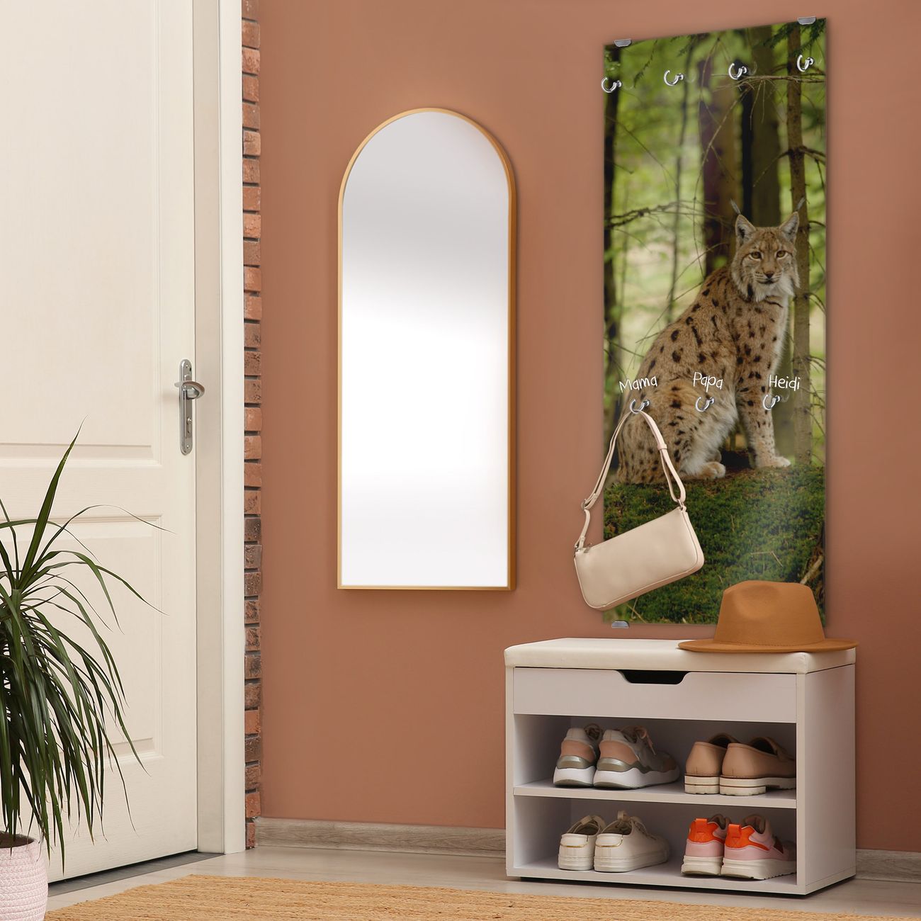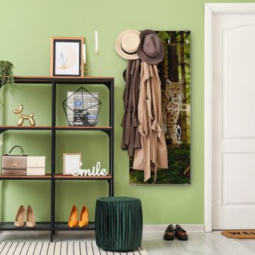 FUNKTION: Die banjado Wandgarderobe mit Motiv Luchs ist Ihr täglicher Begleiter. Zuverlässig hängen hier Ihre Jacken und Mäntel griffbereit. Das Echtglas ist Ihr Paneel auch beschreibbar und wieder abwischbar. DESIGN: Sie erhalten eine Garderobenleiste aus elegantem Echtglas mit dem Farbbrillanten Motiv Luchs hinterklebt. Das Design ist zeitlos klassisch, ohne dabei auf Funktionalität zu verzichten. Suchen Sie aus einer Vielzahl von Motiven das für Ihre Einrichtung Passende aus. DETAILS: Die Flurgarderobe besteht aus 4mm gehärtetem Sicherheitsglas. Sie ist 50cm breit, 125cm hoch und 6cm tief. Die Garderobenhaken zur Selbstmontage präsentieren sich in Edelstahl-Optik, ebenso die Abstandshalter für die Wandmontage. Ihre neue Garderobe ist sofort einsatzbereit. NUTZEN: Ihre neue Garderobe hält nicht nur zuverlässig Ihre Kleidung, sie ist auch optisch ein Blickfang. Durch das Glas können Sie an der Garderobe mit wasserlöslichen Kreidestiften oder Whiteboard-Markern auch Nachrichten hinterlassen. BANJADO: Wir sind ein kleines kreatives Team aus Sachsen und entwickeln Produkte die Design und Funktionalität verbinden sollen. Viel Freude mit Ihrer neuen Garderobe wünscht das banjado-Team!