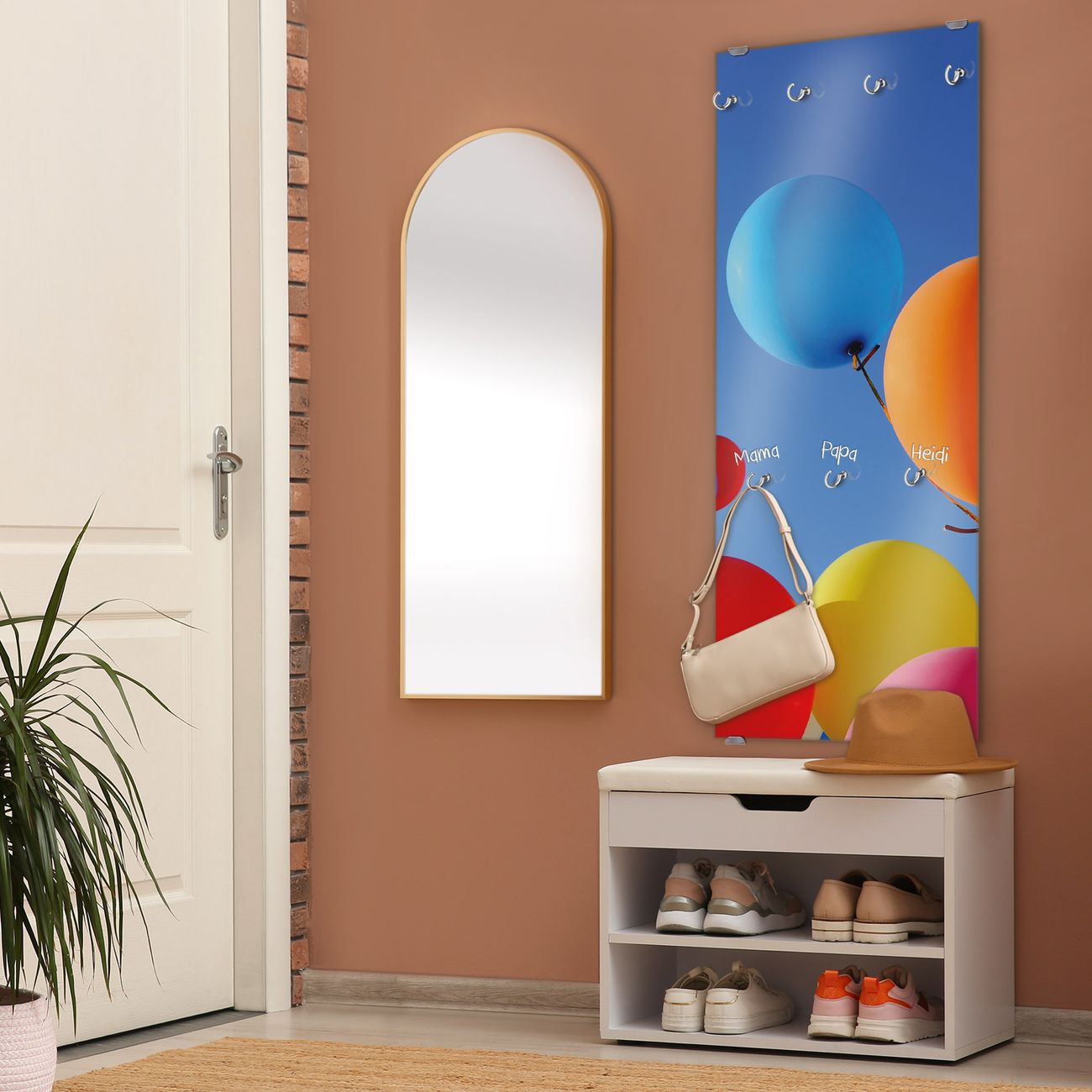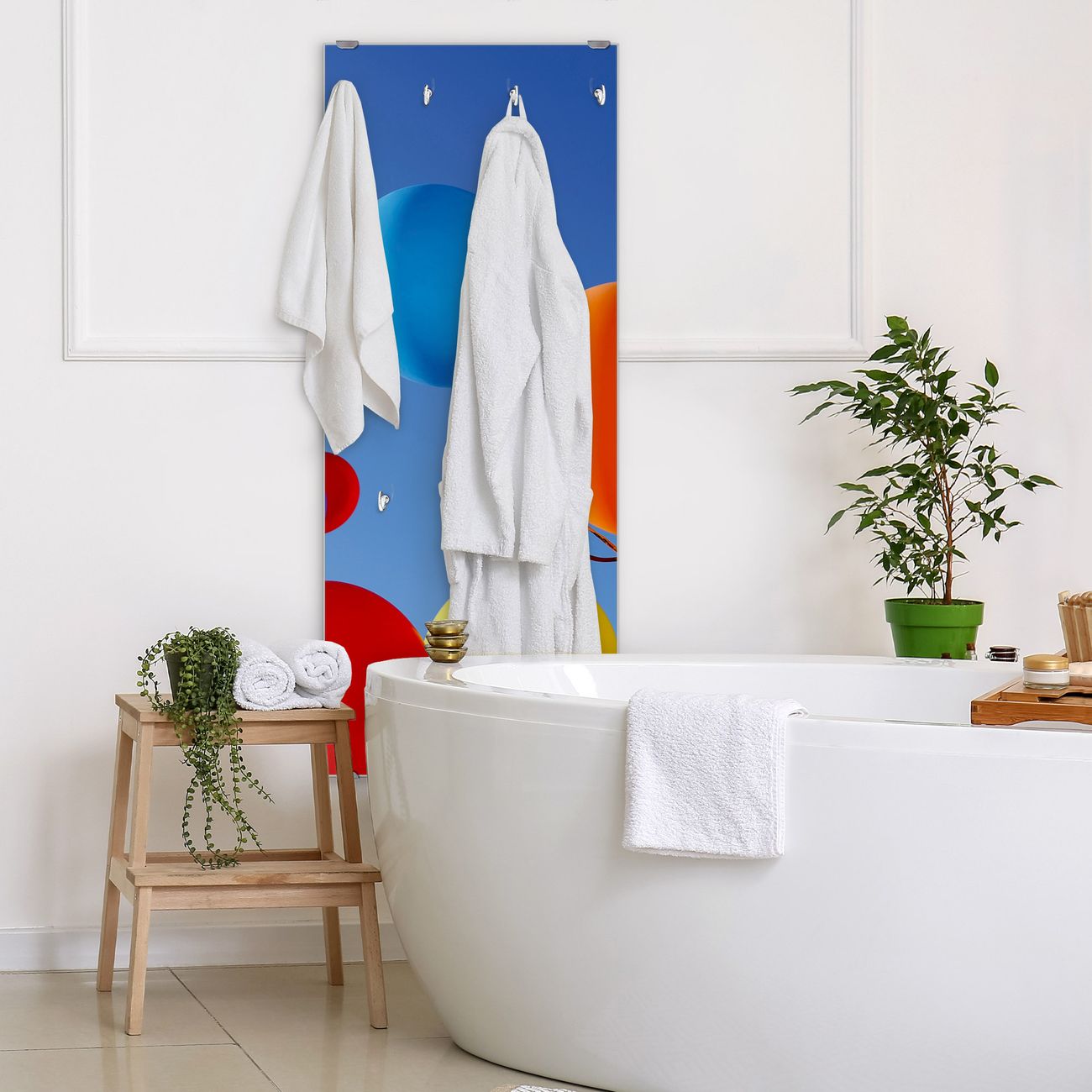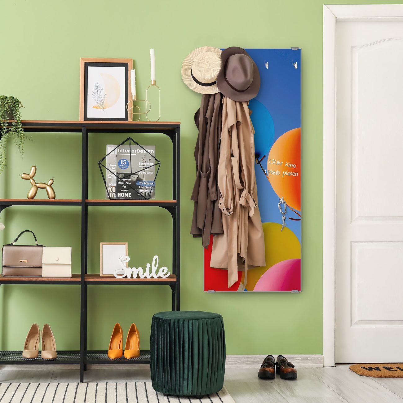 FUNKTION: Die banjado Wandgarderobe mit Motiv Luftballons ist Ihr täglicher Begleiter. Zuverlässig hängen hier Ihre Jacken und Mäntel griffbereit. Das Echtglas ist Ihr Paneel auch beschreibbar und wieder abwischbar. DESIGN: Sie erhalten eine Garderobenleiste aus elegantem Echtglas mit dem Farbbrillanten Motiv Luftballons hinterklebt. Das Design ist zeitlos klassisch, ohne dabei auf Funktionalität zu verzichten. Suchen Sie aus einer Vielzahl von Motiven das für Ihre Einrichtung Passende aus. DETAILS: Die Flurgarderobe besteht aus 4mm gehärtetem Sicherheitsglas. Sie ist 50cm breit, 125cm hoch und 6cm tief. Die Garderobenhaken zur Selbstmontage präsentieren sich in Edelstahl-Optik, ebenso die Abstandshalter für die Wandmontage. Ihre neue Garderobe ist sofort einsatzbereit. NUTZEN: Ihre neue Garderobe hält nicht nur zuverlässig Ihre Kleidung, sie ist auch optisch ein Blickfang. Durch das Glas können Sie an der Garderobe mit wasserlöslichen Kreidestiften oder Whiteboard-Markern auch Nachrichten hinterlassen. BANJADO: Wir sind ein kleines kreatives Team aus Sachsen und entwickeln Produkte die Design und Funktionalität verbinden sollen. Viel Freude mit Ihrer neuen Garderobe wünscht das banjado-Team!