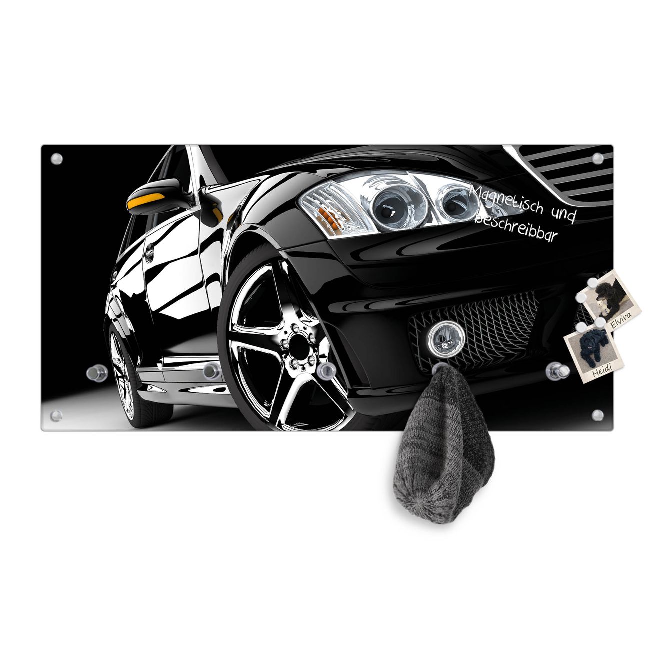 Bitte beachten Sie, dass an dieser Garderobe nur starke Neodym-Magnete halten! FUNKTION: Die banjado Wandgarderobe mit Motiv Luxus Car ist Ihr täglicher Begleiter. Zuverlässig hängen hier Ihre Jacken und Mäntel griffbereit. Gleichzeitig ist die Design Garderobe magnetisch, Sie können Notizen anheften und durch das Echtglas ist Ihr Paneel auch beschreibbar und wieder abwischbar. DESIGN: Sie erhalten eine Garderobenleiste aus elegantem Echtglas mit dem Farbbrillanten Motiv Luxus Car hinterklebt. Das Design ist zeitlos klassisch, ohne dabei auf Funktionalität zu verzichten. Suchen Sie aus einer Vielzahl von Motiven das für Ihre Einrichtung Passende aus. DETAILS: Die Flurgarderobe besteht aus 4mm gehärtetem Sicherheitsglas. Sie ist 80cm breit, 40cm hoch und 6cm tief. Die Garderobenhaken zur Selbstmontage präsentieren sich in Edelstahl-Optik, ebenso die Abstandshalter für die Wandmontage. Ihre neue Garderobe ist sofort einsatzbereit. NUTZEN: Ihre neue Garderobe hält nicht nur zuverlässig Ihre Kleidung, sie ist auch optisch ein Blickfang. Durch die magnetische Wirkung können Sie mit 4 beigefügten extrastarken Neodym-Magneten Notizen anheften und mit wasserlöslichen Kreidestiften oder Whiteboard-Markern auch Nachrichten hinterlassen. BANJADO: Wir sind ein kleines kreatives Team aus Sachsen und entwickeln Produkte die Design und Funktionalität verbinden sollen. Viel Freude mit Ihrer neuen Garderobe wünscht das banjado-Team!