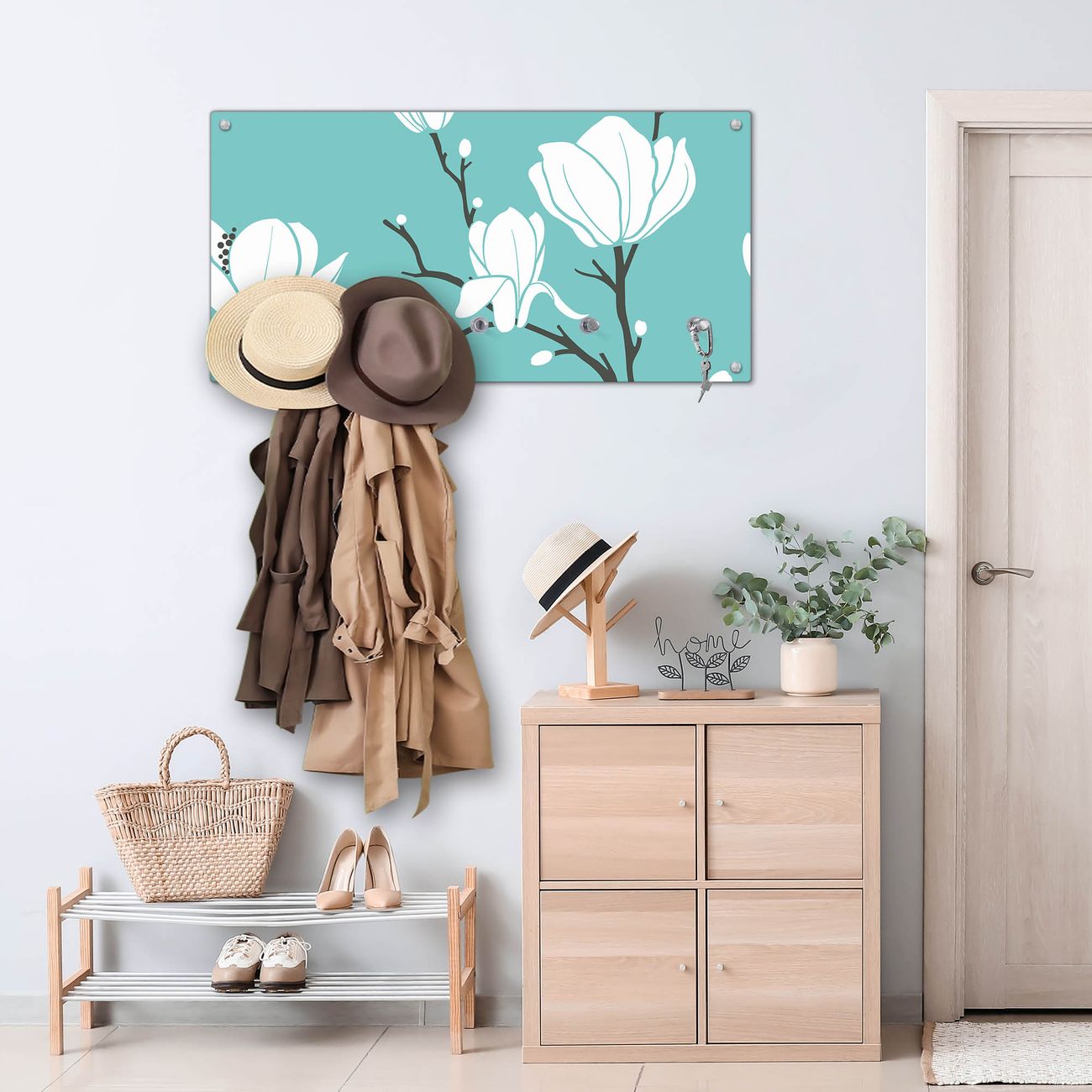 Bitte beachten Sie, dass an dieser Garderobe nur starke Neodym-Magnete halten! FUNKTION: Die banjado Wandgarderobe mit Motiv Magnolien ist Ihr täglicher Begleiter. Zuverlässig hängen hier Ihre Jacken und Mäntel griffbereit. Gleichzeitig ist die Design Garderobe magnetisch, Sie können Notizen anheften und durch das Echtglas ist Ihr Paneel auch beschreibbar und wieder abwischbar. DESIGN: Sie erhalten eine Garderobenleiste aus elegantem Echtglas mit dem Farbbrillanten Motiv Magnolien hinterklebt. Das Design ist zeitlos klassisch, ohne dabei auf Funktionalität zu verzichten. Suchen Sie aus einer Vielzahl von Motiven das für Ihre Einrichtung Passende aus. DETAILS: Die Flurgarderobe besteht aus 4mm gehärtetem Sicherheitsglas. Sie ist 80cm breit, 40cm hoch und 6cm tief. Die Garderobenhaken zur Selbstmontage präsentieren sich in Edelstahl-Optik, ebenso die Abstandshalter für die Wandmontage. Ihre neue Garderobe ist sofort einsatzbereit. NUTZEN: Ihre neue Garderobe hält nicht nur zuverlässig Ihre Kleidung, sie ist auch optisch ein Blickfang. Durch die magnetische Wirkung können Sie mit 4 beigefügten extrastarken Neodym-Magneten Notizen anheften und mit wasserlöslichen Kreidestiften oder Whiteboard-Markern auch Nachrichten hinterlassen. BANJADO: Wir sind ein kleines kreatives Team aus Sachsen und entwickeln Produkte die Design und Funktionalität verbinden sollen. Viel Freude mit Ihrer neuen Garderobe wünscht das banjado-Team!