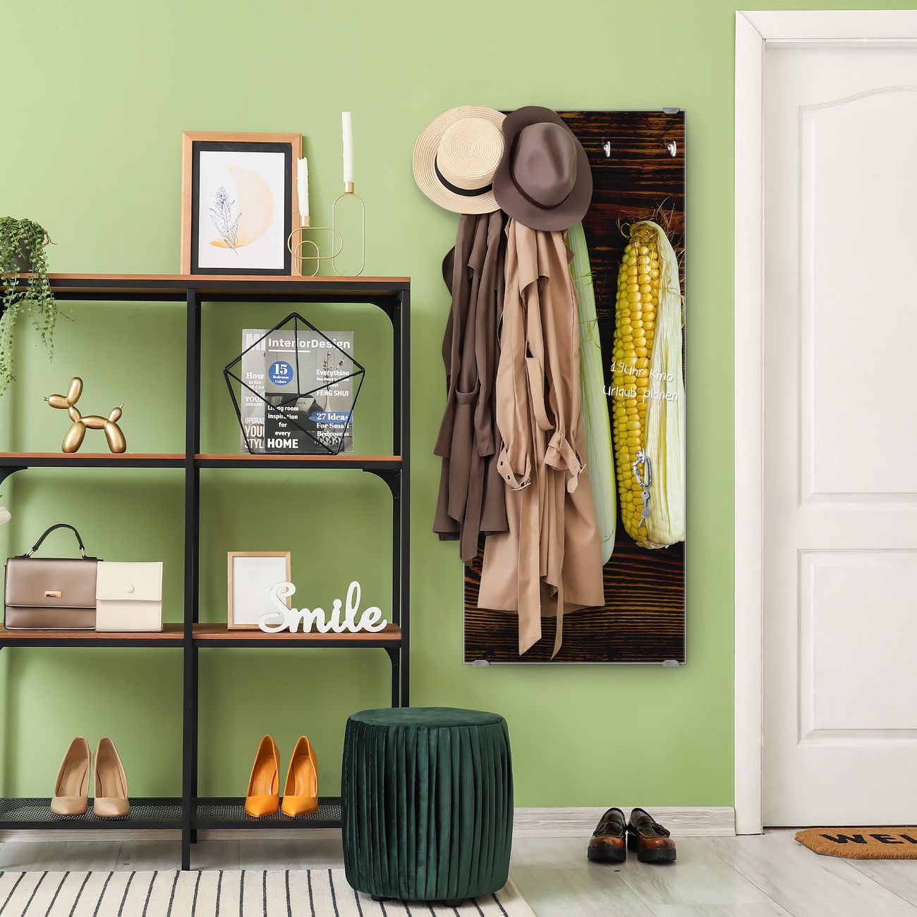 FUNKTION: Die banjado Wandgarderobe mit Motiv Maiskolben ist Ihr täglicher Begleiter. Zuverlässig hängen hier Ihre Jacken und Mäntel griffbereit. Das Echtglas ist Ihr Paneel auch beschreibbar und wieder abwischbar. DESIGN: Sie erhalten eine Garderobenleiste aus elegantem Echtglas mit dem Farbbrillanten Motiv Maiskolben hinterklebt. Das Design ist zeitlos klassisch, ohne dabei auf Funktionalität zu verzichten. Suchen Sie aus einer Vielzahl von Motiven das für Ihre Einrichtung Passende aus. DETAILS: Die Flurgarderobe besteht aus 4mm gehärtetem Sicherheitsglas. Sie ist 50cm breit, 125cm hoch und 6cm tief. Die Garderobenhaken zur Selbstmontage präsentieren sich in Edelstahl-Optik, ebenso die Abstandshalter für die Wandmontage. Ihre neue Garderobe ist sofort einsatzbereit. NUTZEN: Ihre neue Garderobe hält nicht nur zuverlässig Ihre Kleidung, sie ist auch optisch ein Blickfang. Durch das Glas können Sie an der Garderobe mit wasserlöslichen Kreidestiften oder Whiteboard-Markern auch Nachrichten hinterlassen. BANJADO: Wir sind ein kleines kreatives Team aus Sachsen und entwickeln Produkte die Design und Funktionalität verbinden sollen. Viel Freude mit Ihrer neuen Garderobe wünscht das banjado-Team!