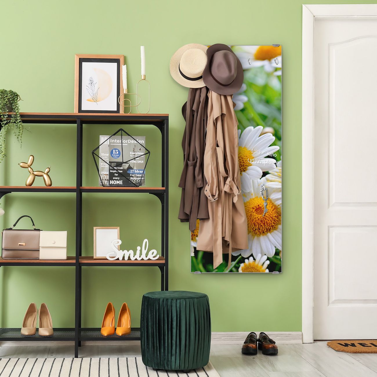 FUNKTION: Die banjado Wandgarderobe mit Motiv Margeriten Illustration ist Ihr täglicher Begleiter. Zuverlässig hängen hier Ihre Jacken und Mäntel griffbereit. Das Echtglas ist Ihr Paneel auch beschreibbar und wieder abwischbar. DESIGN: Sie erhalten eine Garderobenleiste aus elegantem Echtglas mit dem Farbbrillanten Motiv Margeriten Illustration hinterklebt. Das Design ist zeitlos klassisch, ohne dabei auf Funktionalität zu verzichten. Suchen Sie aus einer Vielzahl von Motiven das für Ihre Einrichtung Passende aus. DETAILS: Die Flurgarderobe besteht aus 4mm gehärtetem Sicherheitsglas. Sie ist 50cm breit, 125cm hoch und 6cm tief. Die Garderobenhaken zur Selbstmontage präsentieren sich in Edelstahl-Optik, ebenso die Abstandshalter für die Wandmontage. Ihre neue Garderobe ist sofort einsatzbereit. NUTZEN: Ihre neue Garderobe hält nicht nur zuverlässig Ihre Kleidung, sie ist auch optisch ein Blickfang. Durch das Glas können Sie an der Garderobe mit wasserlöslichen Kreidestiften oder Whiteboard-Markern auch Nachrichten hinterlassen. BANJADO: Wir sind ein kleines kreatives Team aus Sachsen und entwickeln Produkte die Design und Funktionalität verbinden sollen. Viel Freude mit Ihrer neuen Garderobe wünscht das banjado-Team!