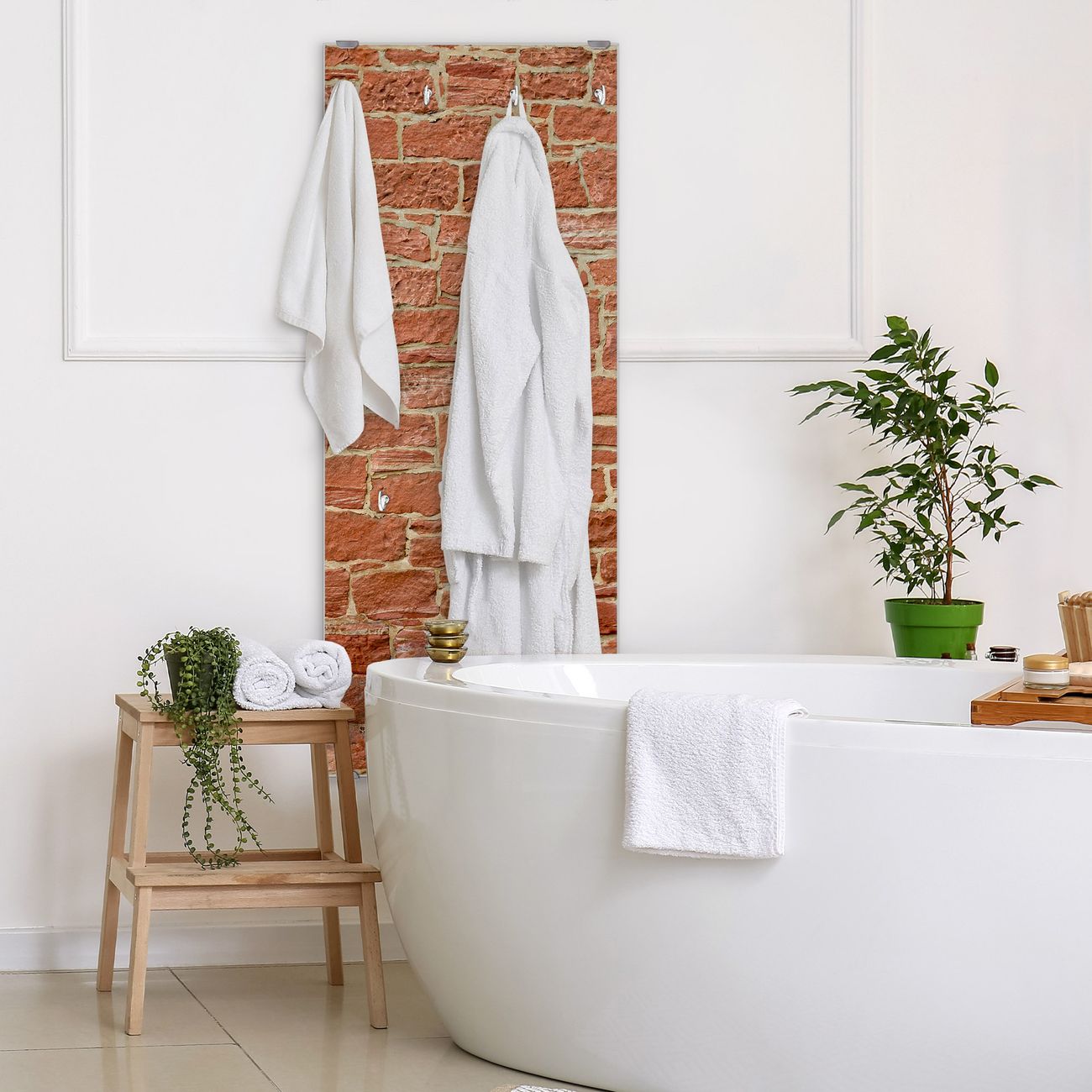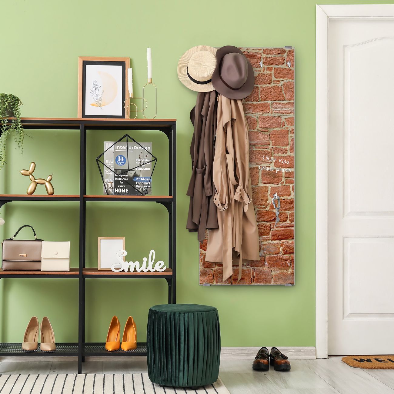 FUNKTION: Die banjado Wandgarderobe mit Motiv Mauerwerk ist Ihr täglicher Begleiter. Zuverlässig hängen hier Ihre Jacken und Mäntel griffbereit. Das Echtglas ist Ihr Paneel auch beschreibbar und wieder abwischbar. DESIGN: Sie erhalten eine Garderobenleiste aus elegantem Echtglas mit dem Farbbrillanten Motiv Mauerwerk hinterklebt. Das Design ist zeitlos klassisch, ohne dabei auf Funktionalität zu verzichten. Suchen Sie aus einer Vielzahl von Motiven das für Ihre Einrichtung Passende aus. DETAILS: Die Flurgarderobe besteht aus 4mm gehärtetem Sicherheitsglas. Sie ist 50cm breit, 125cm hoch und 6cm tief. Die Garderobenhaken zur Selbstmontage präsentieren sich in Edelstahl-Optik, ebenso die Abstandshalter für die Wandmontage. Ihre neue Garderobe ist sofort einsatzbereit. NUTZEN: Ihre neue Garderobe hält nicht nur zuverlässig Ihre Kleidung, sie ist auch optisch ein Blickfang. Durch das Glas können Sie an der Garderobe mit wasserlöslichen Kreidestiften oder Whiteboard-Markern auch Nachrichten hinterlassen. BANJADO: Wir sind ein kleines kreatives Team aus Sachsen und entwickeln Produkte die Design und Funktionalität verbinden sollen. Viel Freude mit Ihrer neuen Garderobe wünscht das banjado-Team!