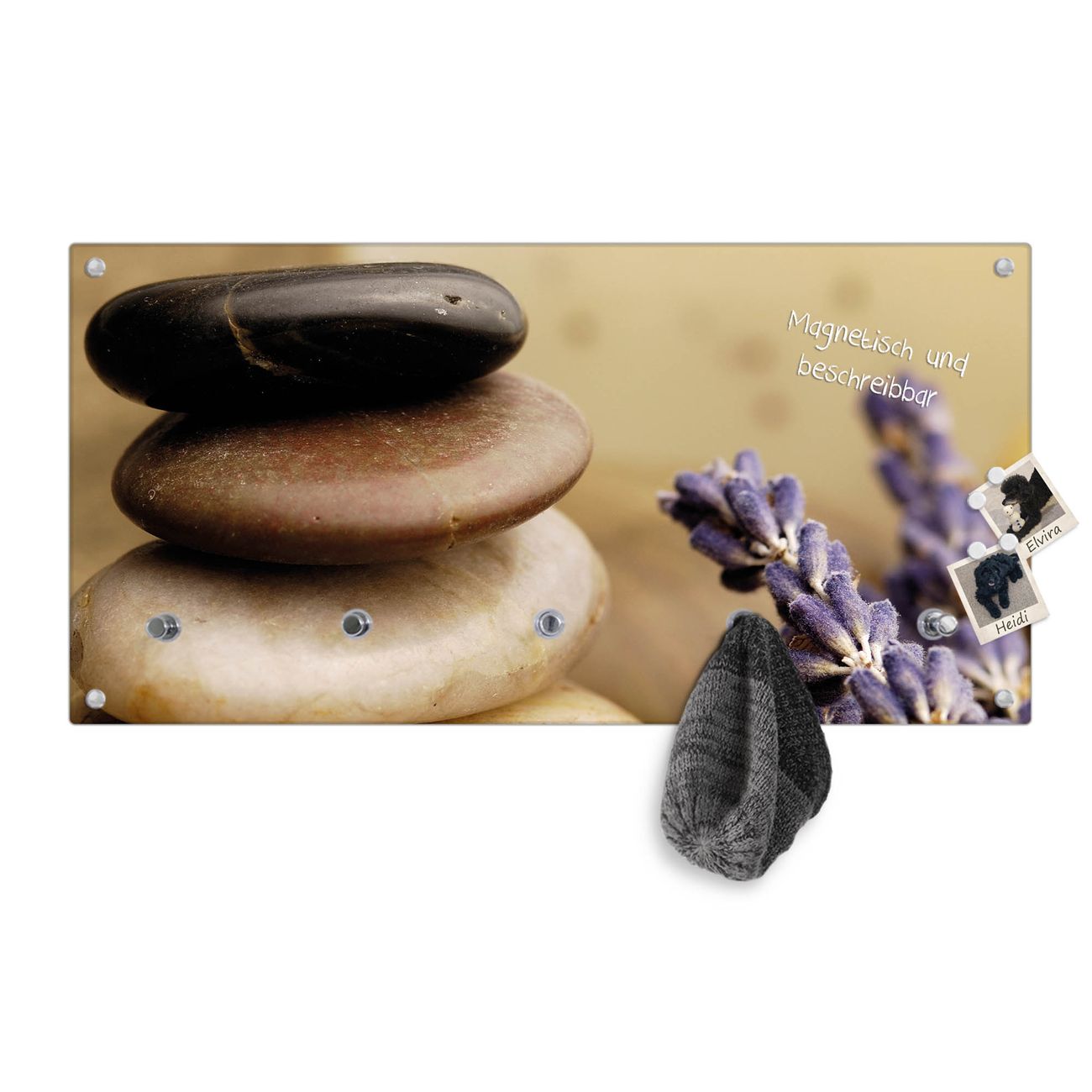 Bitte beachten Sie, dass an dieser Garderobe nur starke Neodym-Magnete halten! FUNKTION: Die banjado Wandgarderobe mit Motiv Meditation ist Ihr täglicher Begleiter. Zuverlässig hängen hier Ihre Jacken und Mäntel griffbereit. Gleichzeitig ist die Design Garderobe magnetisch, Sie können Notizen anheften und durch das Echtglas ist Ihr Paneel auch beschreibbar und wieder abwischbar. DESIGN: Sie erhalten eine Garderobenleiste aus elegantem Echtglas mit dem Farbbrillanten Motiv Meditation hinterklebt. Das Design ist zeitlos klassisch, ohne dabei auf Funktionalität zu verzichten. Suchen Sie aus einer Vielzahl von Motiven das für Ihre Einrichtung Passende aus. DETAILS: Die Flurgarderobe besteht aus 4mm gehärtetem Sicherheitsglas. Sie ist 80cm breit, 40cm hoch und 6cm tief. Die Garderobenhaken zur Selbstmontage präsentieren sich in Edelstahl-Optik, ebenso die Abstandshalter für die Wandmontage. Ihre neue Garderobe ist sofort einsatzbereit. NUTZEN: Ihre neue Garderobe hält nicht nur zuverlässig Ihre Kleidung, sie ist auch optisch ein Blickfang. Durch die magnetische Wirkung können Sie mit 4 beigefügten extrastarken Neodym-Magneten Notizen anheften und mit wasserlöslichen Kreidestiften oder Whiteboard-Markern auch Nachrichten hinterlassen. BANJADO: Wir sind ein kleines kreatives Team aus Sachsen und entwickeln Produkte die Design und Funktionalität verbinden sollen. Viel Freude mit Ihrer neuen Garderobe wünscht das banjado-Team!