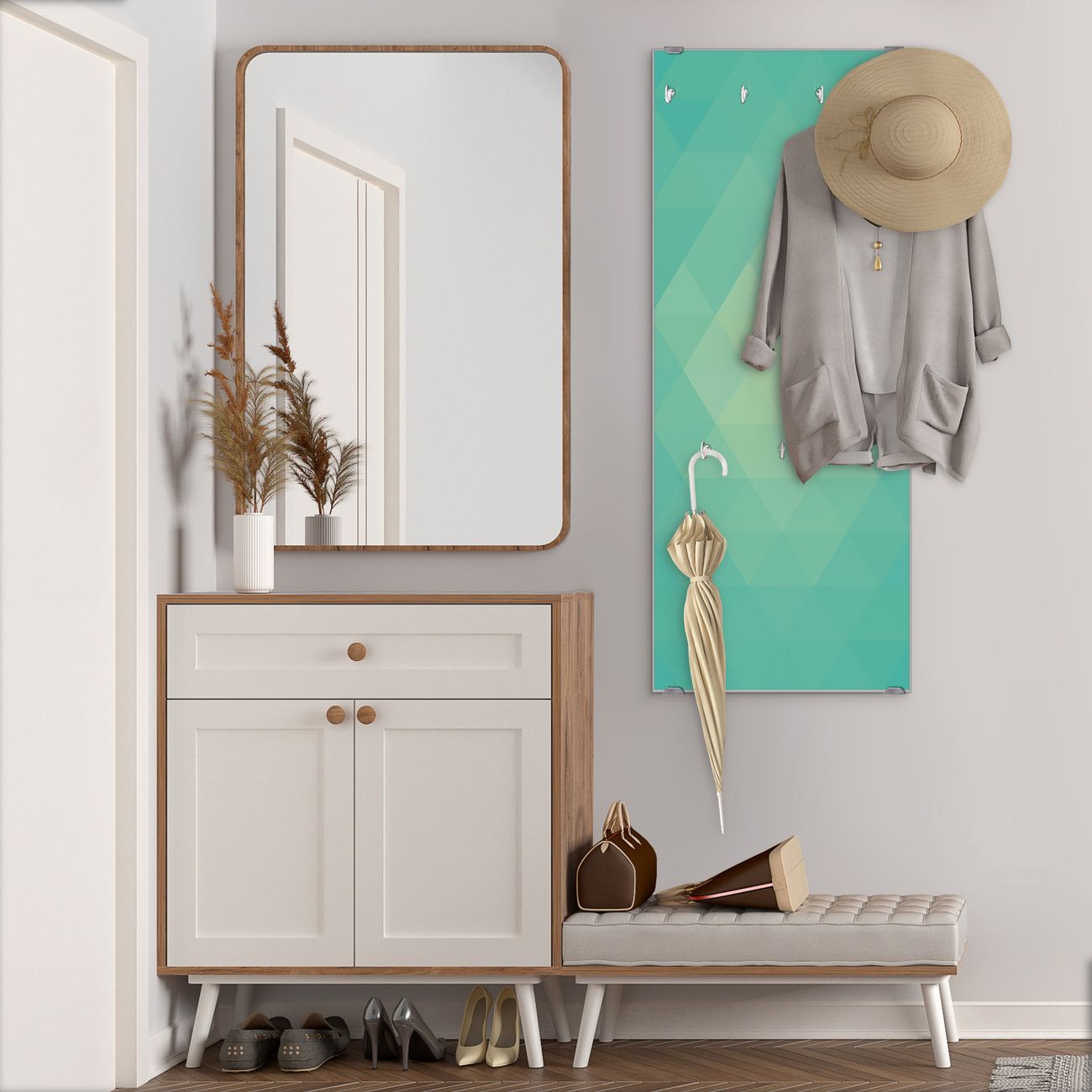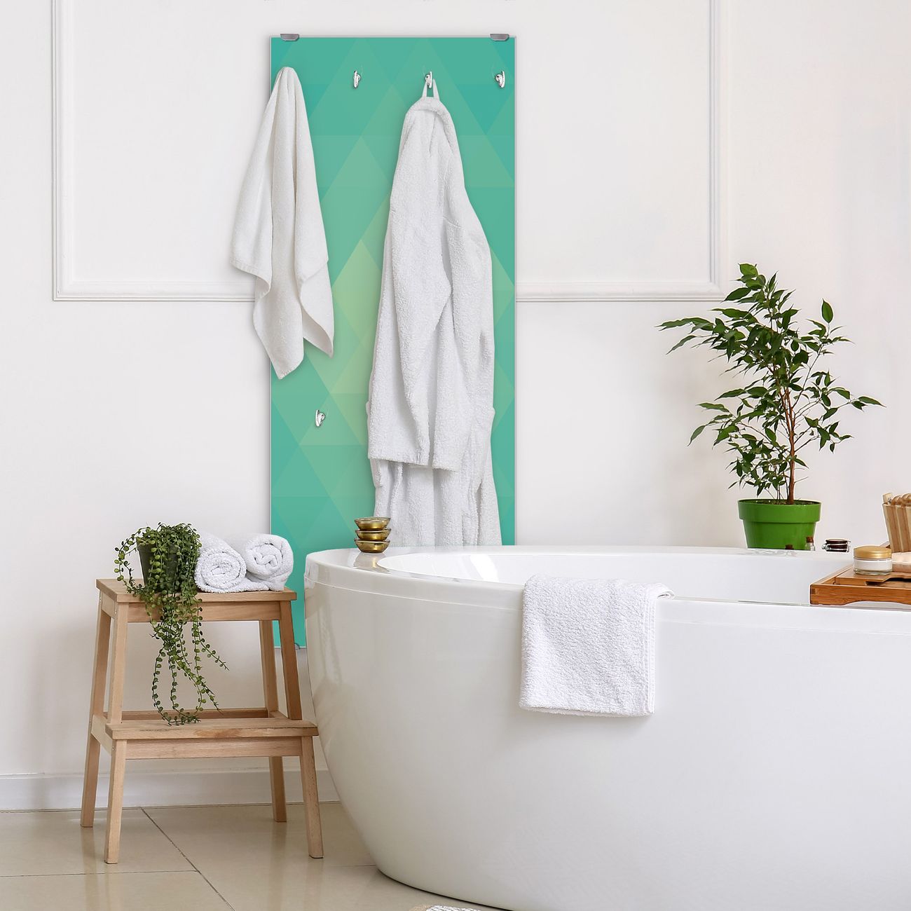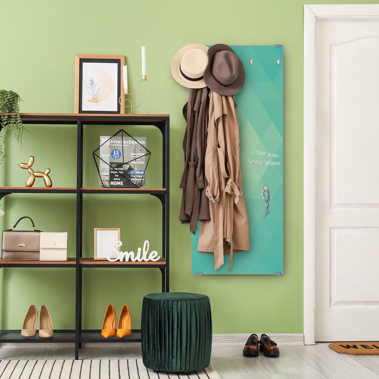 FUNKTION: Die banjado Wandgarderobe mit Motiv Meeresblau ist Ihr täglicher Begleiter. Zuverlässig hängen hier Ihre Jacken und Mäntel griffbereit. Das Echtglas ist Ihr Paneel auch beschreibbar und wieder abwischbar. DESIGN: Sie erhalten eine Garderobenleiste aus elegantem Echtglas mit dem Farbbrillanten Motiv Meeresblau hinterklebt. Das Design ist zeitlos klassisch, ohne dabei auf Funktionalität zu verzichten. Suchen Sie aus einer Vielzahl von Motiven das für Ihre Einrichtung Passende aus. DETAILS: Die Flurgarderobe besteht aus 4mm gehärtetem Sicherheitsglas. Sie ist 50cm breit, 125cm hoch und 6cm tief. Die Garderobenhaken zur Selbstmontage präsentieren sich in Edelstahl-Optik, ebenso die Abstandshalter für die Wandmontage. Ihre neue Garderobe ist sofort einsatzbereit. NUTZEN: Ihre neue Garderobe hält nicht nur zuverlässig Ihre Kleidung, sie ist auch optisch ein Blickfang. Durch das Glas können Sie an der Garderobe mit wasserlöslichen Kreidestiften oder Whiteboard-Markern auch Nachrichten hinterlassen. BANJADO: Wir sind ein kleines kreatives Team aus Sachsen und entwickeln Produkte die Design und Funktionalität verbinden sollen. Viel Freude mit Ihrer neuen Garderobe wünscht das banjado-Team!
