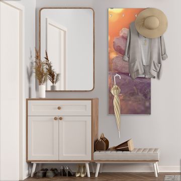 FUNKTION: Die banjado Wandgarderobe mit Motiv Mein Ort ist Ihr täglicher Begleiter. Zuverlässig hängen hier Ihre Jacken und Mäntel griffbereit. Das Echtglas ist Ihr Paneel auch beschreibbar und wieder abwischbar. DESIGN: Sie erhalten eine Garderobenleiste aus elegantem Echtglas mit dem Farbbrillanten Motiv Mein Ort hinterklebt. Das Design ist zeitlos klassisch, ohne dabei auf Funktionalität zu verzichten. Suchen Sie aus einer Vielzahl von Motiven das für Ihre Einrichtung Passende aus. DETAILS: Die Flurgarderobe besteht aus 4mm gehärtetem Sicherheitsglas. Sie ist 50cm breit, 125cm hoch und 6cm tief. Die Garderobenhaken zur Selbstmontage präsentieren sich in Edelstahl-Optik, ebenso die Abstandshalter für die Wandmontage. Ihre neue Garderobe ist sofort einsatzbereit. NUTZEN: Ihre neue Garderobe hält nicht nur zuverlässig Ihre Kleidung, sie ist auch optisch ein Blickfang. Durch das Glas können Sie an der Garderobe mit wasserlöslichen Kreidestiften oder Whiteboard-Markern auch Nachrichten hinterlassen. BANJADO: Wir sind ein kleines kreatives Team aus Sachsen und entwickeln Produkte die Design und Funktionalität verbinden sollen. Viel Freude mit Ihrer neuen Garderobe wünscht das banjado-Team!