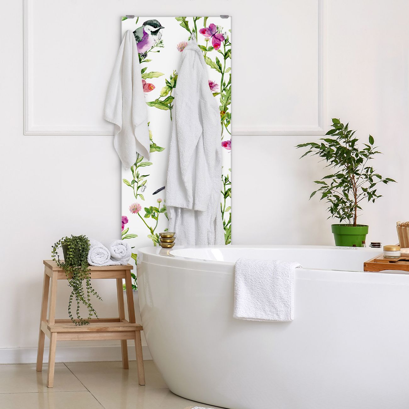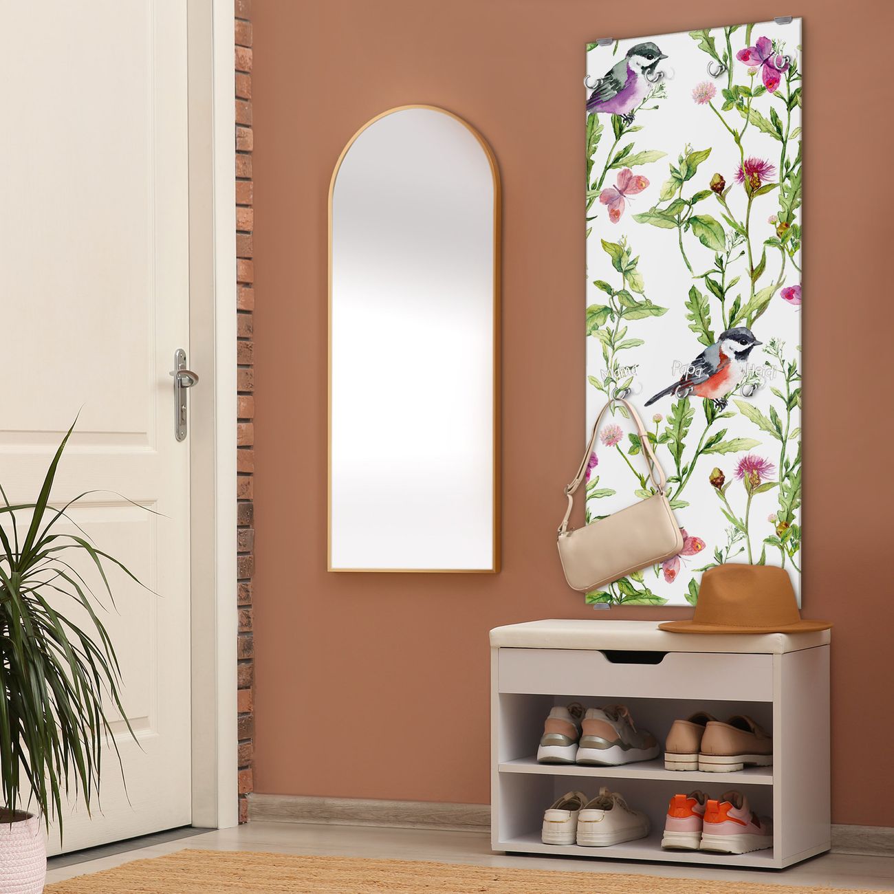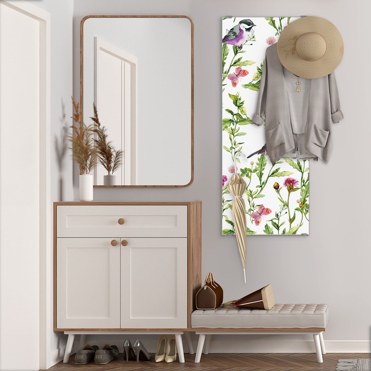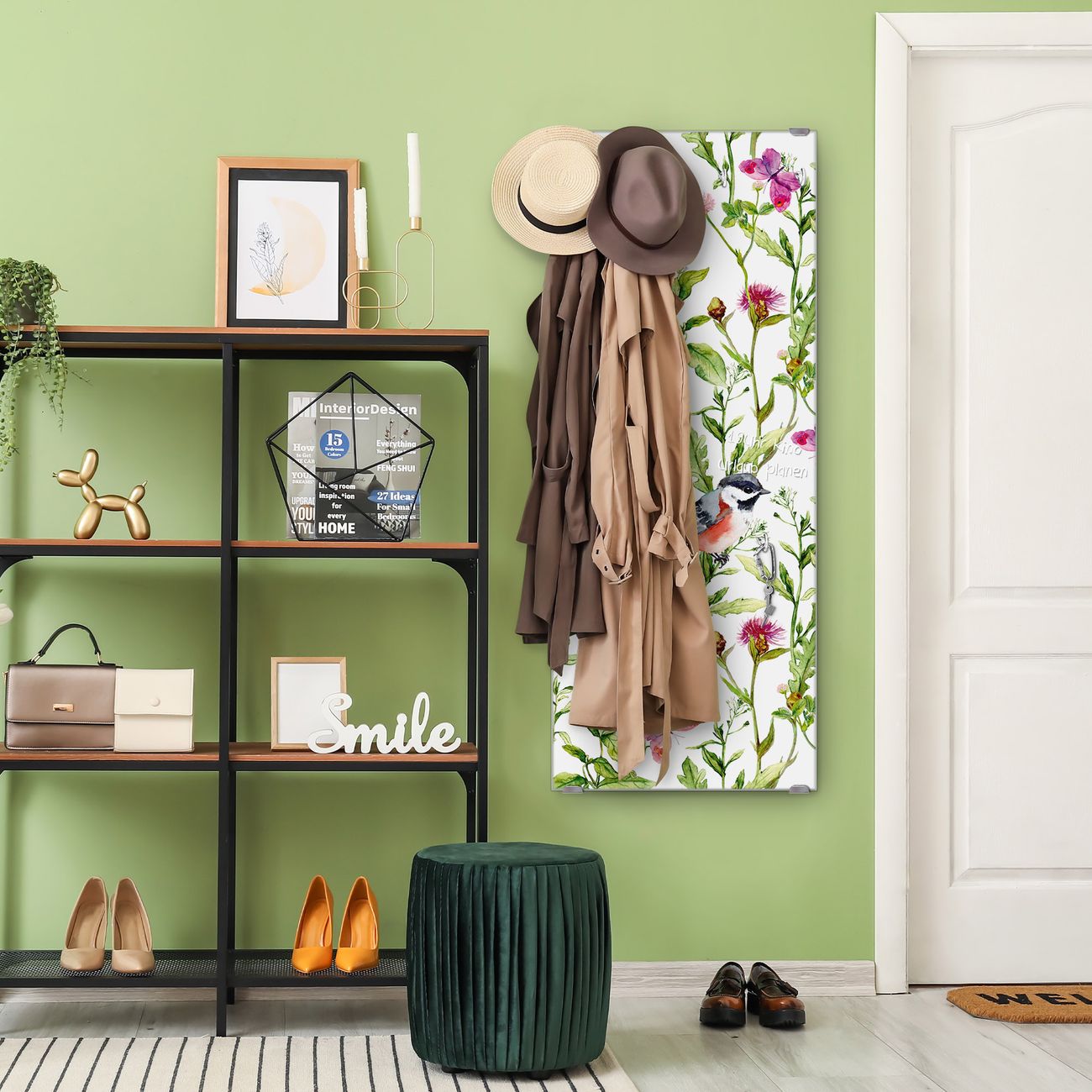FUNKTION: Die banjado Wandgarderobe mit Motiv Meisen im Klee ist Ihr täglicher Begleiter. Zuverlässig hängen hier Ihre Jacken und Mäntel griffbereit. Das Echtglas ist Ihr Paneel auch beschreibbar und wieder abwischbar. DESIGN: Sie erhalten eine Garderobenleiste aus elegantem Echtglas mit dem Farbbrillanten Motiv Meisen im Klee hinterklebt. Das Design ist zeitlos klassisch, ohne dabei auf Funktionalität zu verzichten. Suchen Sie aus einer Vielzahl von Motiven das für Ihre Einrichtung Passende aus. DETAILS: Die Flurgarderobe besteht aus 4mm gehärtetem Sicherheitsglas. Sie ist 50cm breit, 125cm hoch und 6cm tief. Die Garderobenhaken zur Selbstmontage präsentieren sich in Edelstahl-Optik, ebenso die Abstandshalter für die Wandmontage. Ihre neue Garderobe ist sofort einsatzbereit. NUTZEN: Ihre neue Garderobe hält nicht nur zuverlässig Ihre Kleidung, sie ist auch optisch ein Blickfang. Durch das Glas können Sie an der Garderobe mit wasserlöslichen Kreidestiften oder Whiteboard-Markern auch Nachrichten hinterlassen. BANJADO: Wir sind ein kleines kreatives Team aus Sachsen und entwickeln Produkte die Design und Funktionalität verbinden sollen. Viel Freude mit Ihrer neuen Garderobe wünscht das banjado-Team!