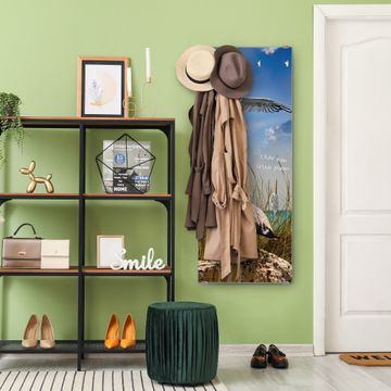FUNKTION: Die banjado Wandgarderobe mit Motiv Möwen ist Ihr täglicher Begleiter. Zuverlässig hängen hier Ihre Jacken und Mäntel griffbereit. Das Echtglas ist Ihr Paneel auch beschreibbar und wieder abwischbar. DESIGN: Sie erhalten eine Garderobenleiste aus elegantem Echtglas mit dem Farbbrillanten Motiv Möwen hinterklebt. Das Design ist zeitlos klassisch, ohne dabei auf Funktionalität zu verzichten. Suchen Sie aus einer Vielzahl von Motiven das für Ihre Einrichtung Passende aus. DETAILS: Die Flurgarderobe besteht aus 4mm gehärtetem Sicherheitsglas. Sie ist 50cm breit, 125cm hoch und 6cm tief. Die Garderobenhaken zur Selbstmontage präsentieren sich in Edelstahl-Optik, ebenso die Abstandshalter für die Wandmontage. Ihre neue Garderobe ist sofort einsatzbereit. NUTZEN: Ihre neue Garderobe hält nicht nur zuverlässig Ihre Kleidung, sie ist auch optisch ein Blickfang. Durch das Glas können Sie an der Garderobe mit wasserlöslichen Kreidestiften oder Whiteboard-Markern auch Nachrichten hinterlassen. BANJADO: Wir sind ein kleines kreatives Team aus Sachsen und entwickeln Produkte die Design und Funktionalität verbinden sollen. Viel Freude mit Ihrer neuen Garderobe wünscht das banjado-Team!