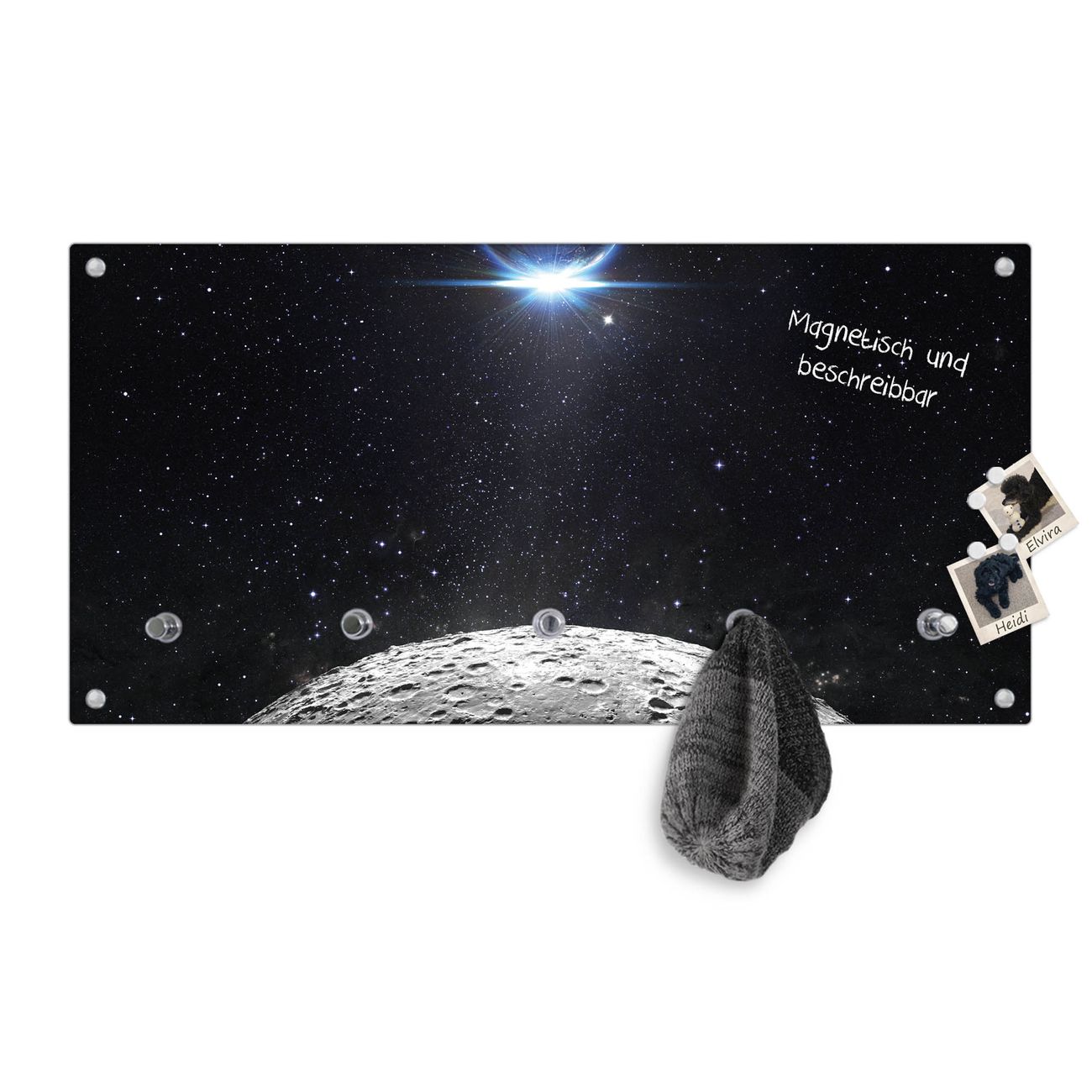 Bitte beachten Sie, dass an dieser Garderobe nur starke Neodym-Magnete halten! FUNKTION: Die banjado Wandgarderobe mit Motiv Mondlandschaft ist Ihr täglicher Begleiter. Zuverlässig hängen hier Ihre Jacken und Mäntel griffbereit. Gleichzeitig ist die Design Garderobe magnetisch, Sie können Notizen anheften und durch das Echtglas ist Ihr Paneel auch beschreibbar und wieder abwischbar. DESIGN: Sie erhalten eine Garderobenleiste aus elegantem Echtglas mit dem Farbbrillanten Motiv Mondlandschaft hinterklebt. Das Design ist zeitlos klassisch, ohne dabei auf Funktionalität zu verzichten. Suchen Sie aus einer Vielzahl von Motiven das für Ihre Einrichtung Passende aus. DETAILS: Die Flurgarderobe besteht aus 4mm gehärtetem Sicherheitsglas. Sie ist 80cm breit, 40cm hoch und 6cm tief. Die Garderobenhaken zur Selbstmontage präsentieren sich in Edelstahl-Optik, ebenso die Abstandshalter für die Wandmontage. Ihre neue Garderobe ist sofort einsatzbereit. NUTZEN: Ihre neue Garderobe hält nicht nur zuverlässig Ihre Kleidung, sie ist auch optisch ein Blickfang. Durch die magnetische Wirkung können Sie mit 4 beigefügten extrastarken Neodym-Magneten Notizen anheften und mit wasserlöslichen Kreidestiften oder Whiteboard-Markern auch Nachrichten hinterlassen. BANJADO: Wir sind ein kleines kreatives Team aus Sachsen und entwickeln Produkte die Design und Funktionalität verbinden sollen. Viel Freude mit Ihrer neuen Garderobe wünscht das banjado-Team!
