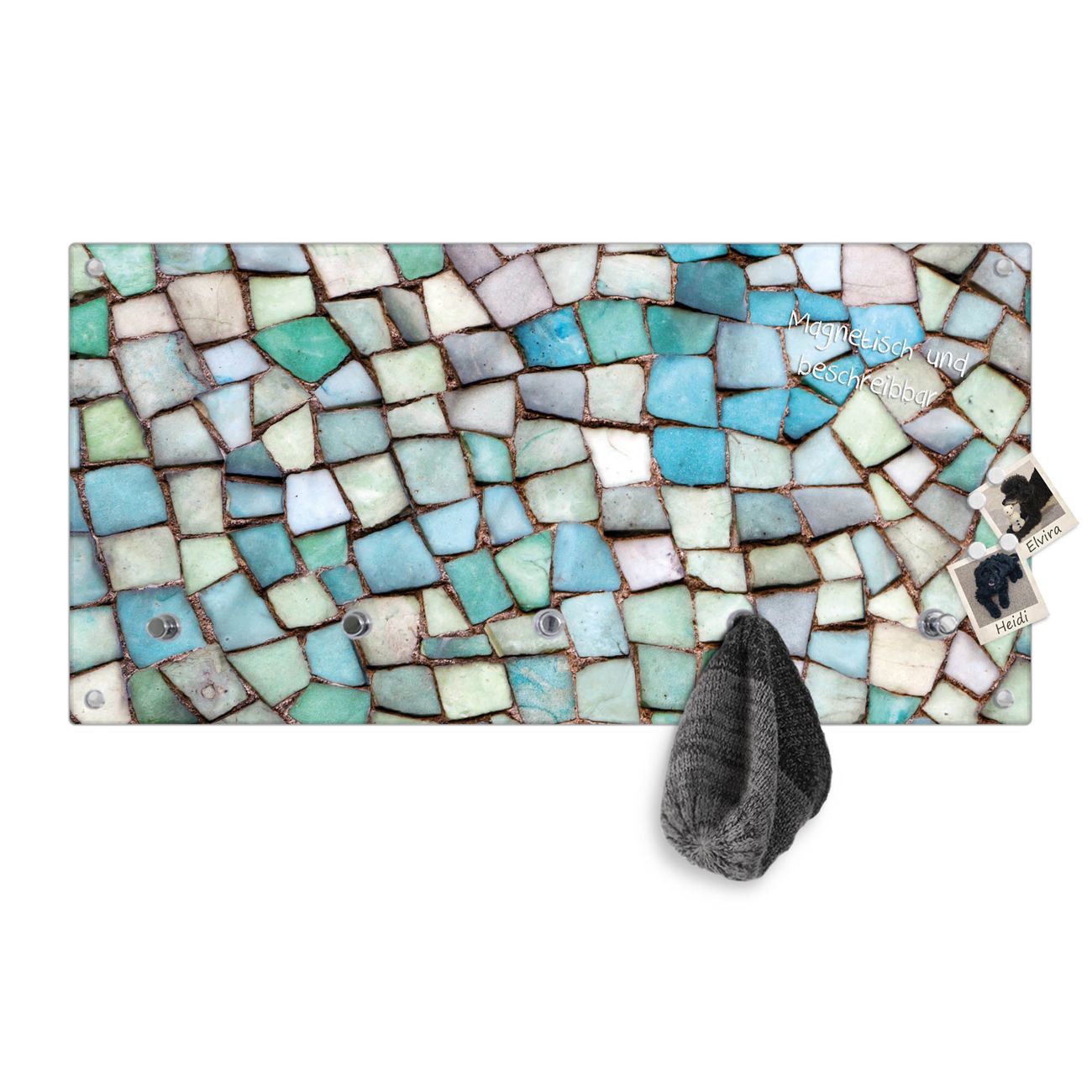 Bitte beachten Sie, dass an dieser Garderobe nur starke Neodym-Magnete halten! FUNKTION: Die banjado Wandgarderobe mit Motiv Mosaik Blau ist Ihr täglicher Begleiter. Zuverlässig hängen hier Ihre Jacken und Mäntel griffbereit. Gleichzeitig ist die Design Garderobe magnetisch, Sie können Notizen anheften und durch das Echtglas ist Ihr Paneel auch beschreibbar und wieder abwischbar. DESIGN: Sie erhalten eine Garderobenleiste aus elegantem Echtglas mit dem Farbbrillanten Motiv Mosaik Blau hinterklebt. Das Design ist zeitlos klassisch, ohne dabei auf Funktionalität zu verzichten. Suchen Sie aus einer Vielzahl von Motiven das für Ihre Einrichtung Passende aus. DETAILS: Die Flurgarderobe besteht aus 4mm gehärtetem Sicherheitsglas. Sie ist 80cm breit, 40cm hoch und 6cm tief. Die Garderobenhaken zur Selbstmontage präsentieren sich in Edelstahl-Optik, ebenso die Abstandshalter für die Wandmontage. Ihre neue Garderobe ist sofort einsatzbereit. NUTZEN: Ihre neue Garderobe hält nicht nur zuverlässig Ihre Kleidung, sie ist auch optisch ein Blickfang. Durch die magnetische Wirkung können Sie mit 4 beigefügten extrastarken Neodym-Magneten Notizen anheften und mit wasserlöslichen Kreidestiften oder Whiteboard-Markern auch Nachrichten hinterlassen. BANJADO: Wir sind ein kleines kreatives Team aus Sachsen und entwickeln Produkte die Design und Funktionalität verbinden sollen. Viel Freude mit Ihrer neuen Garderobe wünscht das banjado-Team!