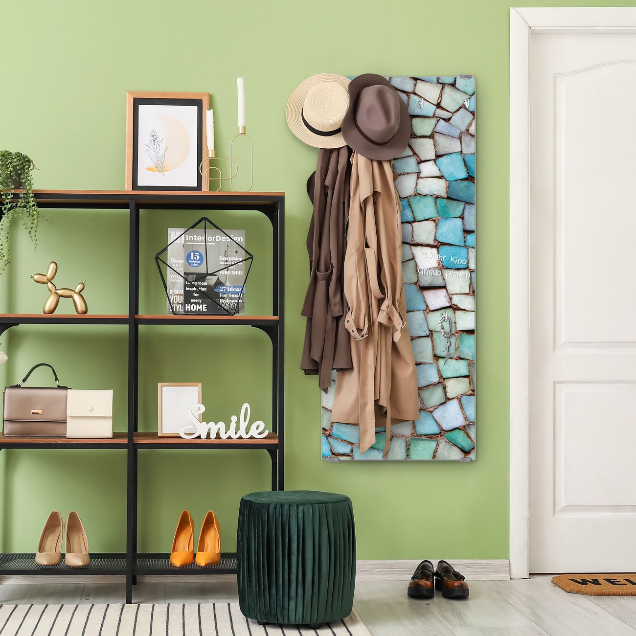 FUNKTION: Die banjado Wandgarderobe mit Motiv Mosaik Blau ist Ihr täglicher Begleiter. Zuverlässig hängen hier Ihre Jacken und Mäntel griffbereit. Das Echtglas ist Ihr Paneel auch beschreibbar und wieder abwischbar. DESIGN: Sie erhalten eine Garderobenleiste aus elegantem Echtglas mit dem Farbbrillanten Motiv Mosaik Blau hinterklebt. Das Design ist zeitlos klassisch, ohne dabei auf Funktionalität zu verzichten. Suchen Sie aus einer Vielzahl von Motiven das für Ihre Einrichtung Passende aus. DETAILS: Die Flurgarderobe besteht aus 4mm gehärtetem Sicherheitsglas. Sie ist 50cm breit, 125cm hoch und 6cm tief. Die Garderobenhaken zur Selbstmontage präsentieren sich in Edelstahl-Optik, ebenso die Abstandshalter für die Wandmontage. Ihre neue Garderobe ist sofort einsatzbereit. NUTZEN: Ihre neue Garderobe hält nicht nur zuverlässig Ihre Kleidung, sie ist auch optisch ein Blickfang. Durch das Glas können Sie an der Garderobe mit wasserlöslichen Kreidestiften oder Whiteboard-Markern auch Nachrichten hinterlassen. BANJADO: Wir sind ein kleines kreatives Team aus Sachsen und entwickeln Produkte die Design und Funktionalität verbinden sollen. Viel Freude mit Ihrer neuen Garderobe wünscht das banjado-Team!