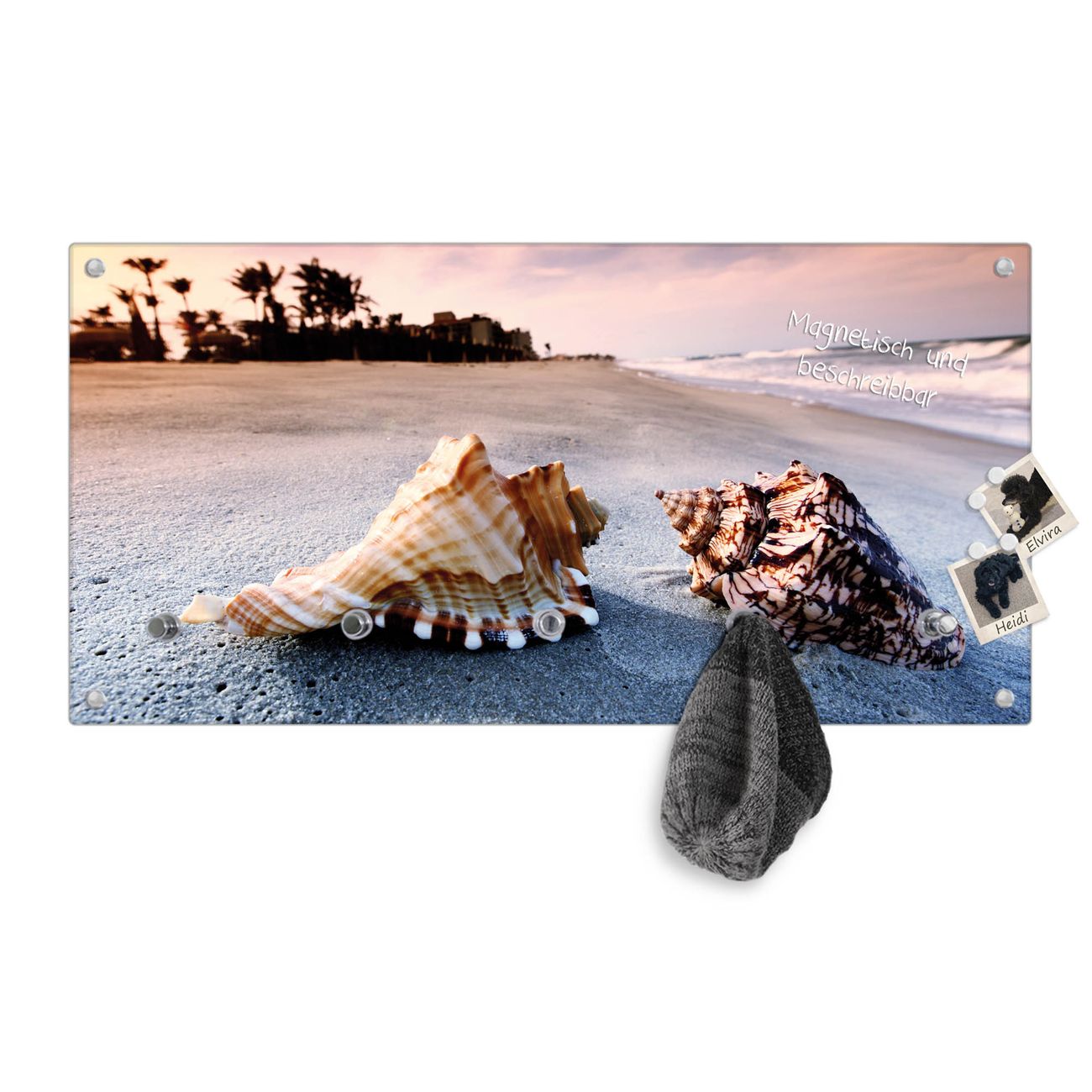 Bitte beachten Sie, dass an dieser Garderobe nur starke Neodym-Magnete halten! FUNKTION: Die banjado Wandgarderobe mit Motiv Muscheln ist Ihr täglicher Begleiter. Zuverlässig hängen hier Ihre Jacken und Mäntel griffbereit. Gleichzeitig ist die Design Garderobe magnetisch, Sie können Notizen anheften und durch das Echtglas ist Ihr Paneel auch beschreibbar und wieder abwischbar. DESIGN: Sie erhalten eine Garderobenleiste aus elegantem Echtglas mit dem Farbbrillanten Motiv Muscheln hinterklebt. Das Design ist zeitlos klassisch, ohne dabei auf Funktionalität zu verzichten. Suchen Sie aus einer Vielzahl von Motiven das für Ihre Einrichtung Passende aus. DETAILS: Die Flurgarderobe besteht aus 4mm gehärtetem Sicherheitsglas. Sie ist 80cm breit, 40cm hoch und 6cm tief. Die Garderobenhaken zur Selbstmontage präsentieren sich in Edelstahl-Optik, ebenso die Abstandshalter für die Wandmontage. Ihre neue Garderobe ist sofort einsatzbereit. NUTZEN: Ihre neue Garderobe hält nicht nur zuverlässig Ihre Kleidung, sie ist auch optisch ein Blickfang. Durch die magnetische Wirkung können Sie mit 4 beigefügten extrastarken Neodym-Magneten Notizen anheften und mit wasserlöslichen Kreidestiften oder Whiteboard-Markern auch Nachrichten hinterlassen. BANJADO: Wir sind ein kleines kreatives Team aus Sachsen und entwickeln Produkte die Design und Funktionalität verbinden sollen. Viel Freude mit Ihrer neuen Garderobe wünscht das banjado-Team!