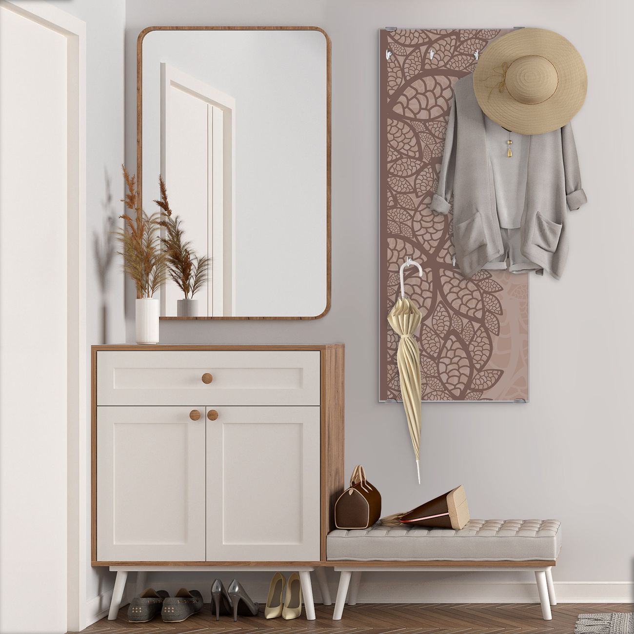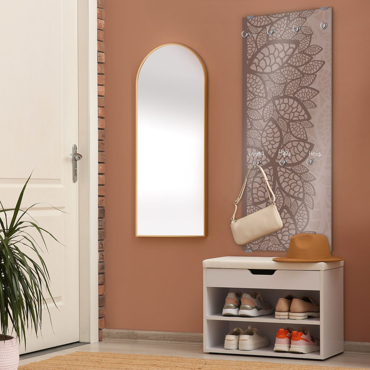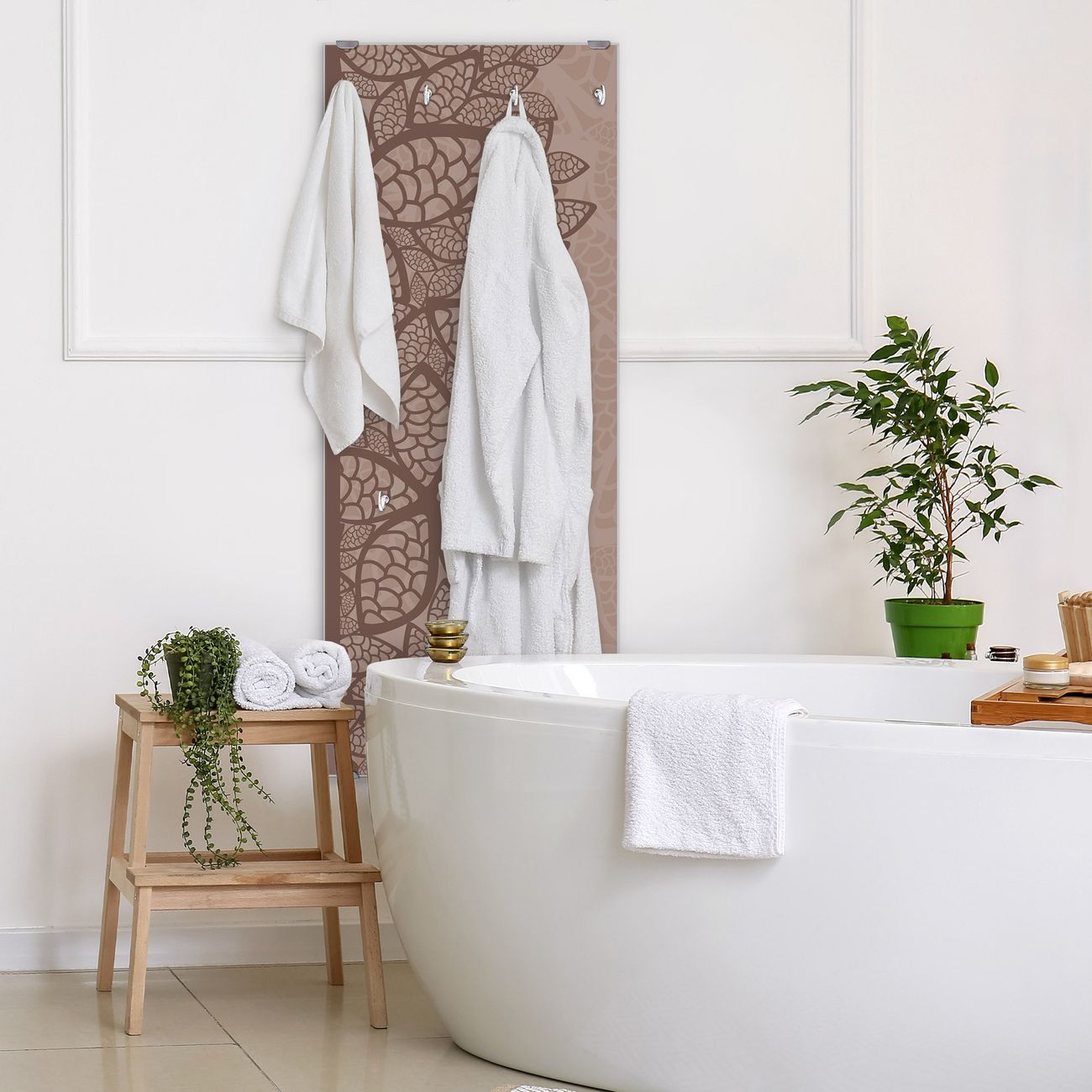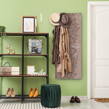 FUNKTION: Die banjado Wandgarderobe mit Motiv Muster Blätter ist Ihr täglicher Begleiter. Zuverlässig hängen hier Ihre Jacken und Mäntel griffbereit. Das Echtglas ist Ihr Paneel auch beschreibbar und wieder abwischbar. DESIGN: Sie erhalten eine Garderobenleiste aus elegantem Echtglas mit dem Farbbrillanten Motiv Muster Blätter hinterklebt. Das Design ist zeitlos klassisch, ohne dabei auf Funktionalität zu verzichten. Suchen Sie aus einer Vielzahl von Motiven das für Ihre Einrichtung Passende aus. DETAILS: Die Flurgarderobe besteht aus 4mm gehärtetem Sicherheitsglas. Sie ist 50cm breit, 125cm hoch und 6cm tief. Die Garderobenhaken zur Selbstmontage präsentieren sich in Edelstahl-Optik, ebenso die Abstandshalter für die Wandmontage. Ihre neue Garderobe ist sofort einsatzbereit. NUTZEN: Ihre neue Garderobe hält nicht nur zuverlässig Ihre Kleidung, sie ist auch optisch ein Blickfang. Durch das Glas können Sie an der Garderobe mit wasserlöslichen Kreidestiften oder Whiteboard-Markern auch Nachrichten hinterlassen. BANJADO: Wir sind ein kleines kreatives Team aus Sachsen und entwickeln Produkte die Design und Funktionalität verbinden sollen. Viel Freude mit Ihrer neuen Garderobe wünscht das banjado-Team!