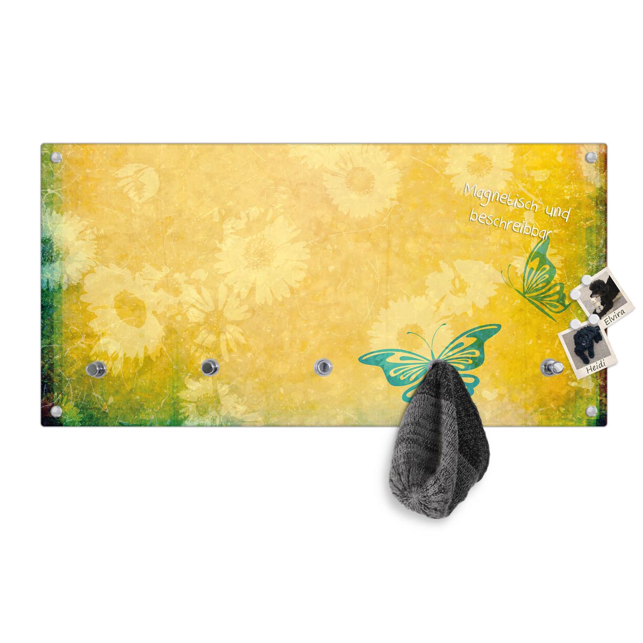 Bitte beachten Sie, dass an dieser Garderobe nur starke Neodym-Magnete halten! FUNKTION: Die banjado Wandgarderobe mit Motiv Muster Sommer ist Ihr täglicher Begleiter. Zuverlässig hängen hier Ihre Jacken und Mäntel griffbereit. Gleichzeitig ist die Design Garderobe magnetisch, Sie können Notizen anheften und durch das Echtglas ist Ihr Paneel auch beschreibbar und wieder abwischbar. DESIGN: Sie erhalten eine Garderobenleiste aus elegantem Echtglas mit dem Farbbrillanten Motiv Muster Sommer hinterklebt. Das Design ist zeitlos klassisch, ohne dabei auf Funktionalität zu verzichten. Suchen Sie aus einer Vielzahl von Motiven das für Ihre Einrichtung Passende aus. DETAILS: Die Flurgarderobe besteht aus 4mm gehärtetem Sicherheitsglas. Sie ist 80cm breit, 40cm hoch und 6cm tief. Die Garderobenhaken zur Selbstmontage präsentieren sich in Edelstahl-Optik, ebenso die Abstandshalter für die Wandmontage. Ihre neue Garderobe ist sofort einsatzbereit. NUTZEN: Ihre neue Garderobe hält nicht nur zuverlässig Ihre Kleidung, sie ist auch optisch ein Blickfang. Durch die magnetische Wirkung können Sie mit 4 beigefügten extrastarken Neodym-Magneten Notizen anheften und mit wasserlöslichen Kreidestiften oder Whiteboard-Markern auch Nachrichten hinterlassen. BANJADO: Wir sind ein kleines kreatives Team aus Sachsen und entwickeln Produkte die Design und Funktionalität verbinden sollen. Viel Freude mit Ihrer neuen Garderobe wünscht das banjado-Team!