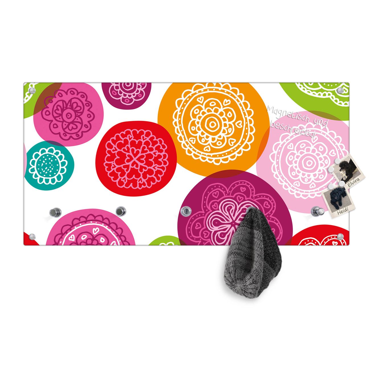 Bitte beachten Sie, dass an dieser Garderobe nur starke Neodym-Magnete halten! FUNKTION: Die banjado Wandgarderobe mit Motiv Naive Blüten ist Ihr täglicher Begleiter. Zuverlässig hängen hier Ihre Jacken und Mäntel griffbereit. Gleichzeitig ist die Design Garderobe magnetisch, Sie können Notizen anheften und durch das Echtglas ist Ihr Paneel auch beschreibbar und wieder abwischbar. DESIGN: Sie erhalten eine Garderobenleiste aus elegantem Echtglas mit dem Farbbrillanten Motiv Naive Blüten hinterklebt. Das Design ist zeitlos klassisch, ohne dabei auf Funktionalität zu verzichten. Suchen Sie aus einer Vielzahl von Motiven das für Ihre Einrichtung Passende aus. DETAILS: Die Flurgarderobe besteht aus 4mm gehärtetem Sicherheitsglas. Sie ist 80cm breit, 40cm hoch und 6cm tief. Die Garderobenhaken zur Selbstmontage präsentieren sich in Edelstahl-Optik, ebenso die Abstandshalter für die Wandmontage. Ihre neue Garderobe ist sofort einsatzbereit. NUTZEN: Ihre neue Garderobe hält nicht nur zuverlässig Ihre Kleidung, sie ist auch optisch ein Blickfang. Durch die magnetische Wirkung können Sie mit 4 beigefügten extrastarken Neodym-Magneten Notizen anheften und mit wasserlöslichen Kreidestiften oder Whiteboard-Markern auch Nachrichten hinterlassen. BANJADO: Wir sind ein kleines kreatives Team aus Sachsen und entwickeln Produkte die Design und Funktionalität verbinden sollen. Viel Freude mit Ihrer neuen Garderobe wünscht das banjado-Team!