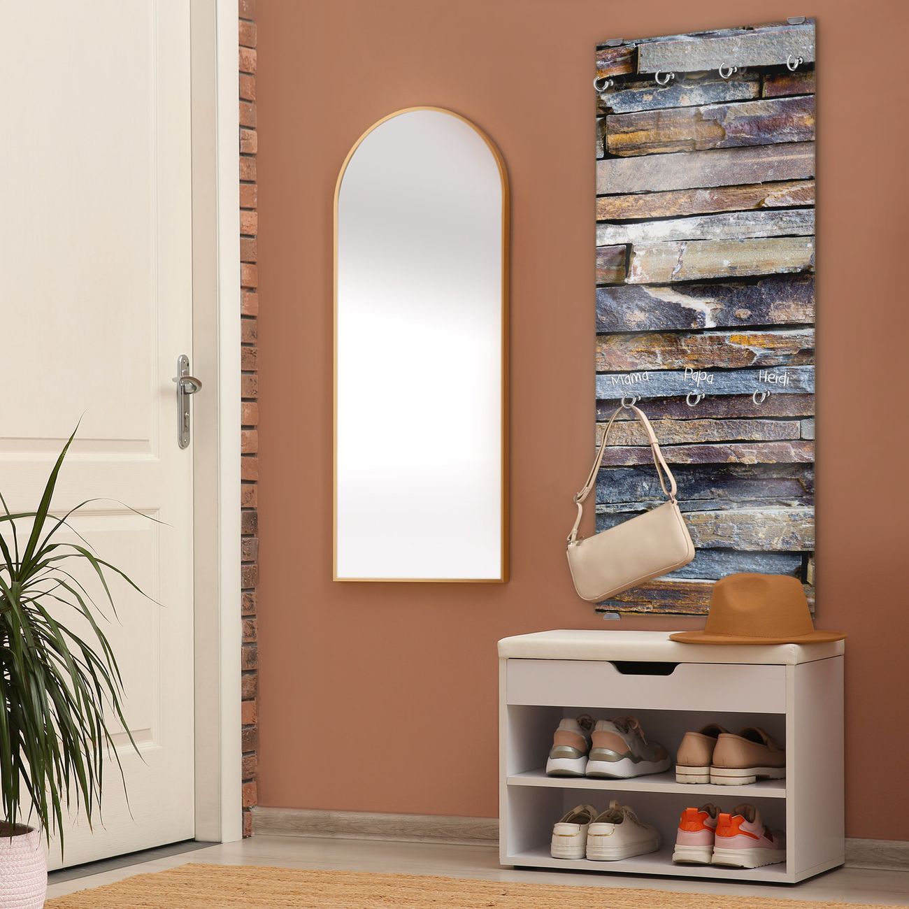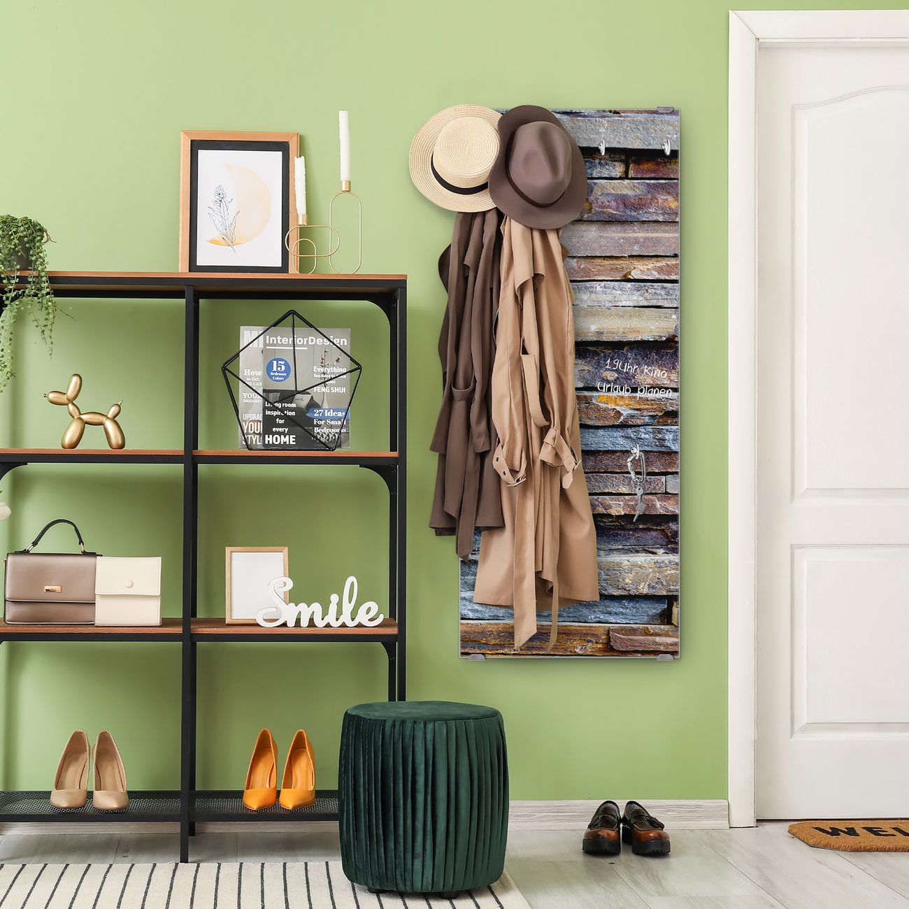FUNKTION: Die banjado Wandgarderobe mit Motiv Naturstein ist Ihr täglicher Begleiter. Zuverlässig hängen hier Ihre Jacken und Mäntel griffbereit. Das Echtglas ist Ihr Paneel auch beschreibbar und wieder abwischbar. DESIGN: Sie erhalten eine Garderobenleiste aus elegantem Echtglas mit dem Farbbrillanten Motiv Naturstein hinterklebt. Das Design ist zeitlos klassisch, ohne dabei auf Funktionalität zu verzichten. Suchen Sie aus einer Vielzahl von Motiven das für Ihre Einrichtung Passende aus. DETAILS: Die Flurgarderobe besteht aus 4mm gehärtetem Sicherheitsglas. Sie ist 50cm breit, 125cm hoch und 6cm tief. Die Garderobenhaken zur Selbstmontage präsentieren sich in Edelstahl-Optik, ebenso die Abstandshalter für die Wandmontage. Ihre neue Garderobe ist sofort einsatzbereit. NUTZEN: Ihre neue Garderobe hält nicht nur zuverlässig Ihre Kleidung, sie ist auch optisch ein Blickfang. Durch das Glas können Sie an der Garderobe mit wasserlöslichen Kreidestiften oder Whiteboard-Markern auch Nachrichten hinterlassen. BANJADO: Wir sind ein kleines kreatives Team aus Sachsen und entwickeln Produkte die Design und Funktionalität verbinden sollen. Viel Freude mit Ihrer neuen Garderobe wünscht das banjado-Team!