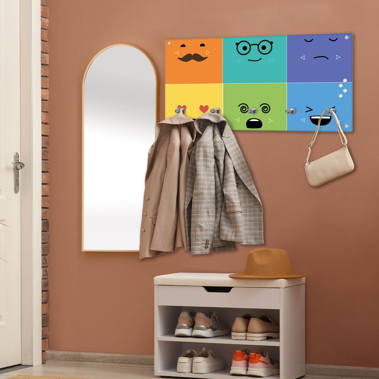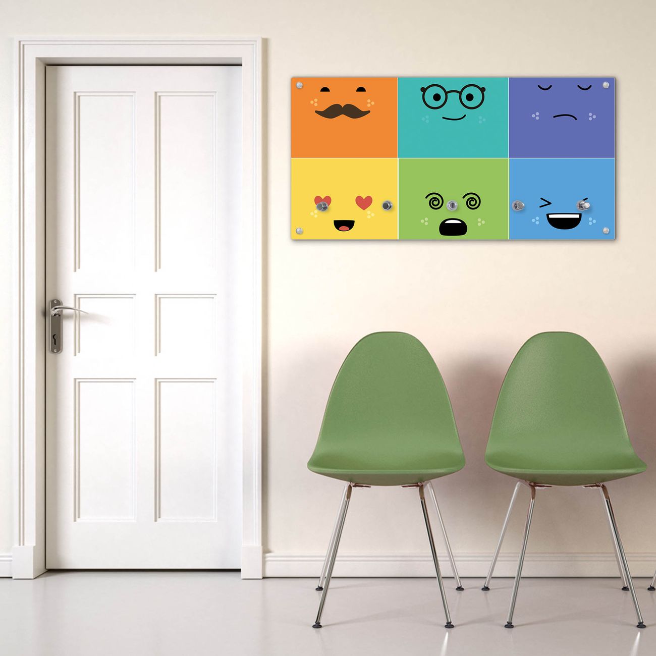 Bitte beachten Sie, dass an dieser Garderobe nur starke Neodym-Magnete halten! FUNKTION: Die banjado Wandgarderobe mit Motiv Neun Keinenasen ist Ihr täglicher Begleiter. Zuverlässig hängen hier Ihre Jacken und Mäntel griffbereit. Gleichzeitig ist die Design Garderobe magnetisch, Sie können Notizen anheften und durch das Echtglas ist Ihr Paneel auch beschreibbar und wieder abwischbar. DESIGN: Sie erhalten eine Garderobenleiste aus elegantem Echtglas mit dem Farbbrillanten Motiv Neun Keinenasen hinterklebt. Das Design ist zeitlos klassisch, ohne dabei auf Funktionalität zu verzichten. Suchen Sie aus einer Vielzahl von Motiven das für Ihre Einrichtung Passende aus. DETAILS: Die Flurgarderobe besteht aus 4mm gehärtetem Sicherheitsglas. Sie ist 80cm breit, 40cm hoch und 6cm tief. Die Garderobenhaken zur Selbstmontage präsentieren sich in Edelstahl-Optik, ebenso die Abstandshalter für die Wandmontage. Ihre neue Garderobe ist sofort einsatzbereit. NUTZEN: Ihre neue Garderobe hält nicht nur zuverlässig Ihre Kleidung, sie ist auch optisch ein Blickfang. Durch die magnetische Wirkung können Sie mit 4 beigefügten extrastarken Neodym-Magneten Notizen anheften und mit wasserlöslichen Kreidestiften oder Whiteboard-Markern auch Nachrichten hinterlassen. BANJADO: Wir sind ein kleines kreatives Team aus Sachsen und entwickeln Produkte die Design und Funktionalität verbinden sollen. Viel Freude mit Ihrer neuen Garderobe wünscht das banjado-Team!