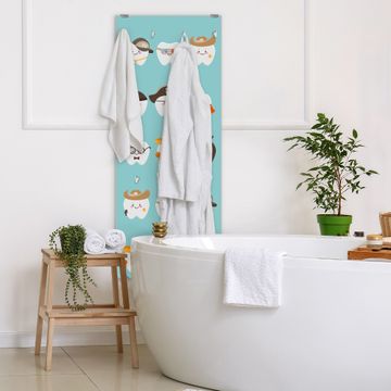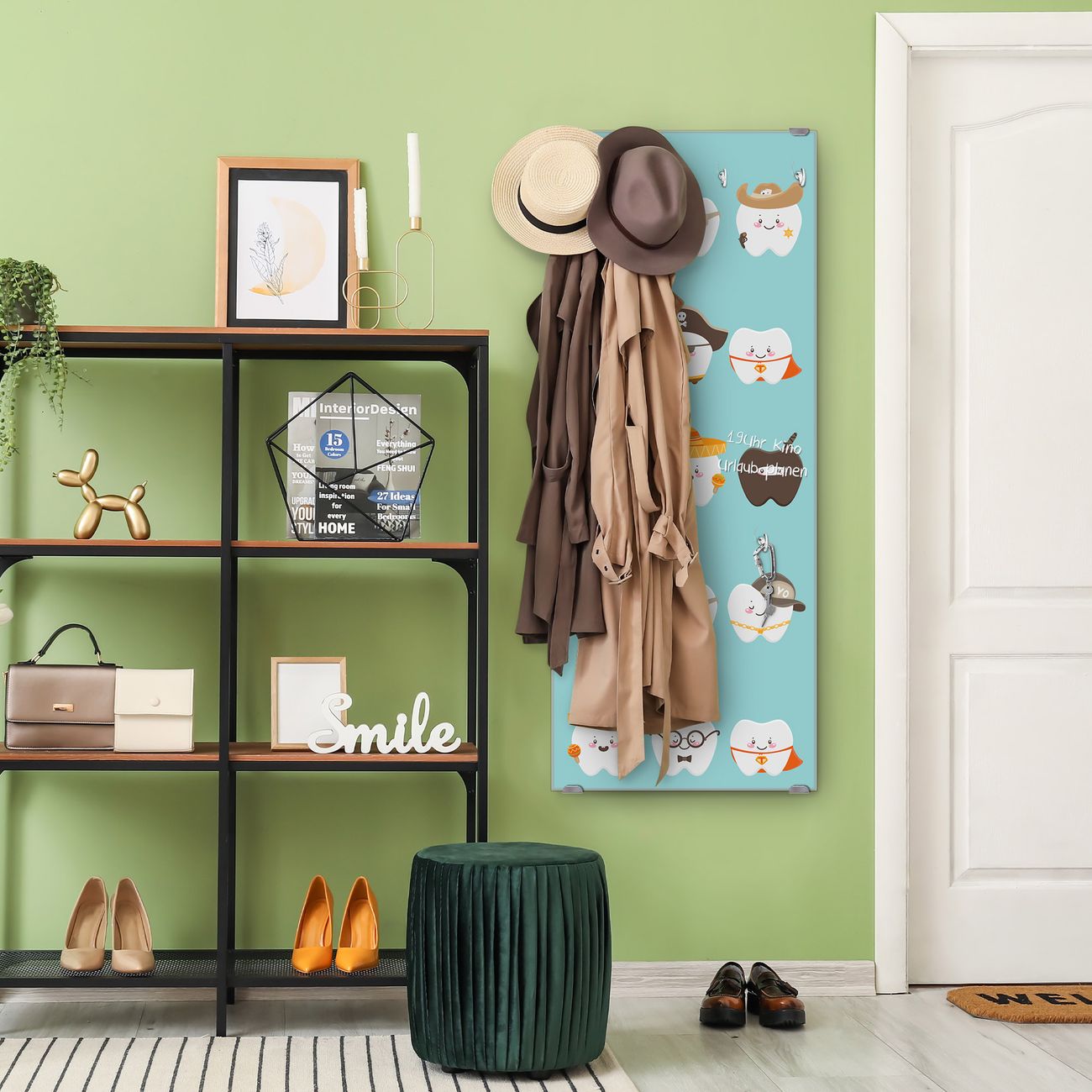 FUNKTION: Die banjado Wandgarderobe mit Motiv Neun Zähne ist Ihr täglicher Begleiter. Zuverlässig hängen hier Ihre Jacken und Mäntel griffbereit. Das Echtglas ist Ihr Paneel auch beschreibbar und wieder abwischbar. DESIGN: Sie erhalten eine Garderobenleiste aus elegantem Echtglas mit dem Farbbrillanten Motiv Neun Zähne hinterklebt. Das Design ist zeitlos klassisch, ohne dabei auf Funktionalität zu verzichten. Suchen Sie aus einer Vielzahl von Motiven das für Ihre Einrichtung Passende aus. DETAILS: Die Flurgarderobe besteht aus 4mm gehärtetem Sicherheitsglas. Sie ist 50cm breit, 125cm hoch und 6cm tief. Die Garderobenhaken zur Selbstmontage präsentieren sich in Edelstahl-Optik, ebenso die Abstandshalter für die Wandmontage. Ihre neue Garderobe ist sofort einsatzbereit. NUTZEN: Ihre neue Garderobe hält nicht nur zuverlässig Ihre Kleidung, sie ist auch optisch ein Blickfang. Durch das Glas können Sie an der Garderobe mit wasserlöslichen Kreidestiften oder Whiteboard-Markern auch Nachrichten hinterlassen. BANJADO: Wir sind ein kleines kreatives Team aus Sachsen und entwickeln Produkte die Design und Funktionalität verbinden sollen. Viel Freude mit Ihrer neuen Garderobe wünscht das banjado-Team!