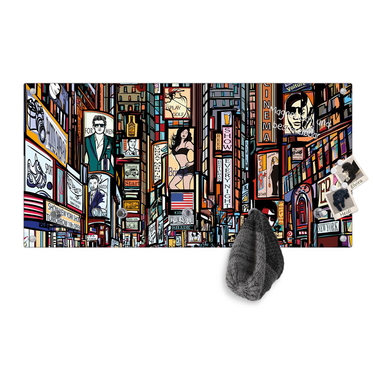 Bitte beachten Sie, dass an dieser Garderobe nur starke Neodym-Magnete halten! FUNKTION: Die banjado Wandgarderobe mit Motiv New York Show ist Ihr täglicher Begleiter. Zuverlässig hängen hier Ihre Jacken und Mäntel griffbereit. Gleichzeitig ist die Design Garderobe magnetisch, Sie können Notizen anheften und durch das Echtglas ist Ihr Paneel auch beschreibbar und wieder abwischbar. DESIGN: Sie erhalten eine Garderobenleiste aus elegantem Echtglas mit dem Farbbrillanten Motiv New York Show hinterklebt. Das Design ist zeitlos klassisch, ohne dabei auf Funktionalität zu verzichten. Suchen Sie aus einer Vielzahl von Motiven das für Ihre Einrichtung Passende aus. DETAILS: Die Flurgarderobe besteht aus 4mm gehärtetem Sicherheitsglas. Sie ist 80cm breit, 40cm hoch und 6cm tief. Die Garderobenhaken zur Selbstmontage präsentieren sich in Edelstahl-Optik, ebenso die Abstandshalter für die Wandmontage. Ihre neue Garderobe ist sofort einsatzbereit. NUTZEN: Ihre neue Garderobe hält nicht nur zuverlässig Ihre Kleidung, sie ist auch optisch ein Blickfang. Durch die magnetische Wirkung können Sie mit 4 beigefügten extrastarken Neodym-Magneten Notizen anheften und mit wasserlöslichen Kreidestiften oder Whiteboard-Markern auch Nachrichten hinterlassen. BANJADO: Wir sind ein kleines kreatives Team aus Sachsen und entwickeln Produkte die Design und Funktionalität verbinden sollen. Viel Freude mit Ihrer neuen Garderobe wünscht das banjado-Team!