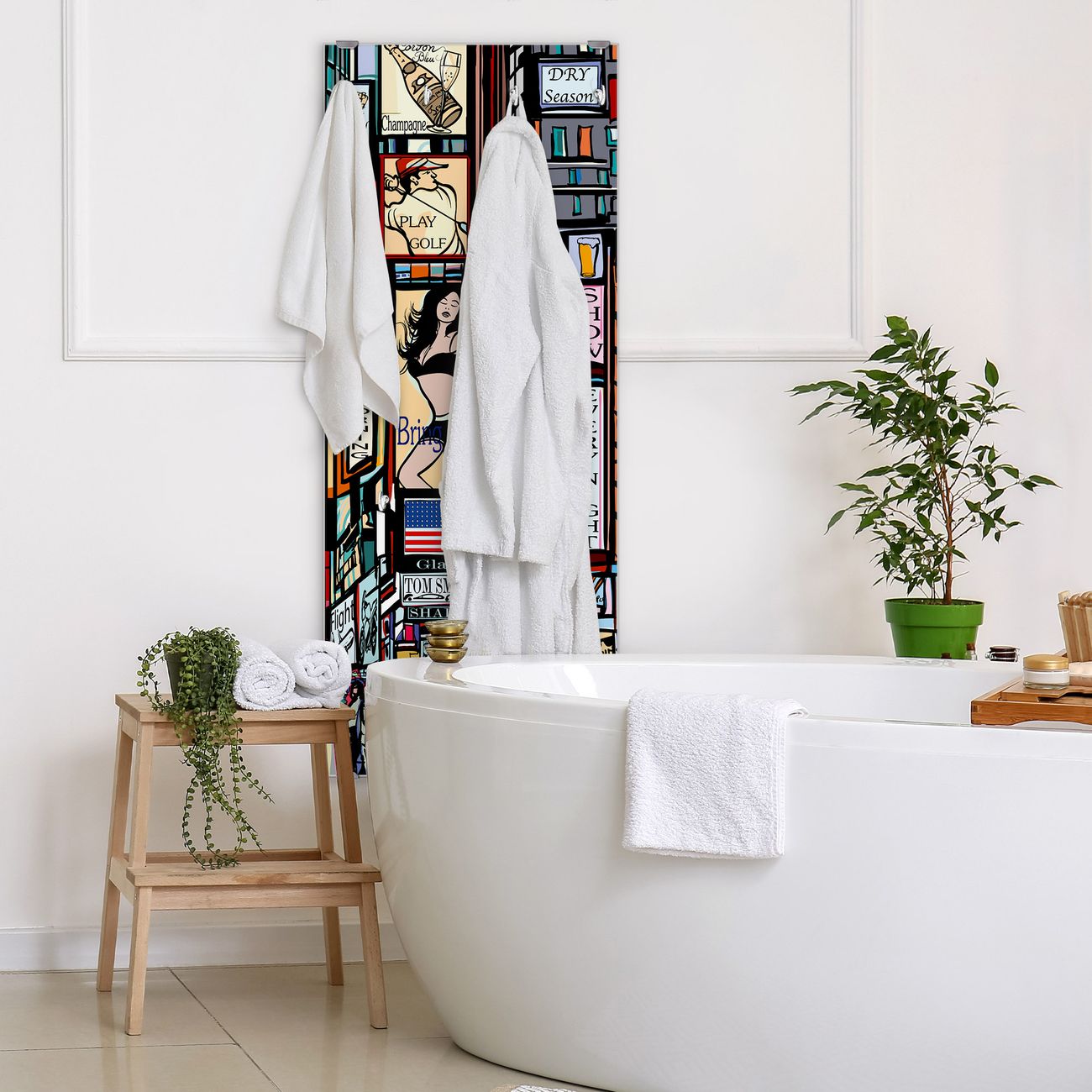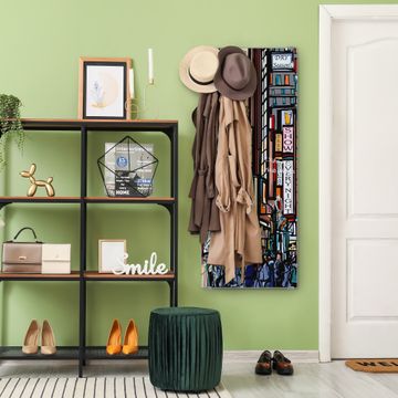 FUNKTION: Die banjado Wandgarderobe mit Motiv New York Show ist Ihr täglicher Begleiter. Zuverlässig hängen hier Ihre Jacken und Mäntel griffbereit. Das Echtglas ist Ihr Paneel auch beschreibbar und wieder abwischbar. DESIGN: Sie erhalten eine Garderobenleiste aus elegantem Echtglas mit dem Farbbrillanten Motiv New York Show hinterklebt. Das Design ist zeitlos klassisch, ohne dabei auf Funktionalität zu verzichten. Suchen Sie aus einer Vielzahl von Motiven das für Ihre Einrichtung Passende aus. DETAILS: Die Flurgarderobe besteht aus 4mm gehärtetem Sicherheitsglas. Sie ist 50cm breit, 125cm hoch und 6cm tief. Die Garderobenhaken zur Selbstmontage präsentieren sich in Edelstahl-Optik, ebenso die Abstandshalter für die Wandmontage. Ihre neue Garderobe ist sofort einsatzbereit. NUTZEN: Ihre neue Garderobe hält nicht nur zuverlässig Ihre Kleidung, sie ist auch optisch ein Blickfang. Durch das Glas können Sie an der Garderobe mit wasserlöslichen Kreidestiften oder Whiteboard-Markern auch Nachrichten hinterlassen. BANJADO: Wir sind ein kleines kreatives Team aus Sachsen und entwickeln Produkte die Design und Funktionalität verbinden sollen. Viel Freude mit Ihrer neuen Garderobe wünscht das banjado-Team!
