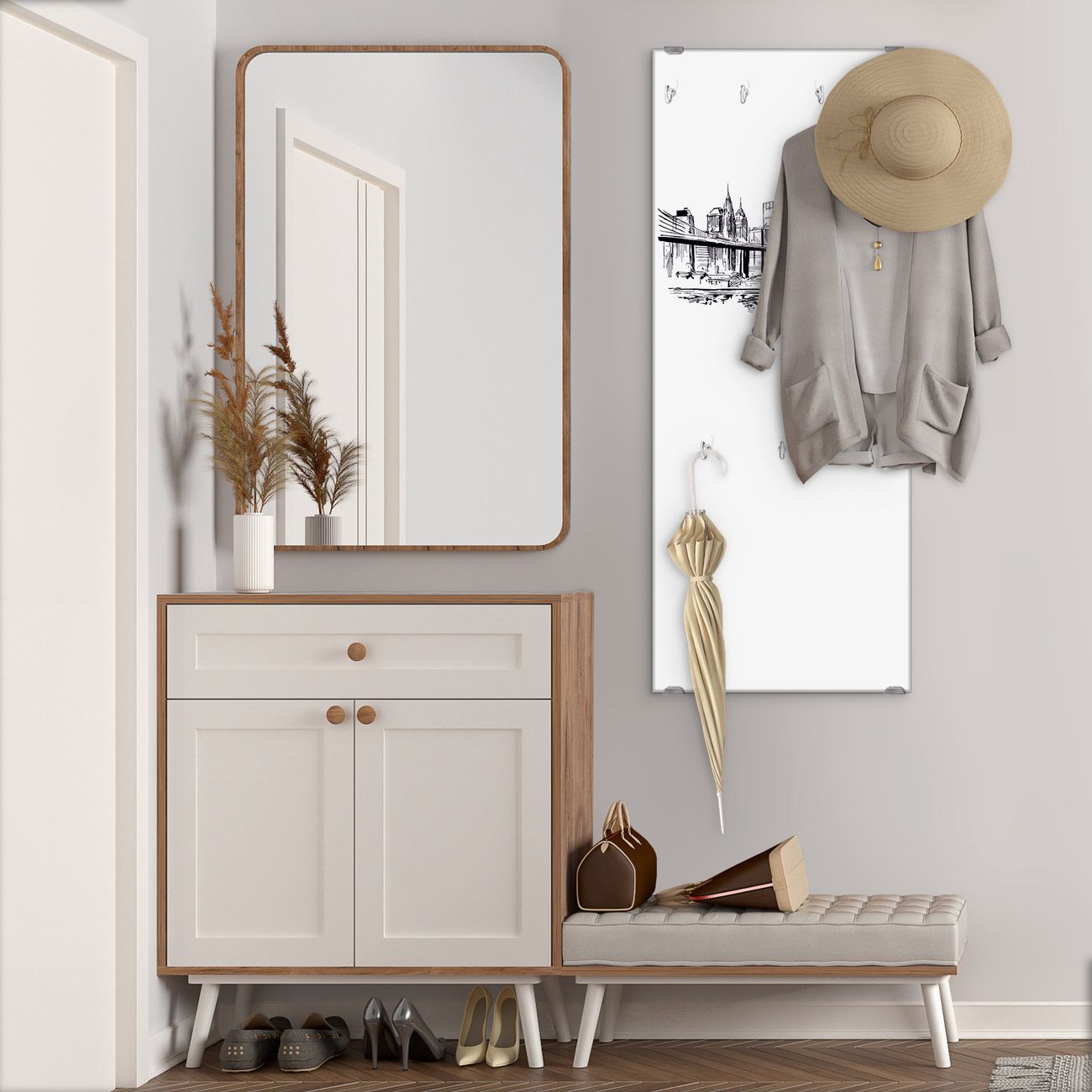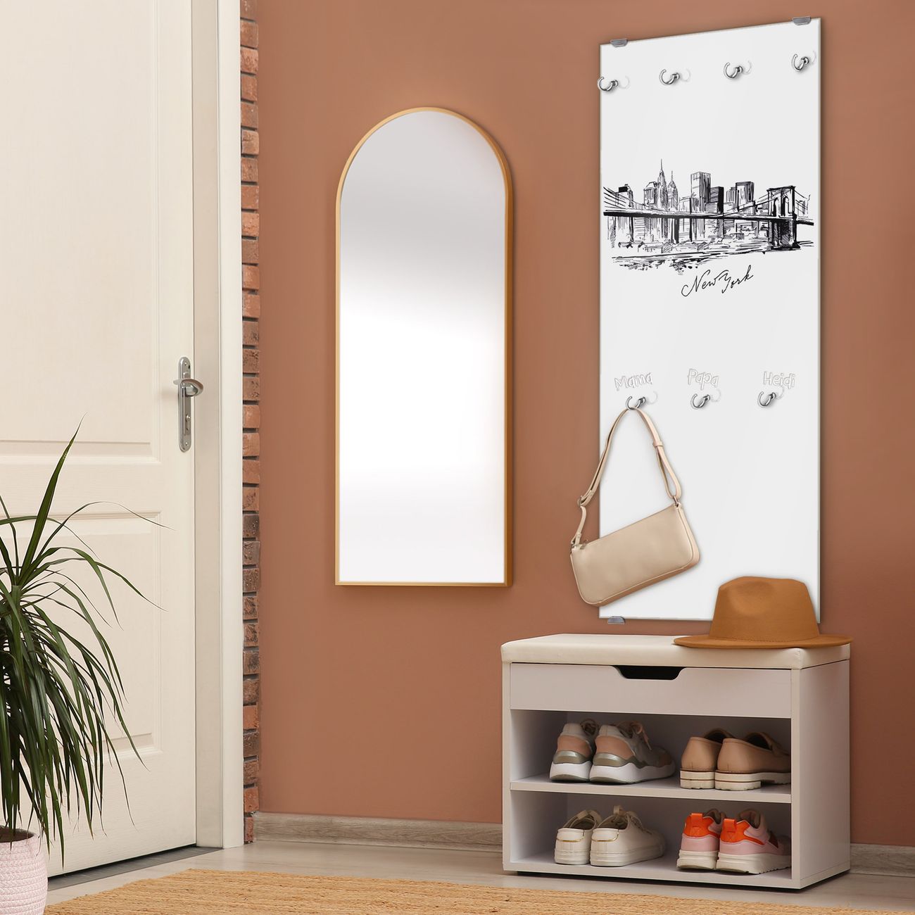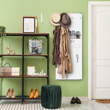 FUNKTION: Die banjado Wandgarderobe mit Motiv New York Skizze ist Ihr täglicher Begleiter. Zuverlässig hängen hier Ihre Jacken und Mäntel griffbereit. Das Echtglas ist Ihr Paneel auch beschreibbar und wieder abwischbar. DESIGN: Sie erhalten eine Garderobenleiste aus elegantem Echtglas mit dem Farbbrillanten Motiv New York Skizze hinterklebt. Das Design ist zeitlos klassisch, ohne dabei auf Funktionalität zu verzichten. Suchen Sie aus einer Vielzahl von Motiven das für Ihre Einrichtung Passende aus. DETAILS: Die Flurgarderobe besteht aus 4mm gehärtetem Sicherheitsglas. Sie ist 50cm breit, 125cm hoch und 6cm tief. Die Garderobenhaken zur Selbstmontage präsentieren sich in Edelstahl-Optik, ebenso die Abstandshalter für die Wandmontage. Ihre neue Garderobe ist sofort einsatzbereit. NUTZEN: Ihre neue Garderobe hält nicht nur zuverlässig Ihre Kleidung, sie ist auch optisch ein Blickfang. Durch das Glas können Sie an der Garderobe mit wasserlöslichen Kreidestiften oder Whiteboard-Markern auch Nachrichten hinterlassen. BANJADO: Wir sind ein kleines kreatives Team aus Sachsen und entwickeln Produkte die Design und Funktionalität verbinden sollen. Viel Freude mit Ihrer neuen Garderobe wünscht das banjado-Team!