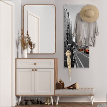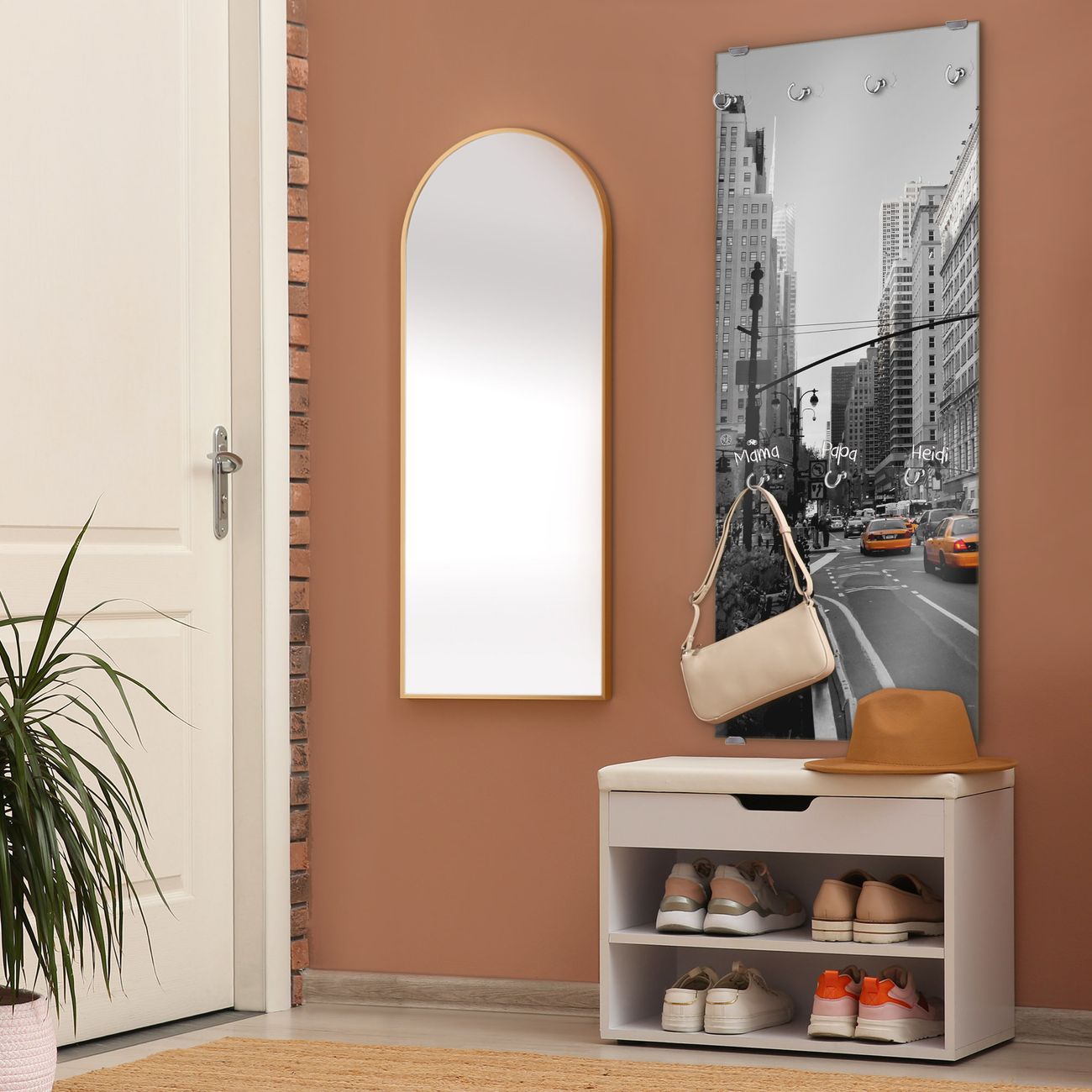 FUNKTION: Die banjado Wandgarderobe mit Motiv New York Taxi ist Ihr täglicher Begleiter. Zuverlässig hängen hier Ihre Jacken und Mäntel griffbereit. Das Echtglas ist Ihr Paneel auch beschreibbar und wieder abwischbar. DESIGN: Sie erhalten eine Garderobenleiste aus elegantem Echtglas mit dem Farbbrillanten Motiv New York Taxi hinterklebt. Das Design ist zeitlos klassisch, ohne dabei auf Funktionalität zu verzichten. Suchen Sie aus einer Vielzahl von Motiven das für Ihre Einrichtung Passende aus. DETAILS: Die Flurgarderobe besteht aus 4mm gehärtetem Sicherheitsglas. Sie ist 50cm breit, 125cm hoch und 6cm tief. Die Garderobenhaken zur Selbstmontage präsentieren sich in Edelstahl-Optik, ebenso die Abstandshalter für die Wandmontage. Ihre neue Garderobe ist sofort einsatzbereit. NUTZEN: Ihre neue Garderobe hält nicht nur zuverlässig Ihre Kleidung, sie ist auch optisch ein Blickfang. Durch das Glas können Sie an der Garderobe mit wasserlöslichen Kreidestiften oder Whiteboard-Markern auch Nachrichten hinterlassen. BANJADO: Wir sind ein kleines kreatives Team aus Sachsen und entwickeln Produkte die Design und Funktionalität verbinden sollen. Viel Freude mit Ihrer neuen Garderobe wünscht das banjado-Team!