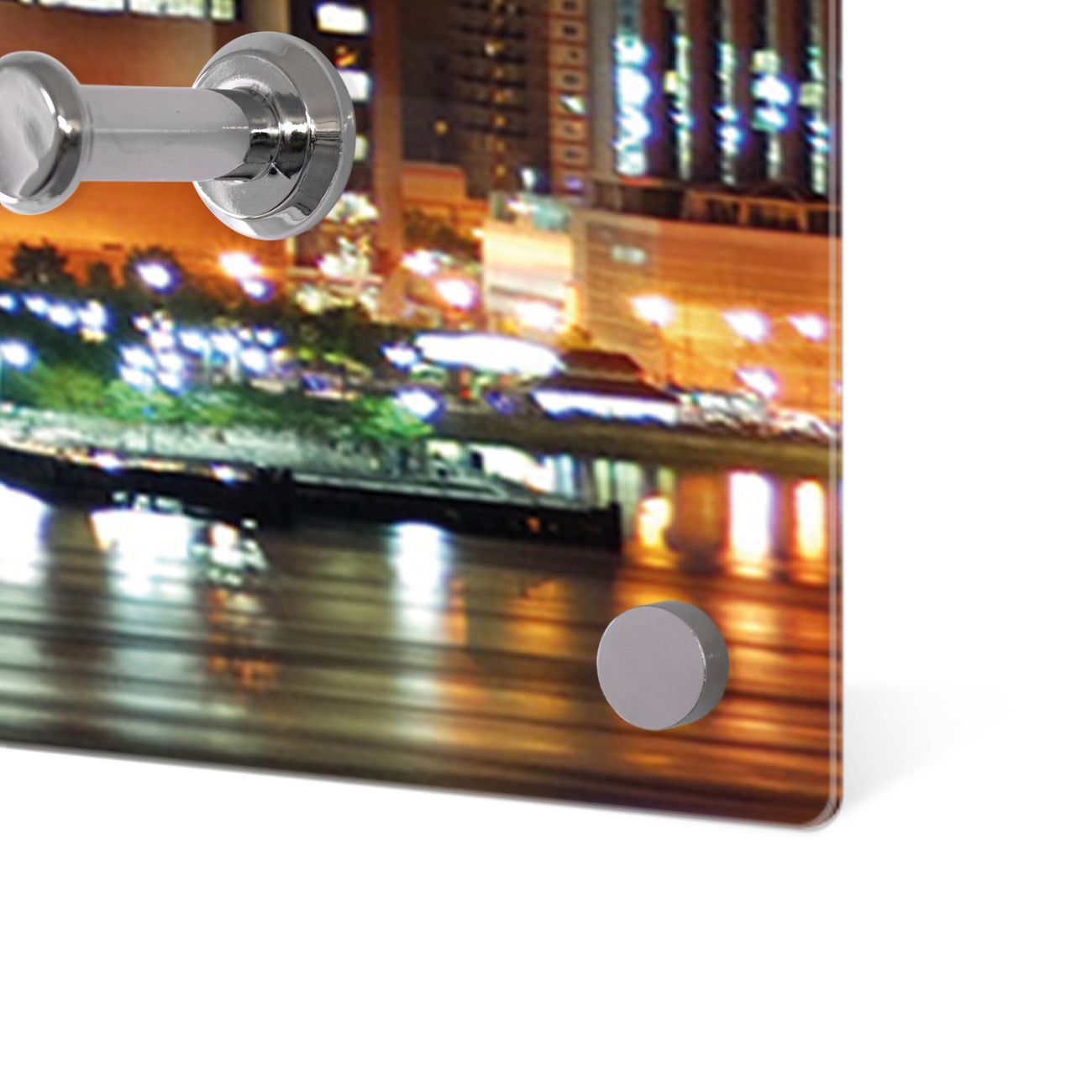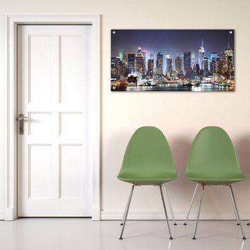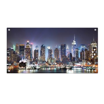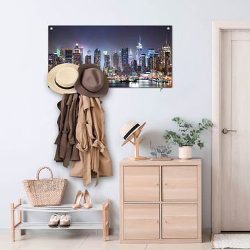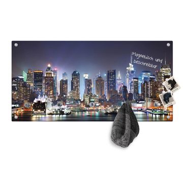 Bitte beachten Sie, dass an dieser Garderobe nur starke Neodym-Magnete halten! FUNKTION: Die banjado Wandgarderobe mit Motiv New York ist Ihr täglicher Begleiter. Zuverlässig hängen hier Ihre Jacken und Mäntel griffbereit. Gleichzeitig ist die Design Garderobe magnetisch, Sie können Notizen anheften und durch das Echtglas ist Ihr Paneel auch beschreibbar und wieder abwischbar. DESIGN: Sie erhalten eine Garderobenleiste aus elegantem Echtglas mit dem Farbbrillanten Motiv New York hinterklebt. Das Design ist zeitlos klassisch, ohne dabei auf Funktionalität zu verzichten. Suchen Sie aus einer Vielzahl von Motiven das für Ihre Einrichtung Passende aus. DETAILS: Die Flurgarderobe besteht aus 4mm gehärtetem Sicherheitsglas. Sie ist 80cm breit, 40cm hoch und 6cm tief. Die Garderobenhaken zur Selbstmontage präsentieren sich in Edelstahl-Optik, ebenso die Abstandshalter für die Wandmontage. Ihre neue Garderobe ist sofort einsatzbereit. NUTZEN: Ihre neue Garderobe hält nicht nur zuverlässig Ihre Kleidung, sie ist auch optisch ein Blickfang. Durch die magnetische Wirkung können Sie mit 4 beigefügten extrastarken Neodym-Magneten Notizen anheften und mit wasserlöslichen Kreidestiften oder Whiteboard-Markern auch Nachrichten hinterlassen. BANJADO: Wir sind ein kleines kreatives Team aus Sachsen und entwickeln Produkte die Design und Funktionalität verbinden sollen. Viel Freude mit Ihrer neuen Garderobe wünscht das banjado-Team!