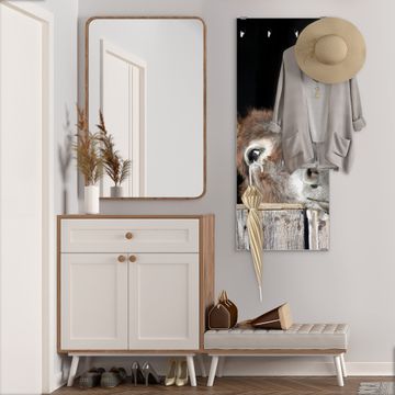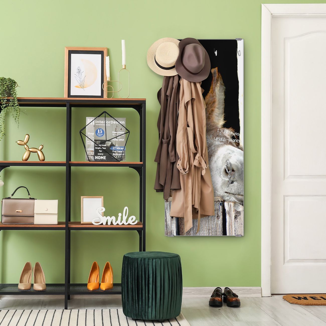 FUNKTION: Die banjado Wandgarderobe mit Motiv Nicki ist Ihr täglicher Begleiter. Zuverlässig hängen hier Ihre Jacken und Mäntel griffbereit. Das Echtglas ist Ihr Paneel auch beschreibbar und wieder abwischbar. DESIGN: Sie erhalten eine Garderobenleiste aus elegantem Echtglas mit dem Farbbrillanten Motiv Nicki hinterklebt. Das Design ist zeitlos klassisch, ohne dabei auf Funktionalität zu verzichten. Suchen Sie aus einer Vielzahl von Motiven das für Ihre Einrichtung Passende aus. DETAILS: Die Flurgarderobe besteht aus 4mm gehärtetem Sicherheitsglas. Sie ist 50cm breit, 125cm hoch und 6cm tief. Die Garderobenhaken zur Selbstmontage präsentieren sich in Edelstahl-Optik, ebenso die Abstandshalter für die Wandmontage. Ihre neue Garderobe ist sofort einsatzbereit. NUTZEN: Ihre neue Garderobe hält nicht nur zuverlässig Ihre Kleidung, sie ist auch optisch ein Blickfang. Durch das Glas können Sie an der Garderobe mit wasserlöslichen Kreidestiften oder Whiteboard-Markern auch Nachrichten hinterlassen. BANJADO: Wir sind ein kleines kreatives Team aus Sachsen und entwickeln Produkte die Design und Funktionalität verbinden sollen. Viel Freude mit Ihrer neuen Garderobe wünscht das banjado-Team!