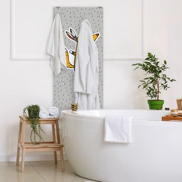 FUNKTION: Die banjado Wandgarderobe mit Motiv Nils ist Ihr täglicher Begleiter. Zuverlässig hängen hier Ihre Jacken und Mäntel griffbereit. Das Echtglas ist Ihr Paneel auch beschreibbar und wieder abwischbar. DESIGN: Sie erhalten eine Garderobenleiste aus elegantem Echtglas mit dem Farbbrillanten Motiv Nils hinterklebt. Das Design ist zeitlos klassisch, ohne dabei auf Funktionalität zu verzichten. Suchen Sie aus einer Vielzahl von Motiven das für Ihre Einrichtung Passende aus. DETAILS: Die Flurgarderobe besteht aus 4mm gehärtetem Sicherheitsglas. Sie ist 50cm breit, 125cm hoch und 6cm tief. Die Garderobenhaken zur Selbstmontage präsentieren sich in Edelstahl-Optik, ebenso die Abstandshalter für die Wandmontage. Ihre neue Garderobe ist sofort einsatzbereit. NUTZEN: Ihre neue Garderobe hält nicht nur zuverlässig Ihre Kleidung, sie ist auch optisch ein Blickfang. Durch das Glas können Sie an der Garderobe mit wasserlöslichen Kreidestiften oder Whiteboard-Markern auch Nachrichten hinterlassen. BANJADO: Wir sind ein kleines kreatives Team aus Sachsen und entwickeln Produkte die Design und Funktionalität verbinden sollen. Viel Freude mit Ihrer neuen Garderobe wünscht das banjado-Team!