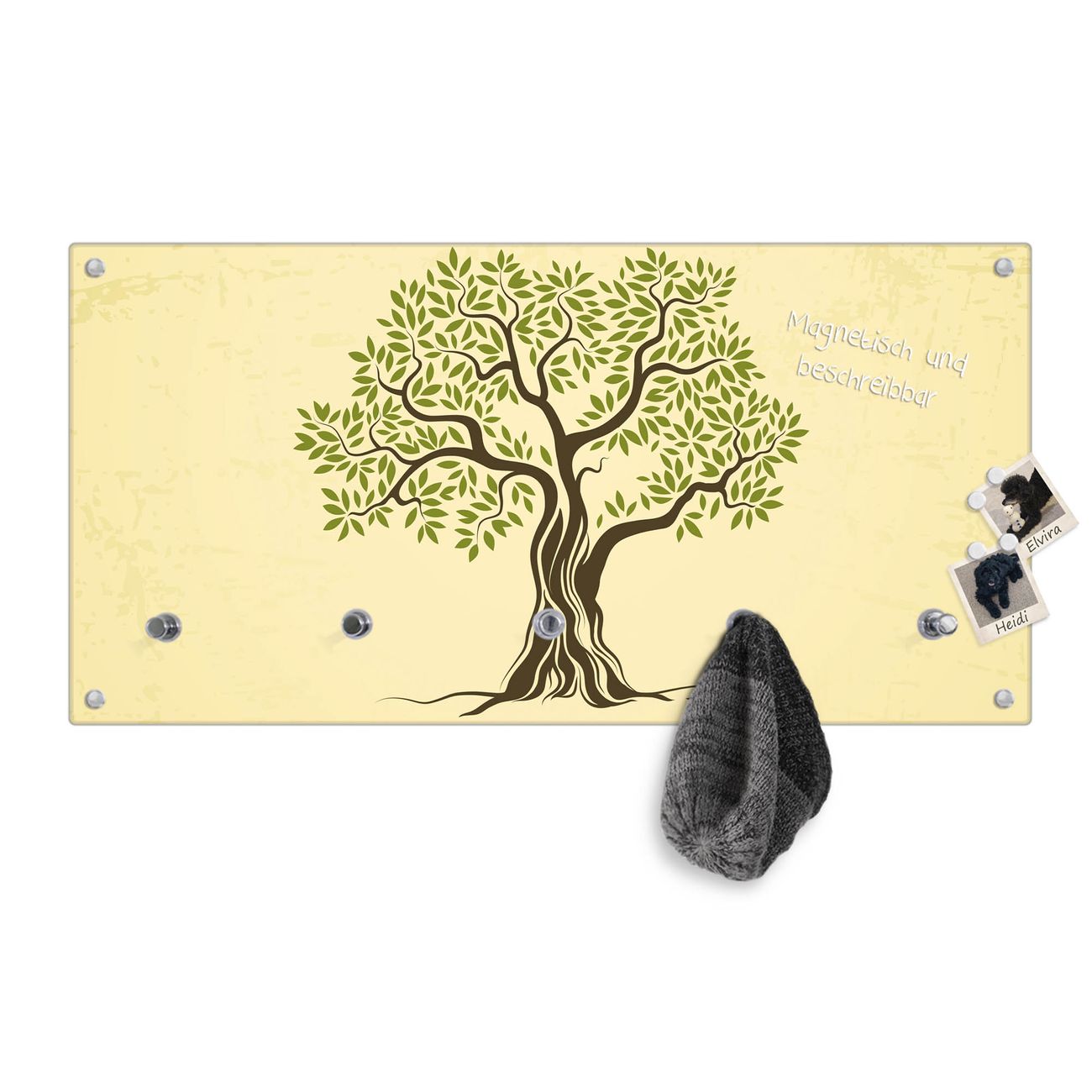 Bitte beachten Sie, dass an dieser Garderobe nur starke Neodym-Magnete halten! FUNKTION: Die banjado Wandgarderobe mit Motiv Olivenbaum ist Ihr täglicher Begleiter. Zuverlässig hängen hier Ihre Jacken und Mäntel griffbereit. Gleichzeitig ist die Design Garderobe magnetisch, Sie können Notizen anheften und durch das Echtglas ist Ihr Paneel auch beschreibbar und wieder abwischbar. DESIGN: Sie erhalten eine Garderobenleiste aus elegantem Echtglas mit dem Farbbrillanten Motiv Olivenbaum hinterklebt. Das Design ist zeitlos klassisch, ohne dabei auf Funktionalität zu verzichten. Suchen Sie aus einer Vielzahl von Motiven das für Ihre Einrichtung Passende aus. DETAILS: Die Flurgarderobe besteht aus 4mm gehärtetem Sicherheitsglas. Sie ist 80cm breit, 40cm hoch und 6cm tief. Die Garderobenhaken zur Selbstmontage präsentieren sich in Edelstahl-Optik, ebenso die Abstandshalter für die Wandmontage. Ihre neue Garderobe ist sofort einsatzbereit. NUTZEN: Ihre neue Garderobe hält nicht nur zuverlässig Ihre Kleidung, sie ist auch optisch ein Blickfang. Durch die magnetische Wirkung können Sie mit 4 beigefügten extrastarken Neodym-Magneten Notizen anheften und mit wasserlöslichen Kreidestiften oder Whiteboard-Markern auch Nachrichten hinterlassen. BANJADO: Wir sind ein kleines kreatives Team aus Sachsen und entwickeln Produkte die Design und Funktionalität verbinden sollen. Viel Freude mit Ihrer neuen Garderobe wünscht das banjado-Team!