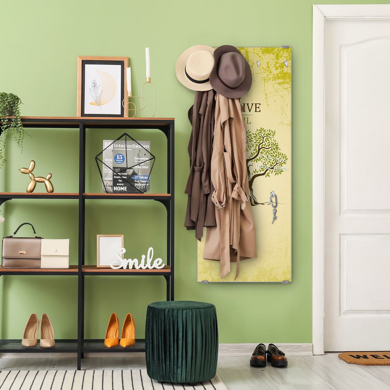 FUNKTION: Die banjado Wandgarderobe mit Motiv Olivenbaum ist Ihr täglicher Begleiter. Zuverlässig hängen hier Ihre Jacken und Mäntel griffbereit. Das Echtglas ist Ihr Paneel auch beschreibbar und wieder abwischbar. DESIGN: Sie erhalten eine Garderobenleiste aus elegantem Echtglas mit dem Farbbrillanten Motiv Olivenbaum hinterklebt. Das Design ist zeitlos klassisch, ohne dabei auf Funktionalität zu verzichten. Suchen Sie aus einer Vielzahl von Motiven das für Ihre Einrichtung Passende aus. DETAILS: Die Flurgarderobe besteht aus 4mm gehärtetem Sicherheitsglas. Sie ist 50cm breit, 125cm hoch und 6cm tief. Die Garderobenhaken zur Selbstmontage präsentieren sich in Edelstahl-Optik, ebenso die Abstandshalter für die Wandmontage. Ihre neue Garderobe ist sofort einsatzbereit. NUTZEN: Ihre neue Garderobe hält nicht nur zuverlässig Ihre Kleidung, sie ist auch optisch ein Blickfang. Durch das Glas können Sie an der Garderobe mit wasserlöslichen Kreidestiften oder Whiteboard-Markern auch Nachrichten hinterlassen. BANJADO: Wir sind ein kleines kreatives Team aus Sachsen und entwickeln Produkte die Design und Funktionalität verbinden sollen. Viel Freude mit Ihrer neuen Garderobe wünscht das banjado-Team!