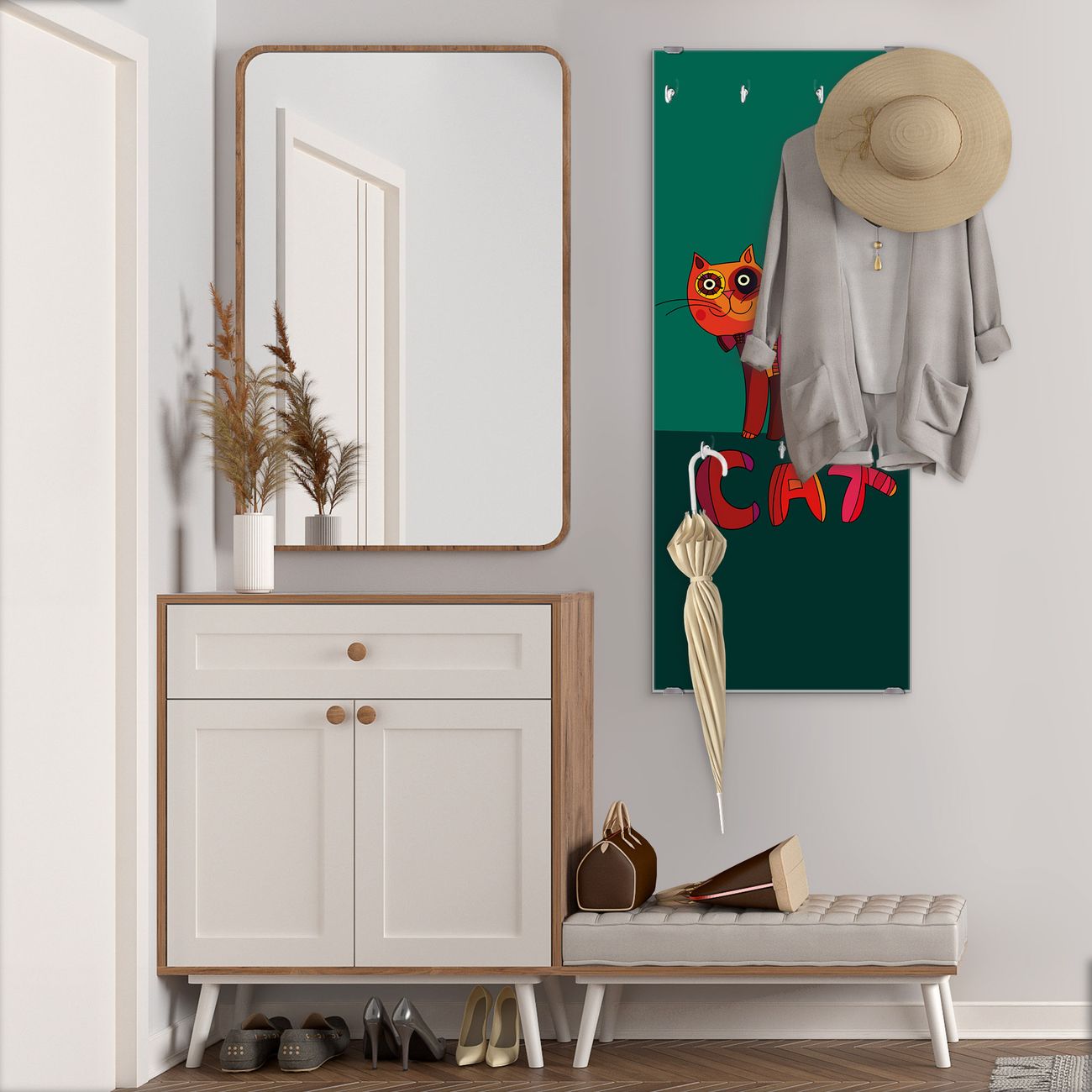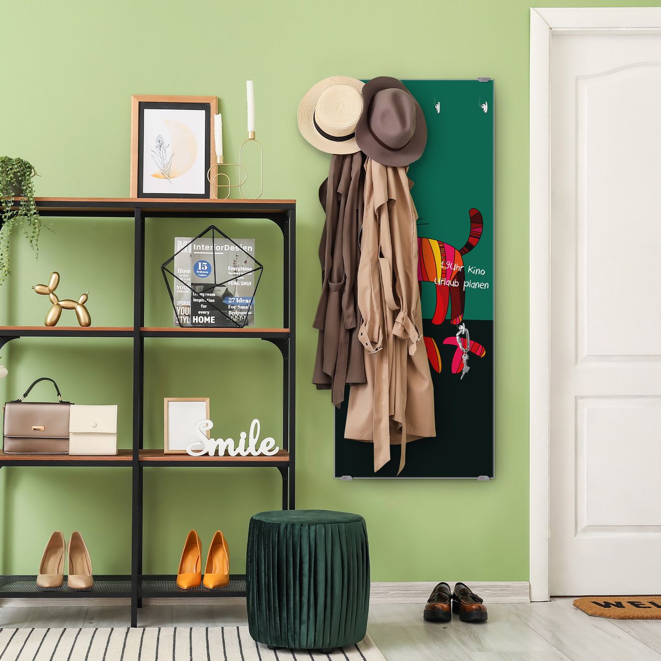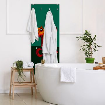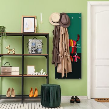 FUNKTION: Die banjado Wandgarderobe mit Motiv Orange Katze ist Ihr täglicher Begleiter. Zuverlässig hängen hier Ihre Jacken und Mäntel griffbereit. Das Echtglas ist Ihr Paneel auch beschreibbar und wieder abwischbar. DESIGN: Sie erhalten eine Garderobenleiste aus elegantem Echtglas mit dem Farbbrillanten Motiv Orange Katze hinterklebt. Das Design ist zeitlos klassisch, ohne dabei auf Funktionalität zu verzichten. Suchen Sie aus einer Vielzahl von Motiven das für Ihre Einrichtung Passende aus. DETAILS: Die Flurgarderobe besteht aus 4mm gehärtetem Sicherheitsglas. Sie ist 50cm breit, 125cm hoch und 6cm tief. Die Garderobenhaken zur Selbstmontage präsentieren sich in Edelstahl-Optik, ebenso die Abstandshalter für die Wandmontage. Ihre neue Garderobe ist sofort einsatzbereit. NUTZEN: Ihre neue Garderobe hält nicht nur zuverlässig Ihre Kleidung, sie ist auch optisch ein Blickfang. Durch das Glas können Sie an der Garderobe mit wasserlöslichen Kreidestiften oder Whiteboard-Markern auch Nachrichten hinterlassen. BANJADO: Wir sind ein kleines kreatives Team aus Sachsen und entwickeln Produkte die Design und Funktionalität verbinden sollen. Viel Freude mit Ihrer neuen Garderobe wünscht das banjado-Team!