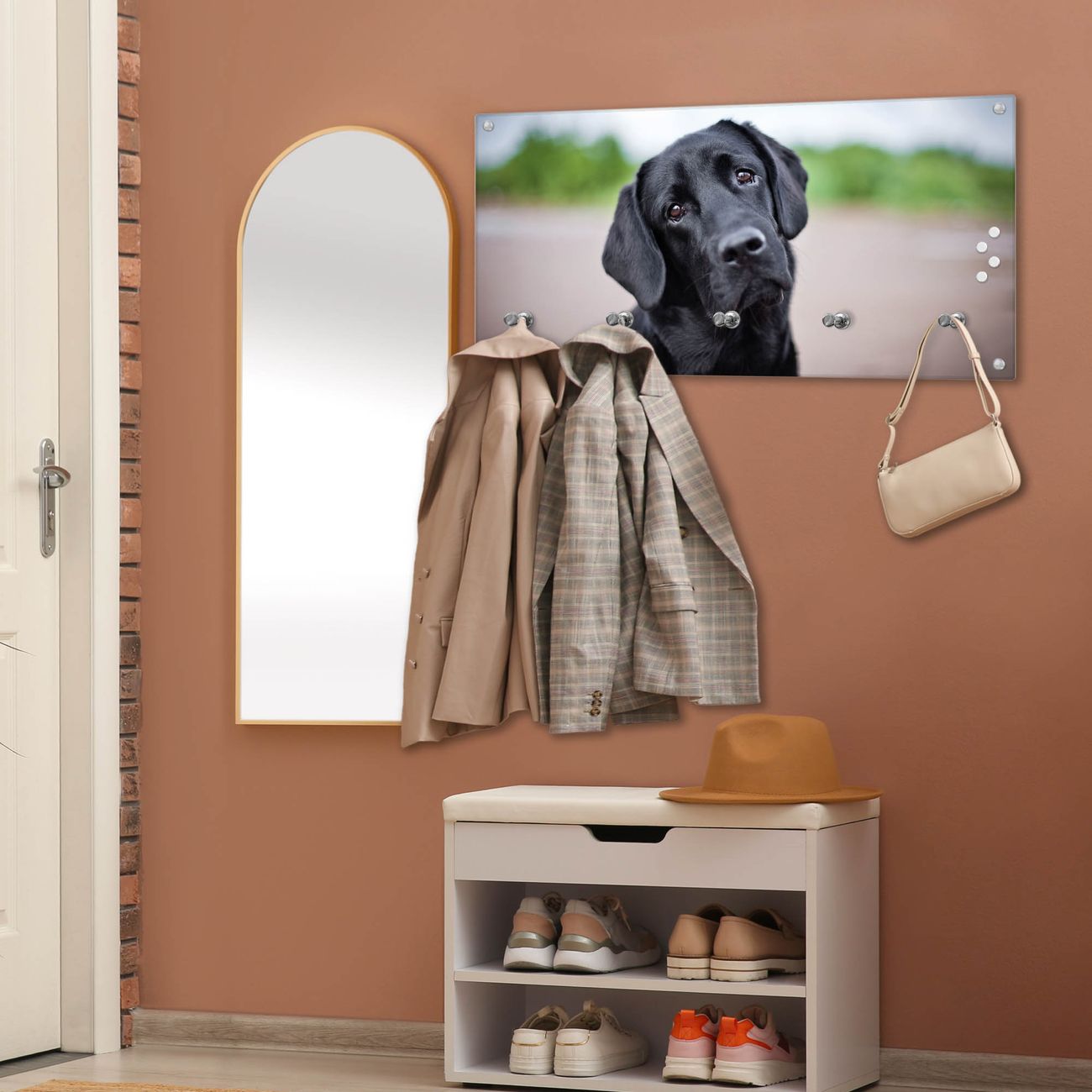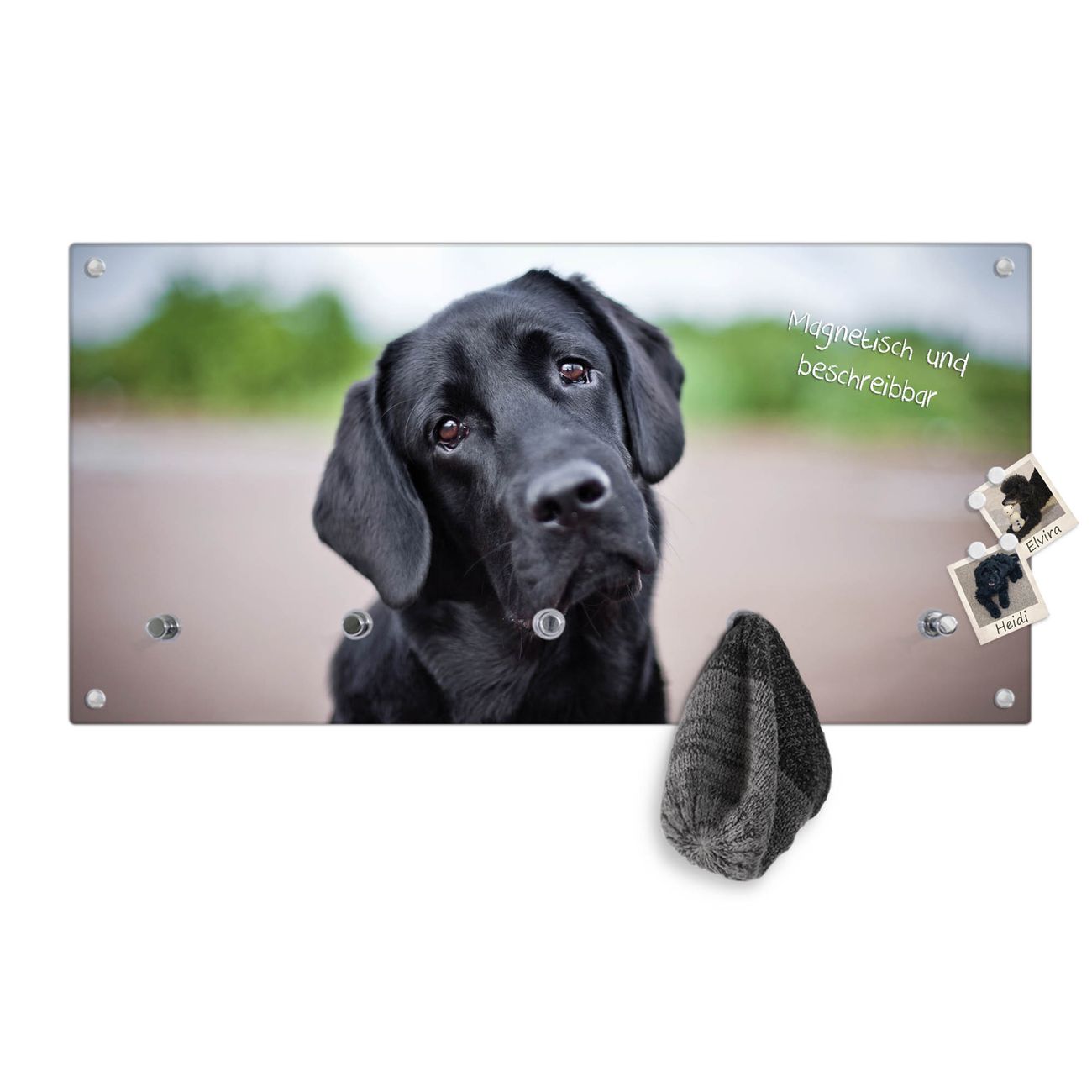 Bitte beachten Sie, dass an dieser Garderobe nur starke Neodym-Magnete halten! FUNKTION: Die banjado Wandgarderobe mit Motiv Paolo ist Ihr täglicher Begleiter. Zuverlässig hängen hier Ihre Jacken und Mäntel griffbereit. Gleichzeitig ist die Design Garderobe magnetisch, Sie können Notizen anheften und durch das Echtglas ist Ihr Paneel auch beschreibbar und wieder abwischbar. DESIGN: Sie erhalten eine Garderobenleiste aus elegantem Echtglas mit dem Farbbrillanten Motiv Paolo hinterklebt. Das Design ist zeitlos klassisch, ohne dabei auf Funktionalität zu verzichten. Suchen Sie aus einer Vielzahl von Motiven das für Ihre Einrichtung Passende aus. DETAILS: Die Flurgarderobe besteht aus 4mm gehärtetem Sicherheitsglas. Sie ist 80cm breit, 40cm hoch und 6cm tief. Die Garderobenhaken zur Selbstmontage präsentieren sich in Edelstahl-Optik, ebenso die Abstandshalter für die Wandmontage. Ihre neue Garderobe ist sofort einsatzbereit. NUTZEN: Ihre neue Garderobe hält nicht nur zuverlässig Ihre Kleidung, sie ist auch optisch ein Blickfang. Durch die magnetische Wirkung können Sie mit 4 beigefügten extrastarken Neodym-Magneten Notizen anheften und mit wasserlöslichen Kreidestiften oder Whiteboard-Markern auch Nachrichten hinterlassen. BANJADO: Wir sind ein kleines kreatives Team aus Sachsen und entwickeln Produkte die Design und Funktionalität verbinden sollen. Viel Freude mit Ihrer neuen Garderobe wünscht das banjado-Team!